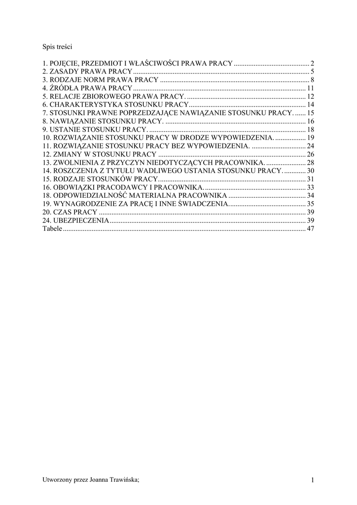 Spis treści 1. POJĘCIE, PRZEDMIOT I WŁAŚCIWOŚCI PRAWA PRACY .......................................... 2 2. ZASADY PRAWA PRACY.................................................................................................. 5 3. RODZAJE NORM PRAWA PRACY ................................................................................... 8 4. ŹRÓDŁA PRAWA PRACY................................................................................................ 11 5. RELACJE ZBIOROWEGO PRAWA PRACY. .................................................................. 12 6. CHARAKTERYSTYKA STOSUNKU PRACY................................................................. 14 7. STOSUNKI PRAWNE POPRZEDZAJĄCE NAWIĄZANIE STOSUNKU PRACY. ...... 15 8. NAWIĄZANIE STOSUNKU PRACY. .............................................................................. 16 9. USTANIE STOSUNKU PRACY. ....................................................................................... 18 10. ROZWIĄZANIE STOSUNKU PRACY W DRODZE WYPOWIEDZENIA. ................. 19 11. ROZWIĄZANIE STOSUNKU PRACY BEZ WYPOWIEDZENIA. .............................. 24 12. ZMIANY W STOSUNKU PRACY .................................................................................. 26 13. ZWOLNIENIA Z PRZYCZYN NIEDOTYCZĄCYCH PRACOWNIKA. ...................... 28 14. ROSZCZENIA Z TYTUŁU WADLIWEGO USTANIA STOSUNKU PRACY. ............ 30 15. RODZAJE STOSUNKÓW PRACY.................................................................................. 31 16. OBOWIĄZKI PRACODAWCY I PRACOWNIKA......................................................... 33 18. ODPOWIEDZIALNOŚĆ MATERIALNA PRACOWNIKA ........................................... 34 19. WYNAGRODZENIE ZA PRACĘ I INNE ŚWIADCZENIA........................................... 35 20. CZAS PRACY ................................................................................................................... 39 24. UBEZPIECZENIA............................................................................................................. 39 Tabele ....................................................................................................................................... 47 Utworzony przez Joanna Trawińska; 1 1. POJĘCIE, PRZEDMIOT I WŁAŚCIWOŚCI PRAWA PRACY 1. Cechy pracy dobrowolnie podporządkowanej (m.in. istota podporządkowania, praca skooperowana, wymóg osobistego wykonywania pracy). Co decyduje o wyróżnieniu prawa pracy. Nie wyróżnia się metodą,. Swoją metodę ma prawo publiczne, metoda władcza w prawie administracyjnym, karnym, prawo cywilne metoda cywilistyczna. Wyróżnia się przez wskazanie, że pewien wycinek rzeczywistości jest charakterystyczny i inaczej regulowany niż inne działy. Różnice pomiędzy umową o pracę a umową zlecenie czy umową o dzieło. Świadczenie nawet tej samej pracy może się odbywać w oparciu o różne podstawy i na płaszczyźnie innej gałęzi prawa. Nie ze względu że praca jest inna ale warunki jej ukształtowania są inne w prawie pracy i prawie cywilnym. Umowa cywilistyczna jest tańsza dla pracodawcy i prostsza w stosowaniu niż prawo pracy. Pojęcie pracy i właściwości pracy, która jest wykonywana przy spełnieniu większości cech to można powiedzieć że powinna być wykonywana w ramach stosunku pracy. Prawo pracy to zespół norm regulujących stosunku społeczne wynikające z wykonywania pracy dobrowolnie podporządkowanej oraz inne stosunki społeczne związane ze stosunkiem pracy. Konsekwencje wykonywania pracy dobrowolnie podporządkowanej (stosunek pracy) oraz obok mamy stosunki społeczne związane ze stosunkiem pracy. Mają rolę służebną w stos. do prawa pracy. Mniej będziemy się nimi zajmowali. 2. Stosunki prawne objęte przedmiotem prawa pracy Każda gałąź prawa to zespół norm regulujących stosunki Tym stosunkiem społecznym jest wykonywanie pracy dobrowolnie podporządkowanej. Nie wszystkie cechy muszą być spełnione aby była to praca dobrowolnie podporządkowana. Nie każdym wykonywaniem pracy prawo pracy się zajmuje. Dobrowolność relacji. Przepis nie każe, wola podmiotów decyduje. Praca jednostronnie wyznaczana. Wykonywana na rozkaz, prawo pozwala określonemu podmiotowi wydać polecenie, w które nie może ingerować ten, co tę pracę wykonuje. Skooperowana. Ma być kooperacja, czyli współdziałanie, współpraca. Muszą być co najmniej dwa podmioty. Możemy mieć do czynienia z pracą indywidualną gdy ktoś sam prowadzi działalność gospodarczą, rolnika we własnym gospodarstwie rolnym, taką pracą prawo pracy się nie zajmuje. Dopiero jeżeli ta osoba kogoś zatrudni do pomocy w tym gospodarstwie, firmie, wówczas mamy do czynienia z pracą skooperowaną, zatrudniony występował będzie w roli wykonawcy, a nie współorganizatora. Występują wtedy dwa podmioty jeden w roli organizatora, drugi wykonawcy, nie tylko zespołowość, ale muszą te dwa podmioty występować w różnych rolach. Organizacja pracy i podział ról. Praca skooperowana zawiera też określenie warunków wykonywania tej pracy. Organizator wskazuje cel pracy, daje środki, określa sposób wykonywania pracy i to wszystko co z tej pracy wynika zawłaszcza. Efekty tej pracy przyjmuje na siebie, korzyści, ale też ryzyko. W stosunku pracy pracodawca co do zasady ponosi też ryzyko zatrudniania pracownika. Ryzyko osiągnięcia bądź nie osiągnięcia celu. Część ryzyka jest przerzucona na pracownika. Pracodawca nie musi być właścicielem środków ale on nimi dysponuje (tymi maszynami), jest posiadaczem, użytkownikiem w rozumieniu prawa cywilnego. Wymóg osobistego wykonywania pracy. Podmiot który oświadcza że będzie tę pracę wykonywał orzeczenie składa w swoim imieniu, on nie ma prawa wziąć sobie do pomocy innych osób ani przysłać zastępcy. Nie jest to dopuszczalne w prawie pracy, tak jak w prawie cywilnym gdzie wymóg osobistego wykonania wynika tylko z konkretnej osoby. 
