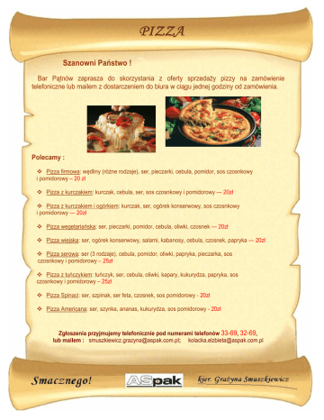 PIZZA Szanowni Państwo ! Bar Pątnów zaprasza do skorzystania z oferty sprzedaży pizzy na zamówienie telefoniczne lub mailem z dostarczeniem do biura w ciągu jednej godziny od zamówienia. Polecamy : Pizza firmowa: wędliny (różne rodzaje), ser, pieczarki, cebula, pomidor, sos czosnkowy i pomidorowy – 20 zł Pizza z kurczakiem: kurczak, cebula, ser, sos czosnkowy i pomidorowy — 20zł Pizza z kurczakiem i ogórkiem: kurczak, ser, ogórek konserwowy, sos czosnkowy i pomidorowy — 20zł Pizza wegetariańska: ser, pieczarki, pomidor, cebula, oliwki, czosnek — 20zł Pizza wiejska: ser, ogórek konserwowy, salami, kabanosy, cebula, czosnek, papryka — 20zł Pizza serowa: ser (3 rodzaje), cebula, pomidor, oliwki, papryka, pieczarka, sos czosnkowy i pomidorowy – 25zł Pizza z tuńczykiem: tuńczyk, ser, cebula, oliwki, kapary, kukurydza, papryka, sos czosnkowy i pomidorowy – 25zł Pizza Spinaci: ser, szpinak, ser feta, czosnek, sos pomidorowy - 20zł Pizza Americana: ser, szynka, ananas, kukurydza, sos pomidorowy - 20zł Zgłoszenia przyjmujemy telefonicznie pod numerami telefonów 33-69, 32-69, lub mailem : [email protected]; [email protected]