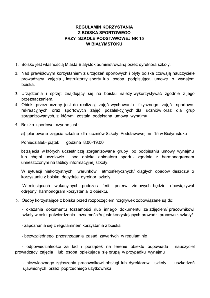 REGULAMIN KORZYSTANIA Z BOISKA SPORTOWEGO PRZY SZKOLE PODSTAWOWEJ NR 15 W BIAŁYMSTOKU 1. Boisko jest własnością Miasta Białystok administrowaną przez dyrektora szkoły. 2. Nad prawidłowym korzystaniem z urządzeń sportowych i płyty boiska czuwają nauczyciele prowadzący zajęcia , instruktorzy sportu lub osoba podpisująca umowę o wynajem boiska. 3. Urządzenia i sprzęt znajdujący się na boisku należy wykorzystywać zgodnie z jego przeznaczeniem. 4. Obiekt przeznaczony jest do realizacji zajęć wychowania fizycznego, zajęć sportoworekreacyjnych oraz sportowych zajęć pozalekcyjnych dla uczniów oraz dla grup zorganizowanych, z którymi została podpisana umowa wynajmu. 5. Boisko sportowe czynne jest : a) planowane zajęcia szkolne dla uczniów Szkoły Podstawowej nr 15 w Białymstoku Poniedziałek- piątek godzina 8.00-19.00 b) zajęcia, w których uczestniczą zorganizowane grupy po podpisaniu umowy wynajmu lub chętni uczniowie pod opieką animatora sportu- zgodnie z harmonogramem umieszczonym na tablicy informacyjnej szkoły. W sytuacji niekorzystnych warunków atmosferycznych/ ciągłych opadów deszczu/ o korzystaniu z boiska decyduje dyrektor szkoły. W miesiącach wakacyjnych, podczas ferii i przerw odrębny harmonogram korzystania z obiektu. zimowych będzie obowiązywał 6. Osoby korzystające z boiska przed rozpoczęciem rozgrywek zobowiązane są do: - okazania dokumentu tożsamości /lub innego dokumentu ze zdjęciem/ pracownikowi szkoły w celu potwierdzenia tożsamości/rejestr korzystających prowadzi pracownik szkoły/ - zapoznania się z regulaminem korzystania z boiska - bezwzględnego przestrzegania zasad zawartych w regulaminie - odpowiedzialności za ład i porządek na terenie obiektu odpowiada prowadzący zajęcia lub osoba opiekująca się grupą w przypadku wynajmu - niezwłocznego zgłoszenia pracownikowi obsługi lub dyrektorowi szkoły ujawnionych przez poprzedniego użytkownika nauczyciel uszkodzeń Za wszelkie uszkodzenia odpowiada osoba, która wyrządziła szkodę. - osoba prowadząca zajęcia – nauczyciel , instruktor jest zobowiązany do kontroli stanu technicznego boiska ( czystość, prawidłowe mocowanie bramek, koszy, innych urządzeń ) Warunkiem korzystania z obiektu jest posiadanie odpowiedniego stroju sportowego i obuwia sportowego (na boisku piłkarskim dopuszcza się obuwie typu halowego). 7. W celu zapewnienia bezpieczeństwa użytkownikom i korzystania z boiska zgodnie z jego przeznaczeniem ZABRANIA SIĘ: - użytkowania obiektu sportowego przed zapoznaniem się z regulaminem użytkowania boiska - używania butów piłkarskich z korkami oraz kolcami - wprowadzania i jazdy rowerami, motorowerami, motocyklami, wózkami dziecięcymi itp. po płycie boiska i bieżni - wprowadzania zwierząt - niszczenia urządzeń sportowych i płyty boiska - wchodzenia na ogrodzenie szkoły i urządzenia sportowe - palenia tytoniu i spożywania alkoholu - zaśmiecania, wnoszenia opakowań szklanych i metalowych, - przeszkadzania zorganizowanym grupom - zakłócania porządku i używania wulgarnych słów - przebywania na terenie osobom poniżej 12 roku życia po zmroku - przebywania na terenie boiska i wstępu na teren szkoły po godzinie 2200 -korzystania z obiektu bez zgody instruktora sportu, nauczyciela prowadzącego zajęcia lub osoby opiekującej się grupą w przypadku wynajmu 8.Dyrektor oraz pracownik obsługi szkoły nie ponoszą odpowiedzialności za rzeczy pozostawione na terenie boiska. 9. Dyrektor nie ponosi odpowiedzialności za wypadki powstałe w trakcie korzystania z obiektu przez osoby wynajmujące obiekt - odpowiedzialność ponosi osoba podpisująca umowę wynajmu lub wyznaczony opiekun grupy. Osoby przebywające na terenie obiektu sportowego i korzystające z niego w sposób niezgodny z niniejszym regulaminem na żądanie pracownika obsługi szkoły zobowiązane są do natychmiastowego zaprzestania działań niezgodnych z regulaminem i bezzwłocznego opuszczenia terenu obiektu. W przeciwnym razie będą pociągnięte do odpowiedzialności prawnej. Dyrektor Szkoły Podstawowej Nr 15 w Białymstoku Białystok, maj 2016 rok