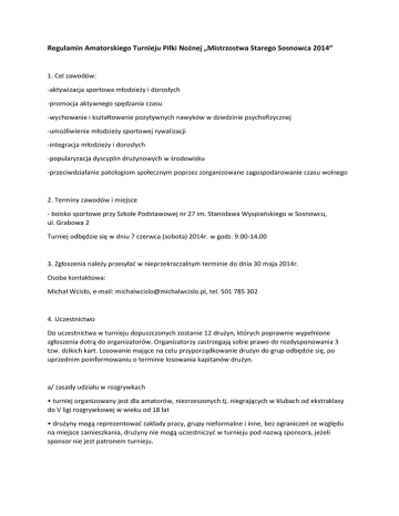 Regulamin Amatorskiego Turnieju Piłki Nożnej „Mistrzostwa Starego Sosnowca 2014” 1. Cel zawodów: -aktywizacja sportowa młodzieży i dorosłych -promocja aktywnego spędzania czasu -wychowanie i kształtowanie pozytywnych nawyków w dziedzinie psychofizycznej -umożliwienie młodzieży sportowej rywalizacji -integracja młodzieży i dorosłych -popularyzacja dyscyplin drużynowych w środowisku -przeciwdziałanie patologiom społecznym poprzez zorganizowane zagospodarowanie czasu wolnego 2. Terminy zawodów i miejsce - boisko sportowe przy Szkole Podstawowej nr 27 im. Stanisława Wyspiańskiego w Sosnowcu, ul. Grabowa 2 Turniej odbędzie się w dniu 7 czerwca (sobota) 2014r. w godz. 9.00-14.00 3. Zgłoszenia należy przesyłać w nieprzekraczalnym terminie do dnia 30 maja 2014r. Osoba kontaktowa: Michał Wcisło, e-mail: [email protected], tel. 501 785 302 4. Uczestnictwo Do uczestnictwa w turnieju dopuszczonych zostanie 12 drużyn, których poprawnie wypełnione zgłoszenia dotrą do organizatorów. Organizatorzy zastrzegają sobie prawo do rozdysponowania 3 tzw. dzikich kart. Losowanie mające na celu przyporządkowanie drużyn do grup odbędzie się, po uprzednim poinformowaniu o terminie losowania kapitanów drużyn. a/ zasady udziału w rozgrywkach • turniej organizowany jest dla amatorów, niezrzeszonych tj. niegrających w klubach od ekstraklasy do V ligi rozgrywkowej w wieku od 18 lat • drużyny mogą reprezentować zakłady pracy, grupy nieformalne i inne, bez ograniczeń ze względu na miejsce zamieszkania, drużyny nie mogą uczestniczyć w turnieju pod nazwą sponsora, jeżeli sponsor nie jest patronem turnieju. b/ warunkiem uczestnictwa jest • zgłoszenie zespołu min. 6 osobowego, a maksymalnie 8 osobowego w całości złożonego z mieszkańców Sosnowca • posiadanie przez cały czas trwania dowodu tożsamości • posiadanie ubezpieczenia przez wszystkich zawodników na wypadek nieszczęśliwych wypadków organizatorzy nie ponoszą odpowiedzialności za ewentualne szkody c/ przystąpienie drużyny do rozgrywek jest jednoznaczne z akceptacją niniejszego regulaminu 5. Sposób punktowania • zwycięstwo – 3 pkt • remis – 1 pkt • porażka – 0 pkt 6. Dyskwalifikacje • podejmuje organizator oraz sędzia prowadzący zawody • protesty przyjmowane są przez organizatora tylko podczas trwania turnieju w danym dniu • przy składaniu wniosku wnioskodawca jest zobowiązany podać dane dotyczące zawodnika, co, do którego wnosi się protest tj. imię, nazwisko, drużynę, w której występował • po zakończeniu turnieju wyniki nie podlegają weryfikacji Drużyna, która odda mecz walkowerem nie będzie miała prawa gry w następnym turnieju. 7. Nagrody i wyróżnienia • za pierwsze trzy miejsca drużyny otrzymają puchar oraz nagrody rzeczowe, • prowadzony będzie ranking na „najlepszego strzelca” 8. Postanowienia końcowe • obowiązuje obuwie sportowe na białej lub kauczukowej podeszwie • parking znajduje się przy szkole i jest niestrzeżony • wszyscy uczestnicy ubezpieczają się od następstw nieszczęśliwych wypadków we własnym zakresie; na żądanie organizatora należy je przedstawić pod rygorem nie dopuszczenia do gry • organizator nie odpowiada za rzeczy osobiste i inne pozostawione na obiekcie sportowym • rozstrzyganie spraw spornych oraz interpretacja niniejszego regulaminu należy do organizatora Skrócone przepisy gry: 1. Zasady ogólne • czas gry wynosi 8 min., bez przerwy, zmiany stron; czas odmierza sędzia 2. Zawodnicy: • drużyna liczy z rezerwowymi max 8 zawodników w turnieju • w grze bezpośrednio bierze udział 6 zawodników w tym bramkarz, • ilość zmian w trakcie meczu dowolna, zmiany tzw. hokejowe w wyznaczonej od strony trybun od strony własnej ławki rezerwowych – kara: strata piłki a. Rzuty: • bramka jest uznana, gdy piłka całym obwodem przejdzie za linię bramkową, • rzut karny wykonuje się z linii 7 m., • auty boczne wykonuje się nogą z linii boiska, • aut bramkowy bramkarz wybija nogą w obrębie własnej połowy lub wyrzuca piłkę ręką w obrębie własnej połowy. Nieprawidłowe wykonanie wyrzutu ręką skutkować będzie rzutem wolnym pośrednim z połowy boiska dla drużyny przeciwnej. • bramkę można zdobyć bezpośrednio z rzutu wolnego bezpośredniego, rozpoczęcia gry, rzutu rożnego lub dowolnego strzału samobójczego, • nie uznaje się bramki zdobytej bezpośrednio z autu bocznego i bramkowego oraz rzutu pośredniego sygnalizowanego przez sędziego przez podniesienie ręki, • odległość obrońcy od piłki podczas wykonywania rzutów i autów wynosi minimum 3 m (kara ostrzeżenia, a następnie żółta kartka) b. Gra niedozwolona: • jak w przepisach PZPN i dodatkowo zakaz stosowania tzw. wślizgów oraz ostrej walki "bark w bark". c. Kary: • za niesportowe zachowanie lub przewinienie sędzia każe zawodników jedno minutową lub dwu minutową karą • przy ukaraniu drużyny karą 2 minut, po stracie bramki w tym czasie przez tą drużynę, zawodnik wykluczony wraca do gry, wyjątek - nie liczy się, jako bramka zdobyta sytuacji gdy faul ukarany jest rzutem karnym, dopiero następna bramka upoważnia do powrotu na boisko • za zachowania brutalne i obraźliwe następuje dyskwalifikacja zawodnika i po upływie 2 minut w miejsce ukaranego może wejść rezerwowy zawodnik (nie po stracie bramki). • Ukarany zawodnik dyskwalifikacją nie ma prawa brać udziału w meczach już do końca danego turnieju, oraz zasiadać na ławce rezerwowych. d. Rozstrzygnięcia końcowe: • przy rozgrywkach grupowych mecz może kończyć się remisem i drużyny otrzymują po 1 punkcie, • przy systemie pucharowym przy remisie wykonuje się 3 rzuty karne a następnie po 1 strzale do wyłonienia zwycięzcy, • przy wygranym meczu drużyna otrzymuje 3 pkt., a przy przegranym 0 pkt., - przy walkowerze przyznaje się wynik 3:0 dla drużyny, która stawiła się na mecz