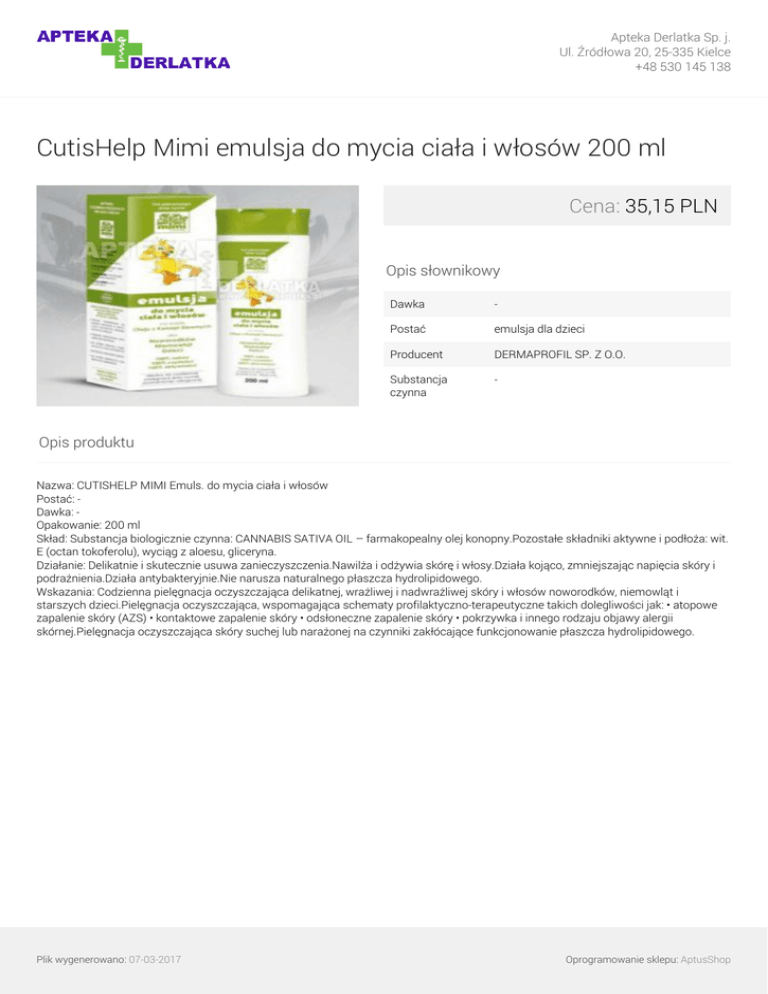 Apteka Derlatka Sp. j. Ul. Źródłowa 20, 25-335 Kielce +48 530 145 138 CutisHelp Mimi emulsja do mycia ciała i włosów 200 ml Cena: 35,15 PLN Opis słownikowy Dawka - Postać emulsja dla dzieci Producent DERMAPROFIL SP. Z O.O. Substancja czynna - Opis produktu Nazwa: CUTISHELP MIMI Emuls. do mycia ciała i włosów Postać: Dawka: Opakowanie: 200 ml Skład: Substancja biologicznie czynna: CANNABIS SATIVA OIL – farmakopealny olej konopny.Pozostałe składniki aktywne i podłoża: wit. E (octan tokoferolu), wyciąg z aloesu, gliceryna. Działanie: Delikatnie i skutecznie usuwa zanieczyszczenia.Nawilża i odżywia skórę i włosy.Działa kojąco, zmniejszając napięcia skóry i podrażnienia.Działa antybakteryjnie.Nie narusza naturalnego płaszcza hydrolipidowego. Wskazania: Codzienna pielęgnacja oczyszczająca delikatnej, wrażliwej i nadwrażliwej skóry i włosów noworodków, niemowląt i starszych dzieci.Pielęgnacja oczyszczająca, wspomagająca schematy profilaktyczno-terapeutyczne takich dolegliwości jak: • atopowe zapalenie skóry (AZS) • kontaktowe zapalenie skóry • odsłoneczne zapalenie skóry • pokrzywka i innego rodzaju objawy alergii skórnej.Pielęgnacja oczyszczająca skóry suchej lub narażonej na czynniki zakłócające funkcjonowanie płaszcza hydrolipidowego. Plik wygenerowano: 07-03-2017 Powered by TCPDF (www.tcpdf.org) Oprogramowanie sklepu: AptusShop