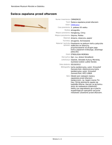Narodowe Muzeum Morskie w Gdańsku Świeca zapalana przed ołtarzem Numer inwentarza: CMM/EM/32 Tytuł: Świeca zapalana przed ołtarzem Autor: Chińczycy Czas powstania: 2. połowa XX wieku Rodzaj: etnografia Miejsce powstania: Hongkong, Chiny Miejsce pozyskania: Gdynia, Polska Materiał: drewno, stearyna, papier Technika: struganie, formowanie Materiał i technika Osadzenie na jednym końcu patyczka opisowo: wałeczka ze stearyny, przymocowanie na drugim jego końcu papierem krótszego, ukośnego patyczka. Dział: ETNOLOGIA MORSKA Darczyńca: Kpt. ż.w. Antoni Strzelbicki Lokalizacja: Gdańsk, Ośrodek Kultury Morskiej, wystawa Łodzie Ludów Świata Data dodania: 05/10/2012 Bibliografia: karta ewidencyjna, autor: Krzysztof Zamościński; elektroniczna karta ewidencyjna, autor: Krzysztof Zamościński; KPZ-1/98/A Opis: Obiekt jest rodzajem świecy zapalanej przed ołtarzem świątynnym, np. bogini morza Tin Hau. Od jej płomienia zapala się kadzidła ofiarne. Haczyk na jej końcu służy do nadawania stabilności świecy po zagrzebaniu go w piachu wypełniającym specjalne naczynie metalowe ustawione przed ołtarzem. Strona 1 z 1