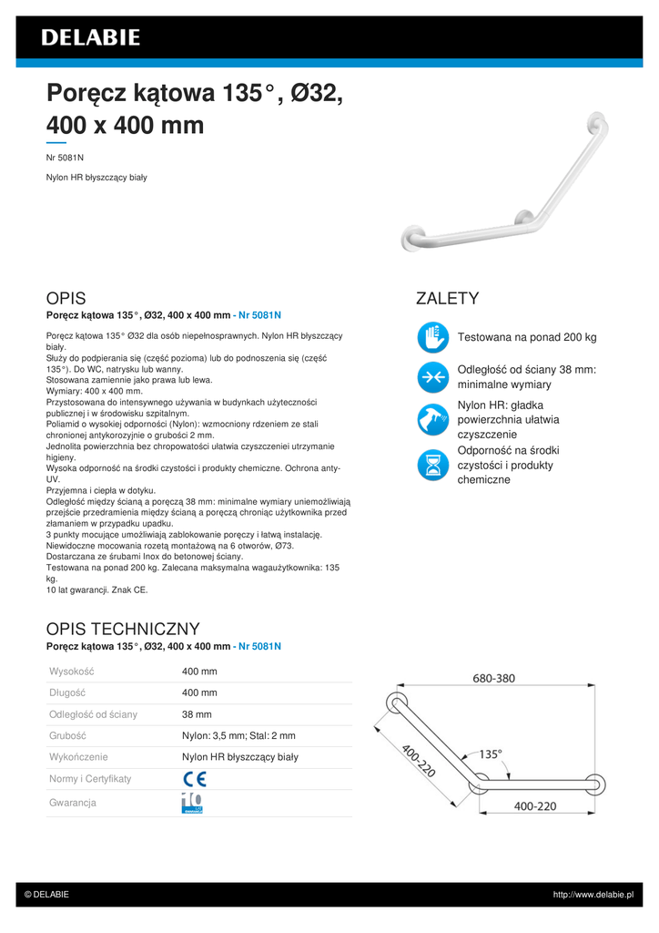 Poręcz kątowa 135°, Ø32, 400 x 400 mm Nr 5081N Nylon HR błyszczący biały OPIS ZALETY Poręcz kątowa 135°, Ø32, 400 x 400 mm - Nr 5081N Poręcz kątowa 135° Ø32 dla osób niepełnosprawnych. Nylon HR błyszczący biały. Służy do podpierania się (część pozioma) lub do podnoszenia się (część 135°). Do WC, natrysku lub wanny. Stosowana zamiennie jako prawa lub lewa. Wymiary: 400 x 400 mm. Przystosowana do intensywnego używania w budynkach użyteczności publicznej i w środowisku szpitalnym. Poliamid o wysokiej odporności (Nylon): wzmocniony rdzeniem ze stali chronionej antykorozyjnie o grubości 2 mm. Jednolita powierzchnia bez chropowatości ułatwia czyszczeniei utrzymanie higieny. Wysoka odporność na środki czystości i produkty chemiczne. Ochrona antyUV. Przyjemna i ciepła w dotyku. Odległość między ścianą a poręczą 38 mm: minimalne wymiary uniemożliwiają przejście przedramienia między ścianą a poręczą chroniąc użytkownika przed złamaniem w przypadku upadku. 3 punkty mocujące umożliwiają zablokowanie poręczy i łatwą instalację. Niewidoczne mocowania rozetą montażową na 6 otworów, Ø73. Dostarczana ze śrubami Inox do betonowej ściany. Testowana na ponad 200 kg. Zalecana maksymalna wagaużytkownika: 135 kg. 10 lat gwarancji. Znak CE. Testowana na ponad 200 kg Odległość od ściany 38 mm: minimalne wymiary Nylon HR: gładka powierzchnia ułatwia czyszczenie Odporność na środki czystości i produkty chemiczne OPIS TECHNICZNY Poręcz kątowa 135°, Ø32, 400 x 400 mm - Nr 5081N Wysokość 400 mm Długość 400 mm Odległość od ściany 38 mm Grubość Nylon: 3,5 mm; Stal: 2 mm Wykończenie Nylon HR błyszczący biały Normy i Certyfikaty Gwarancja © DELABIE http://www.delabie.pl
