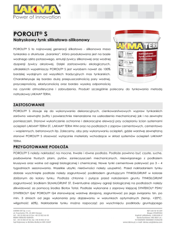 POROLIT® S Natryskowy tynk silikatowo-silikonowy POROLIT® S to najnowszej generacji silikatowo - silikonowa masa tynkarska o strukturze „baranka”, która produkowana jest na bazie wodnego szkła potasowego, emulsji żywicy silikonowej oraz wodnej dyspersji żywicy akrylowej. Dzięki zastosowaniu ekologicznych, ultralekkich wypełniaczy POROLIT® S jest wyrobem nawet do 100% bardziej wydajnym od wszystkich tradycyjnych mas tynkarskich. Charakteryzuje się bardzo dużą przepuszczalnością pary wodnej, przyczepnością, elastycznością oraz bardzo wysoką odpornością na czynniki atmosferyczne i zabrudzenia. Produkt szczególnie polecany do tynkowania metodą natryskową LAKMA® TERM. ZASTOSOWANIE POROLIT® S stosuje się do wykonywania dekoracyjnych, cienkowarstwowych wypraw tynkarskich zarówno wewnątrz (sufity i powierzchnie nienarażone na uszkodzenia mechaniczne) jak i na zewnątrz pomieszczeń. Stanowi wykończenie ochronne i dekoracyjne elewacji przy ocieplaniu ścian systemami ociepleń LAKMA® TERM ST, LAKMA® TERM WM oraz na podłożach z zapraw cementowych, cementowo – wapiennych, betonowych itp. Zalecamy, aby przy wykonywaniu ociepleń, gdzie warstwę zewnętrzną stanowi POROLIT® S stosować wyłącznie materiały wchodzące w skład systemów ociepleń LAKMA® TERM. PRZYGOTOWANIE PODŁOŻA POROLIT® S należy nakładać na mocne, trwałe i równe podłoża. Podłoże powinno być czyste, suche, pozbawione tłustych plam, pyłów, zanieczyszczeń mechanicznych, niezwiązanego z podłożem kruszywa oraz wolne od agresji biologicznej i chemicznej. Nowe tynki cementowe pokrywać po 3 – 4 tygodniach sezonowania. Wszelkie ubytki, nierówności należy uzupełnić. Przed nakładaniem tynku dobrze wyschnięte podłoże należy zagruntować podkładem gruntującym TYNKSILGRUNT w kolorze zbliżonym do koloru tynku. Podłoża chłonne i pylące przed nałożeniem gruntu TYNKSILGRUNT zagruntować środkiem SILMALGRUNT ST. Ewentualne objawy agresji biologicznej na podłożach należy zlikwidować za pomocą środka Biotox Total. Podłoże wykonane z zaprawy klejącej SYNTEKOL® PSW/ SYNTEKOL® Q4/ POROLIT® Q4 stanowiącej warstwę zbrojoną, zagruntować po jego związaniu tzn. po min. 3 dniach od jego wykonania przy dojrzewaniu w warunkach optymalnych (temp. +20°C, wilgotność 60%). Nakładanie tynku można rozpocząć po wyschnięciu podkładu gruntującego TYNKSILGRUNT tzn. po min. 24 godz. od zakończenia gruntowania przy wysychaniu w warunkach optymalnych. PRZYGOTOWANIE PRODUKTU POROLIT® S w postaci handlowej jest gotowy do użycia. Bezpośrednio przed użyciem masę należy rozcieńczyć wodą (w zależności od potrzeby, max 900 ml) i dokładnie wymieszać mieszadłem wolnoobrotowym. Nie rozcieńczać innymi produktami. Przed aplikacją sprawdzić zgodność koloru tynku z zamówieniem. SPOSÓB UŻYCIA Tynk nanosić pacą ze stali nierdzewnej lub pistoletem tynkarskim (zalecane). W przypadku nakładania pacą, masę należy nałożyć na grubość uzależnioną od grubości ziarna tynku, a następnie nadawać strukturę zacierając pacą ze stali nierdzewnej lub bardzo delikatnie pacą plastikową. Prace należy prowadzić w sposób ciągły stosując metodę łączenia „mokre na mokre”. W przypadku nakładania tynku metodą natryskową, przygotowaną masę tynkarską należy nakładać przy pomocy zestawu tynkarskiego zalecanego przez firmę LAKMA. Strumień masy rozpylać prostopadle do powierzchni ściany z odległości 30 – 45 cm. Pistolet należy prowadzić ruchem jednostajnym na powierzchni tworzącej odrębną całość. Sposób prowadzenia pistoletu powinien przebiegać ruchem okrężnym, pionowym lub poziomym. Zalecane ciśnienie w kompresorze od 3,5 – 5,0 atm. Temperatura podłoża i powietrza w czasie nakładania oraz w ciągu 24 godzin od nałożenia powinna wynosić od +5oC do +25oC. DODATKOWE INFORMACJE Tynki silikatowe oraz silikatowo – silikonowe jako najbardziej wrażliwe podczas nakładania, wymagają stałych warunków temperatury i wilgotności. Należy też unikać bezpośredniego nasłonecznienia, wysokiej wilgotności, opadów atmosferycznych i mocnego wiatru. Zwiększona wilgotność powietrza może powodować białe wybarwienia oraz odchyłki kolorów od wzorca. Ze względu na wysoką alkaliczność i zachodzące reakcje chemiczne zaleca się, aby na dużych powierzchniach elewacji stosować barwy o współczynniku jasności nie mniejszym niż 40%.Wszystkie etapy prac ociepleniowych ścian zewnętrznych zaleca się wykonać w czasie jednego sezonu. Ze względu na niejednorodność bieli składników naturalnych mogą wystąpić odchyłki odcieni. Zaleca się nabywanie masy w ilości pozwalającej na otynkowanie jednorazowo fragmentów elewacji stanowiących odrębną całość. Zaleca się stosowanie osłon chroniących przed bezpośrednim nasłonecznienie, opadami atmosferycznymi i wiatrem. Tynkowanie metodą natryskową wymaga ustawienia rusztowania od ściany w odległości min. 30 cm. Po zakończeniu prac narzędzia należy umyć wodą. Przechowywać w zamkniętych opakowaniach w temp. od +5°C do +35°C. DANE TECHNICZNE Sposób nanoszenia Agregat tynkarski STANDARD GUN lub PROFI GUN Czyszczenie narzędzi Wodą Wygląd powłoki Strukturalna, baranek Gęstość objętościowa 1,25 ± 0,05 g/cm3 Konsystencja 10,5 ± 1,0 cm Właściwa ilość wody 300 do 900 ml/ 25 kg Czas schnięcia 8 do 12 godzin Czas pełnego utwardzenia ok. 7 dni Temperatura stosowania +5oC do +25oC Kolor 53 kolory LAKMA, 200 kolorów NCS, kolory niestandardowe na zamówienie Wydajność grubość ziarna (metoda natryskowa) 1,5 mm 2,0 mm 1,20 – 1,40 kg/m2 1,45 – 1,60 kg/m2 Dane techniczne podane są dla temperatury +20oC i wilgotności względnej powietrza 60%. INFORMACJE LOGISTYCZNE Pojemność opakowania jednostkowego Ilość sztuk w opakowaniu zbiorczym Ilość opakowań na palecie Waga pełnej palety 25 kg nd 24 600 kg SKŁADOWANIE 18 miesięcy od d