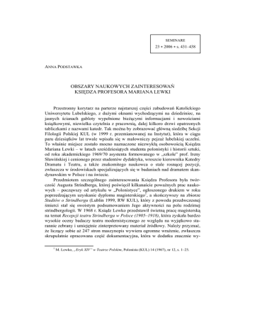 SEMINARE 23 * 2006 * s. 431–438 ANNA PODSTAWKA OBSZARY NAUKOWYCH ZAINTERESOWAŃ KSIĘDZA PROFESORA MARIANA LEWKI Przestronny korytarz na parterze najstarszej części zabudowań Katolickiego Uniwersytetu Lubelskiego, z dużymi oknami wychodzącymi na dziedziniec, na jasnych ścianach gabloty wypełnione bieżącymi informacjami i nowościami książkowymi, niewielka czytelnia z pracownią, dalej kilkoro drzwi opatrzonych tabliczkami z nazwami katedr. Tak można by zobrazować główną siedzibę Sekcji Filologii Polskiej KUL (w 1999 r. przemianowanej na Instytut), która w ciągu paru dziesiątków lat trwale wpisała się w malowniczy pejzaż lubelskiej uczelni. To właśnie miejsce zostało mocno naznaczone niezwykłą osobowością Księdza Mariana Lewki – w latach sześćdziesiątych studenta polonistyki i historii sztuki, od roku akademickiego 1969/70 asystenta formowanego w „szkole” prof. Ireny Sławińskiej i cenionego przez studentów dydaktyka, wreszcie kierownika Katedry Dramatu i Teatru, a także znakomitego naukowca o stale rosnącej pozycji, zwłaszcza w środowiskach specjalizujących się w badaniach nad dramatem skandynawskim w Polsce i na świecie. Przedmiotem szczególnego zainteresowania Księdza Profesora była twórczość Augusta Strindberga, której poświęcił kilkanaście poważnych prac naukowych – począwszy od artykułu w „Polonistyce”, ogłoszonego drukiem w roku poprzedzającym uzyskanie dyplomu magisterskiego1, a skończywszy na zbiorze Studiów o Strindbergu (Lublin 1999, RW KUL), który z powodu przedwczesnej śmierci stał się swoistym podsumowaniem Jego aktywności na polu rodzimej strindbergologii. W 1968 r. Ksiądz Lewko przedstawił świetną pracę magisterską na temat Recepcji teatru Strindberga w Polsce (1905–1918), która zyskała bardzo wysokie oceny badaczy teatru modernistycznego ze względu na wyjątkowo starannie zebrany i umiejętnie zinterpretowany materiał źródłowy. Należy przyznać, że liczący sobie aż 247 stron maszynopis wywiera ogromne wrażenie, zwłaszcza skrupulatnie opracowana część dokumentacyjna, która w dodatku znacznie wy1 M. Lewko, „Eryk XIV” w Teatrze Polskim, Polonista (KUL) 14 (1967), nr 12, s. 1–23. ANNA PODSTAWKA 432 kracza poza okres Młodej Polski. W bibliograficznym wykazie źródeł wymienione zostały pozycje wydane drukiem do 1967 r. (m.in. programy teatralne, artykuły i recenzje prasowe); osobny dział stanowią niepublikowane materiały archiwalne, wywiady i korespondencja. Niezwykle cennym dodatkiem jest 70-stronicowe kalendarium wystawień sztuk na scenach całej Polski, sporządzone w wersji rozszerzonej. Potwierdzeniem dużej wartości przedstawionej pracy była zarówno całościowa publikacja w KUL (na łamach „Roczników Humanistycznych” 19 (1971), z. 4), jak i skrót zaprezentowany – wspólnie z jej promotorką, prof. I. Sławińską – w artykule Strindberg och den polska teatern, ogłoszonym w szwedzkim czasopiśmie naukowym „Meddelanden från Strindbergssällskapet” (Stockholm 1970, nr 44). Te pierwsze odkrywcze teksty zyskały rangę poważnego wkładu w badania nad recepcją Strindberga, o czym świadczyć też może zaproszenie do uczestnictwa w międzynarodowym sympozjum Strindbergowskim w Sztokholmie, jakie w 1973 r.2 Ksiądz Lewko otrzymał wraz z prof. Sławińską. Fascynacja twórczością wielkiego Skandynawa stale towarzyszyła asystentowi w Katedrze Dramatu i Teatru KUL, cenionemu już znawcy teatru w Polsce. Jego uwaga, dotychczas skupiona wokół zagadnień recepcji Strindberga i jego wpływu na kształt rodzimego teatru modernistycznego, przeniosła się następnie na bogaty dorobek sceniczny i śmiałe koncepcje teatralne, jakie autor Ojca wprowadził do świadomości teatralnej w Szwecji i na świecie. W 1984 r. Ksiądz Lewko uzyskał stopień doktora na podstawie obszernej pracy O dramacie i teatrze Strindberga (Lublin 1983, ss. 269 + XXV, maszynopis w Bibliotece Uniwersyteckiej KUL), w której wykazał się biegłością w analizie struktury tekstu dramatycznego oraz gruntowną wiedzą z zakresu europejskich modeli teatralnych. W celu uzasadnienia postawionych przez siebie tez sięgał do wielu źródeł, wnikliwie analizował eseje i publikacje prasowe Strindberga, zapoznał się ze znaczną ilością materiałów biograficznych, uwzględnił jego bogate doświadczenia teatralne. Zgłębiając spuściznę pisarza, Ksiądz Lewko starał się odkrywać jej nowe aspekty, z godną podziwu dociekliwością poruszał się w obszarach słabo spenetrowanych we wcześniej ogłoszonych opracowaniach. Ukoronowaniem tej wieloletniej pracy badawczej stały się wspomniane Studia o Strindbergu, wpisujące się w światowe obchody 150. rocznicy urodzin artysty. Warto dodać, że publikacji tej towarzyszyło międzynarodowe sympozjum August Strindberg – literatura szwedzka, które jako kierownik Katedry Dramatu i Teatru KUL zorganizował przy współpracy Instytutu Szwedzkiego w Sztokholmie i Uniwersytetu w Dalarna 16 października 1999 r. w Bibliotece Uniwersyteckiej KUL. Zaproszeni referenci i licznie zgromadzeni słuchacze mieli wówczas okazję poznać ostatnią książkę Profesora, będącą udaną pró- 2 Niemiecki tekst referatu M. Lewki, traktujący o recepcji teatralnych teorii artysty w Polsce (Rezeption der theatralischen Theorie Strindbergs in Polen), ukazał się drukiem w tomie materiałów pokonferencyjnych Strindberg and Modern Theatre, Strindbergssällskapet Stockholm 1975, s. 151–162. OBSZARY NAUKOWYCH ZAINTERESOWAŃ KS. M. LEWKI 433 bą wszechstronnego spojrzenia na twórczość pisarza, interesującą nie tylko dla teatrologów i literaturoznawców. Część z zamieszczonych w niej szkiców była wcześniej publikowana, lecz w znacznie skromniejszych wersjach. Rozszerzone i uzupełnione o nowe fakty, dały całościowy obraz podejmowanych zagadnień. Treść tej niezwykle ważnej pozycji w polskiej strindbergologii stanowi od