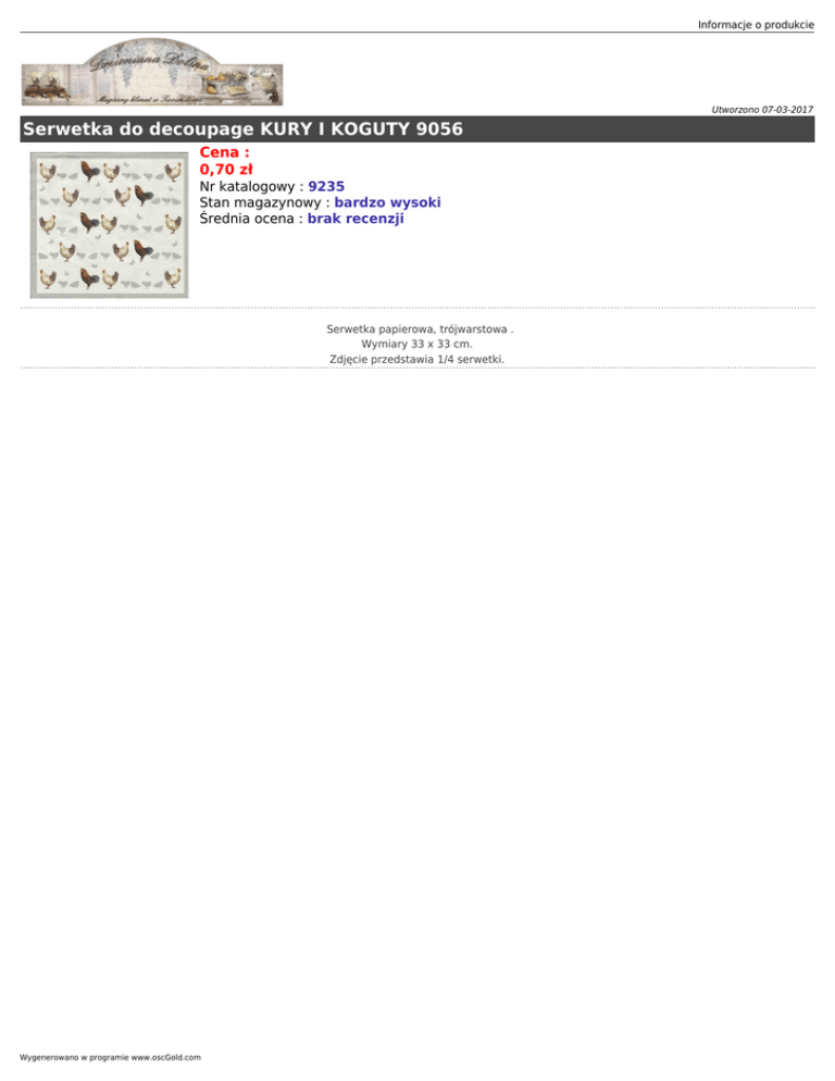 Informacje o produkcie Utworzono 07-03-2017 Serwetka do decoupage KURY I KOGUTY 9056 Cena : 0,70 zł Nr katalogowy : 9235 Stan magazynowy : bardzo wysoki Średnia ocena : brak recenzji Serwetka papierowa, trójwarstowa . Wymiary 33 x 33 cm. Zdjęcie przedstawia 1/4 serwetki. Wygenerowano w programie www.oscGold.com