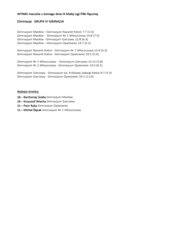 WYNIKI meczów z ósmego dnia IX Małej Ligi Piłki Ręcznej Eliminacje GRUPA IV GIMNAZJA Gimnazjum Masłów – Gimnazjum Nazaret Kielce 7:7 (1:4) Gimnazjum Masłów - Gimnazjum Nr 1 Włoszczowa 14:8 (7:5) Gimnazjum Masłów - Gimnazjum Szerzawy 12:8 (6:3) Gimnazjum Masłów – Gimnazjum Opatowiec 14:7 (5:2) Gimnazjum Nazaret Kielce - Gimnazjum Nr 1 Włoszczowa 13:4 (5:3) Gimnazjum Nazaret Kielce - Gimnazjum Opatowiec 10:5 (5:4) Gimnazjum Nr 1 Włoszczowa - Gimnazjum Szerzawy 13:12 (5:8) Gimnazjum Nr 1 Włoszczowa - Gimnazjum Opatowiec 14:5 (6:1) Gimnazjum Szerzawy - Gimnazjum św. Królowej Jadwigi Kielce 9:7 (5:3) Gimnazjum Szerzawy - Gimnazjum Opatowiec 18:1 (11:0) Najlepsi strzelcy: 18 – Bartłomiej Gołda Gimnazjum Masłów 16 – Krzysztof Wiecha Gimnazjum Szerzawy 12 – Piotr Ryba Gimnazjum Opatowiec 11 – Michał Ślęzak Gimnazjum Nr 1 Włoszczowa