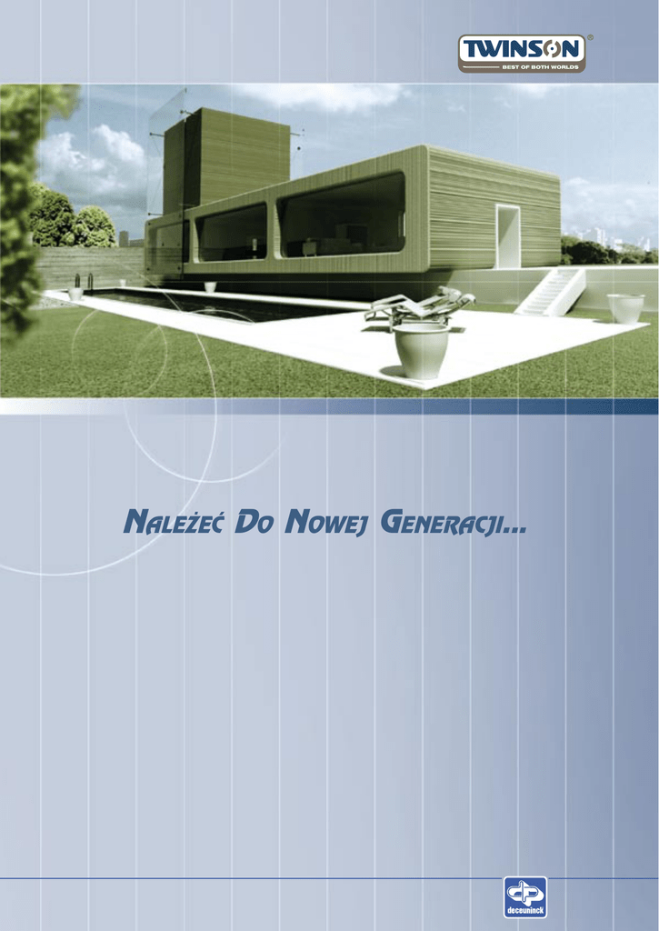NALEŻEĆ DO NOWEJ GENERACJI... KROK NAPRZÓD... Jako światowy lider w produkcji profili PVC, Deceuninck ciągle inwestuje w badania i rozwój nowych technologii. Dzięki wiedzy zdobytej przez wiele lat działalności, dzisiaj możemy poszerzać nasze horyzonty. Zaangażowani w szeroko rozumiany rynek materiałów budowlanych, stawiamy na dostarczanie klientom nowych produktów i poszukiwanie nieznanych dotychczas pól ich wykorzystania. Podczas wprowadzania nowych technologii, żadne wyzwanie nie jest zbyt wielkie. W szybko zmieniającym się świecie i przy rosnących wymaganiach klientów odnośnie jakości, oferujemy rozwiązania przyszłości już dziś – w ten sposób Deceuninck jest zawsze jeden krok przed konkurencją. Twinson® to wynik strategii firmy Deceuninck opartej na ciągłej modernizacji. Ten rewolucyjny materiał łączy zalety drewna i PVC. Dzięki czemu klienci otrzymują wszystko, co najlepsze z obu światów: tradycję i nowoczesność, siłę natury i zaawansowanie technologiczne – co przekłada się wyłącznie na korzyści: z Twinson® także Ty jesteś krok naprzód. TRADYCJA I INNOWACJA Deceuninck to ponad czterdzieści lat doświadczeń technologii Twinson®. Dzięki prowadzonym bez przerwy w rozwoju i produkcji profili PVC dla branży budowlanej. badaniom jesteśmy światowym liderem w łączeniu drewna Nie bez przyczyny nasza dewiza brzmi „z pasją do i PVC. Tak również powstał trwały i elastyczny materiał doskonałości“ – tworząc nasze produkty używamy tylko posiadający zalety obu jego składników, znany jako najlepszych materiałów. Ogromne doświadczenie i dokładna Twinson®. selekcja surowców to gwarancja, że Twinson® spełnia nawet najsurowsze wymagania odnośnie jakości. Twinson® pozwala urzeczywistnić nawet najbardziej śmiałe wizje, spełniając przy tym wszystkie surowe wymagania. Częścią naszego dążenia do doskonałości jest nieustanne Oznacza to, że dzięki Twinson® architekci mogą rozwinąć inwestowanie skrzydła, a Ty oferujesz swoim klientom innowacyjne w nowe rozwiązania. Właśnie dlatego Deceuninck poświęcił ponad dwa lata na opracowanie rozwiązania, na które czekają. BADANIA W L ABORATORIACH DECEUNINCK <<< >>> TECHNOLOGIA, SIŁA NAPĘDOWA DECEUNINCK NATURA I TECHNOLOGIA Natura jest naszą inspiracją, technologia – siłą napędową. Twinson® zawiera sosnę rosnącą szybko w miejscach, Ciepło które mogą być zalesiane na nowo. W ten sposób Twinson® naturalnych materiałów daje nam niezbędne bezpieczeństwo, a technologia dostarcza rozwiązań, na wspiera gospodarkę zasobami leśnymi. które czekamy. Twinson® łączy naturę i technologię, to fuzja materiałów, które W Deceuninck wykorzystujemy technologię z respektem z pozoru do siebie nie pasują, a pozwoliły uzyskać produkt dla natury. Twinson® może być w 100% poddany o wielu zastosowaniach. Produkt, który pogodzi miłośników recyklingowi – jest przyjazną środowisku alternatywą dla natury i zwolenników nowinek technologicznych. egzotycznego drewna. Podczas gdy twarde drewno może być pozyskiwane tylko z zagrożonych lasów tropikalnych, DREWNO I PVC, NAJLEPSZE Z DWÓCH ŚWIATÓW + + + DREWNO + Łącząc drewno z PVC, Twinson® łączy tradycję Twinson® to nowy materiał z nieograniczonymi możliwościami: z nowoczesnością, siłę natury z najnowszymi osiągnięciami od czystego, prostego wzornictwa do wyszukanych technologii. geometrycznych kształtów. Twinson® daje Ci wszystko, co najlepsze z obu światów Technologia Twinson® jest znakomitą alternatywą dla – naturalny wygląd i wrażenie ciepła oraz wytrzymałość drewna. WYTRZYMAŁE i łatwość utrzymania PVC. PRZYJAZNE ŚRODOWISKU SOLIDNE DAJE WRAŻENIE CIEPŁA MA NATURALNY WYGLĄD DREWNO Stosuje się ogólne warunki gwarancji. + + + + WODOODPORNY NIE PORASTA MCHEM TRWAŁY ŁATWY PVC P VC W UTRZYMANIU ODPORNY NA INSEKTY BEZ DRZAZG NIE WYPACZA SIĘ POLICHLOREK WINYLU DANE TECHNICZNE MATERIAŁU TWINSON przykład 50% pvc - 50% drewna TEST METODA GĘSTOŚĆ ISO 1183-1 WŁAŚCIWOŚCI PRZY ROZCIĄGANIU ISO 527/1B WARTOŚĆ JEDNOSTKA metoda A 1,398 kg/m3 moduł sprężystości 6019 MPa 35,95 MPa wytrzymałość wydłużenie przy zerwaniu TWARDOŚĆ W SKALI BRINELLA EN 1534 3kN NASIĄKLIWOŚĆ EN 317 24 uur ISO 178 moduł sprężystości WŁAŚCIWOŚCI PRZY ZGINANIU ODPORNOŚĆ NA ŚRODOWISKO GNILNE ORAZ GRZYBY 0,90 % 174 MPa stopień spęcznienia 1,44 % przyrost wagi 1,06 % w osi wytłaczania 5855 MPa wytrzymałość w osi wytłaczania 65,59 MPa wydłużenie przy zerwaniu w osi wytłaczania 1,30 % Klasa trwałości 1 klasa prCEN/TS 15534-1 Annex E LINIOWA ROZSZERZALNOŚĆ TERMICZNA w osi wytłaczania ISO 11359-2 0,023 mm/m°C prostopadle do osi wytłaczania 0,048 mm/m°C grubość 0,084 mm/m°C REAKCJA NA OGIEŃ ISO 4589-2 LOI 26,7 % TEMPERATURA VICAT ISO306 metoda B50 90,1 °C 01/06 83361 - 9000 - 8108 www.twinson.net Zawartość tego dokumentu, materiał fotograficzny i specyfikacja techniczna są wyłączną własnością Deceuninck NV. Wszystkie prawa zastrzeżone. Materiał nie może być powielany, w całości lub w części, bez naszej zgody. Stosuje się ustalone terminy dostaw i warunki sprzedaży, kopia dostępna na życzenie.