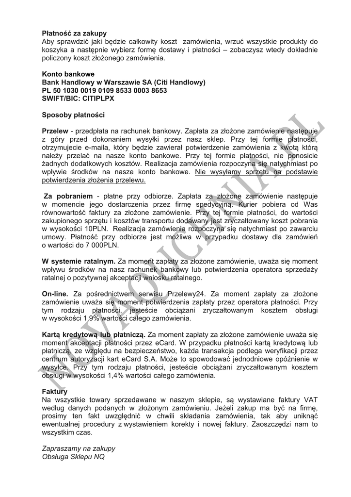Płatność za zakupy Aby sprawdzić jaki będzie całkowity koszt zamówienia, wrzuć wszystkie produkty do koszyka a następnie wybierz formę dostawy i płatności – zobaczysz wtedy dokładnie policzony koszt złożonego zamówienia. Konto bankowe Bank Handlowy w Warszawie SA (Citi Handlowy) PL 50 1030 0019 0109 8533 0003 8653 SWIFT/BIC: CITIPLPX Sposoby płatności Przelew - przedpłata na rachunek bankowy. Zapłata za złożone zamówienie następuje z góry przed dokonaniem wysyłki przez nasz sklep. Przy tej formie płatności, otrzymujecie e-maila, który będzie zawierał potwierdzenie zamówienia z kwotą którą należy przelać na nasze konto bankowe. Przy tej formie płatności, nie ponosicie żadnych dodatkowych kosztów. Realizacja zamówienia rozpoczyna się natychmiast po wpływie środków na nasze konto bankowe. Nie wysyłamy sprzętu na podstawie potwierdzenia złożenia przelewu. Za pobraniem - płatne przy odbiorze. Zapłata za złożone zamówienie następuje w momencie jego dostarczenia przez firmę spedycyjną. Kurier pobiera od Was równowartość faktury za złożone zamówienie. Przy tej formie płatności, do wartości zakupionego sprzętu i kosztów transportu dodawany jest zryczałtowany koszt pobrania w wysokości 10PLN. Realizacja zamówienia rozpoczyna się natychmiast po zawarciu umowy. Płatność przy odbiorze jest możliwa w przypadku dostawy dla zamówień o wartości do 7 000PLN. W systemie ratalnym. Za moment zapłaty za złożone zamówienie, uważa się moment wpływu środków na nasz rachunek bankowy lub potwierdzenia operatora sprzedaży ratalnej o pozytywnej akceptacji wniosku ratalnego. On-line. Za pośrednictwem serwisu Przelewy24. Za moment zapłaty za złożone zamówienie uważa się moment potwierdzenia zapłaty przez operatora płatności. Przy tym rodzaju płatności, jesteście obciążani zryczałtowanym kosztem obsługi w wysokości 1,9% wartości całego zamówienia. Kartą kredytową lub płatniczą. Za moment zapłaty za złożone zamówienie uważa się moment akceptacji płatności przez eCard. W przypadku płatności kartą kredytową lub płatniczą, ze względu na bezpieczeństwo, każda transakcja podlega weryfikacji przez centrum autoryzacji kart eCard S.A. Może to spowodować jednodniowe opóźnienie w wysyłce. Przy tym rodzaju płatności, jesteście obciążani zryczałtowanym kosztem obsługi w wysokości 1,4% wartości całego zamówienia. Faktury Na wszystkie towary sprzedawane w naszym sklepie, są wystawiane faktury VAT według danych podanych w złożonym zamówieniu. Jeżeli zakup ma być na firmę, prosimy ten fakt uwzględnić w chwili składania zamówienia, tak aby uniknąć ewentualnej procedury z wystawieniem korekty i nowej faktury. Zaoszczędzi nam to wszystkim czas. Zapraszamy na zakupy Obsługa Sklepu NQ