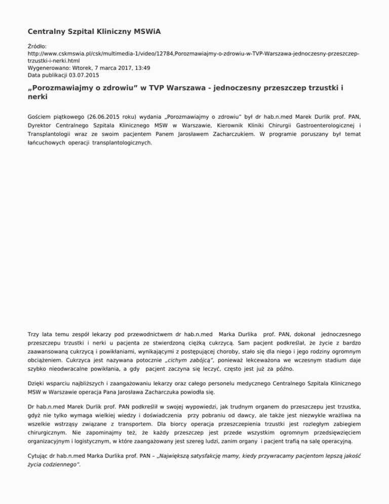 Centralny Szpital Kliniczny MSWiA Źródło: http://www.cskmswia.pl/csk/multimedia-1/video/12784,Porozmawiajmy-o-zdrowiu-w-TVP-Warszawa-jednoczesny-przeszczeptrzustki-i-nerki.html Wygenerowano: Wtorek, 7 marca 2017, 13:49 Data publikacji 03.07.2015 „Porozmawiajmy o zdrowiu” w TVP Warszawa - jednoczesny przeszczep trzustki i nerki Gościem piątkowego (26.06.2015 roku) wydania „Porozmawiajmy o zdrowiu” był dr hab.n.med Marek Durlik prof. PAN, Dyrektor Centralnego Szpitala Klinicznego MSW w Warszawie, Kierownik Kliniki Chirurgii Gastroenterologicznej i Transplantologii wraz ze swoim pacjentem Panem Jarosławem Zacharczukiem. W programie poruszany był temat łańcuchowych operacji transplantologicznych. Trzy lata temu zespół lekarzy pod przewodnictwem dr hab.n.med Marka Durlika prof. PAN, dokonał jednoczesnego przeszczepu trzustki i nerki u pacjenta ze stwierdzoną ciężką cukrzycą. Sam pacjent podkreślał, że życie z bardzo zaawansowaną cukrzycą i powikłaniami, wynikającymi z postępującej choroby, stało się dla niego i jego rodziny ogromnym obciążeniem. Cukrzyca jest nazywana potocznie „cichym zabójcą”, ponieważ lekceważona we wczesnym stadium daje szybko nieodwracalne powikłania, a gdy pacjent zaczyna się leczyć, często jest już za późno. Dzięki wsparciu najbliższych i zaangażowaniu lekarzy oraz całego personelu medycznego Centralnego Szpitala Klinicznego MSW w Warszawie operacja Pana Jarosława Zacharczuka powiodła się. Dr hab.n.med Marek Durlik prof. PAN podkreślił w swojej wypowiedzi, jak trudnym organem do przeszczepu jest trzustka, gdyż nie tylko wymaga wielkiej wiedzy i doświadczenia przy pobraniu od dawcy, ale także jest niezwykle wrażliwa na wszelkie wstrząsy związane z transportem. Dla biorcy operacja przeszczepienia trzustki jest rozległym zabiegiem chirurgicznym. Nie zapominajmy też, że każdy przeszczep jest przede wszystkim ogromnym przedsięwzięciem organizacyjnym i logistycznym, w które zaangażowany jest szereg ludzi, zanim organy i pacjent trafią na salę operacyjną. Cytując dr hab.n.med Marka Durlika prof. PAN – „Największą satysfakcję mamy, kiedy przywracamy pacjentom lepszą jakość życia codziennego”. Drukuj Generuj PDF Powiadom znajomego Wstecz