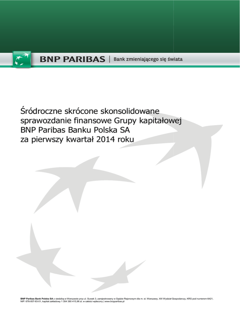Śródroczne skrócone krócone skonsolidowane sprawozdanie finansowe inansowe Grupy kapitałowej apitałowej BNP Paribas Banku u Polska SA za pierwszy kwartał 20 2014 roku BNP Paribas Bank Polska SA z siedzibą w Warszawie przy ul. Suwak 3, zarejestrowany w Sądzie Rejonowym dla m. st. Warszawy, XIII Wydział Gospodarczy, KRS pod numerem 6421, NIP: 676-007-83-01, kapitał zakładowy 1 304 380 415,96 zł, w całości wpłacony | www.bnpparibas.pl Grupa kapitałowa BNP Paribas Banku Polska SA Spis treści 1. Wybrane dane finansowe 3 2. Skonsolidowane sprawozdanie Grupy kapitałowej BNP Paribas Banku Polska SA 6 3. Kwartalna informacja finansowa - jednostkowe dane finansowe BNP Paribas Banku Polska SA 11 Najważniejsze czynniki kształtujące skonsolidowane wyniki Grupy kapitałowej BNP Paribas Banku Polska SA na koniec pierwszego kwartału 2014 roku 15 5. Dane informacyjne o Grupie kapitałowej BNP Paribas Banku Polska SA 22 6. Zasady rachunkowości 26 7. Porównywalność z opublikowanymi wcześniej raportami 27 8. Sprawozdawczość w ramach segmentów 28 9. Dodatkowe noty objaśniające do skonsolidowanego rachunku zysków i strat 30 10. Dodatkowe noty objaśniające do skonsolidowanego bilansu 33 11. Rachunkowość zabezpieczeń 42 12. Leasing 43 13. Inne istotne informacje 44 4. Grupa kapitałowa BNP Paribas Banku Polska SA | Śródroczne skrócone skonsolidowane sprawozdanie finansowe za pierwszy kwartał 2014 roku 2 Grupa kapitałowa BNP Paribas Banku Polska SA 1. Wybrane dane finansowe WYBRANE SKONSOLIDOWANE DANE FINANSOWE Rachunek zysków i strat w tys. PLN 31.03.2014 roku (narastająco) w tys. EUR 31.03.2013 roku (narastająco) 31.03.2014 roku (narastająco) 31.03.2013 roku (narastająco) Wynik z tytułu odsetek 139 550 143 455 33 310 34 370 Wynik z tytułu prowizji 34 373 35 006 8 205 8 387 197 589 217 062 47 164 52 006 -142 203 -140 919 -33 944 -33 763 Wynik z działalności bankowej Koszty działania (łącznie z amortyzacją) Koszty ryzyka i wynik z tytułu rezerw -21 190 -34 602 -5 058 -8 290 Wynik przed opodatkowaniem 33 356 41 383 7 962 9 915 Wynik po opodatkowaniu 24 642 30 794 5 882 7 378 28 692 926 28 692 926 - - Podstawowy zysk/strata przypadający na jedną akcję (PLN/EUR) 0,86 1,07 0,20 0,26 Rozwodniony zysk/strata przypadający na jedną akcję (PLN/EUR) 0,86 1,07 0,20 0,26 Przepływy pieniężne netto z działalności operacyjnej -1 741 844 -601 403 -415 774 -144 090 Przepływy pieniężne netto z działalności inwestycyjnej 747 131 277 489 178 338 66 484 Przepływy pieniężne netto z działalności finansowej 637 236 -759 062 152 107 -181 864 -357 477 -1 082 976 -85 329 -259 470 Stan na 31.03.2014 Stan na 31.12.2013 Stan na 31.03.2014 Stan na 31.12.2013 Aktywa razem 21 045 194 21 117 256 5 045 236 5 091 931 Należności od klientów 17 289 871 16 582 614 4 144 960 3 998 508 Wskaźniki Średnia ważona liczba akcji Rachunek przepływów pieniężnych Przepływy pieniężne brutto razem Bilans Zobowiązania wobec banków 1 019 102 424 273 244 313 102 303 Zobowiązania wobec klientów 10 156 502 10 894 299 2 434 853 2 626 905 Kredyty i pożyczki otrzymane 6 997 965 7 050 920 1 677 646 1 700 164 Kapitały własne 1 824 022 1 804 841 437 279 435 195 Wskaźniki Liczba akcji 28 692 926 28 692 926 - Wartość księgowa na 1 akcję (PLN/EUR) 63,57 62,90 15,24 15,17 - Rozwodniona wartość księgowa na 1 akcję (PLN/EUR) 63,57 62,90 15,24 15,17 12,07% 12,36 % - - 9,55% 9,69% - - 1 725 641 1 704 294 413 694 410 951 455 430 459 557 109 182 110 811 - 10 228 - 2 466 Adekwatność kapitałowa* Łączny współczynnik adekwatności kapitałowej Współczynnik adekwatności kapitałowej Tier 1 Fundusze podstawowe (Tier 1)/CRD IV, CET 1 Fundusze uzupełniające (Tier 2)/CRD IV Tier 2 Kapitał krótkoterminowy (Tier 3) Grupa kapitałowa BNP Paribas Banku Polska SA | Śródroczne skrócone skonsolidowane sprawozdanie finansowe za pierwszy kwartał 2014 roku 3 Grupa kapitałowa BNP Paribas Banku Polska SA WYBRANE JEDNOSTKOWE DANE FINANSOWE Rachunek zysków i strat w tys. PLN 31.03.2014 roku (narastająco) w tys. EUR 31.03.2013 roku (narastająco) 31.03.2014 roku (narastająco) 31.03.2013 roku (narastająco) Wynik z tytułu odsetek 135 079 133 437 32 243 Wynik z tytułu prowizji 32 047 32 761 7 650 7 849 188 666 203 222 45 034 48 690 -138 690 -136 246 -33 105 -32 643 Wynik z działalności bankowej Koszty działania (łącznie z amortyzacją) Koszty ryzyka i wynik z tytułu rezerw 31 970 -23 467 -37 514 -5 602 -8 988 Wynik przed opodatkowaniem 25 558 24 507 6 101 5 872 Wynik po opodatkowaniu 19 933 16 769 4 758 4 018 28 692 926 28 692 926 - - Podstawowy zysk/strata przypadający na jedną akcję (PLN/EUR) 0,69 0,58 0,17 0,14 Rozwodniony zysk/strata przypadający na jedną akcję (PLN/EUR) 0,69 0,58 0,17 0,14 Przepływy pieniężne netto z działalności operacyjnej -1 702 208 -739 358 -406 313 -177 143 Przepływy pieniężne netto z działalności inwestycyjnej 747 022 276 919 178 312 66 347 Przepływy pieniężne netto z działalności finansowej 597 739 -549 771 142 679 -131 720 -357 447 -1 012 210 -85 322 -242 516 Stan na 31.03.2014 Stan na 31.12.2013 Stan na 31.03.2014 Stan na 31.12.2013 Aktywa razem 20 909 866 19 653 614 5 012 794 4 739 008 Należności od klientów 3 634 761 Wskaźniki Średnia ważona liczba akcji Rachunek przepływów pieniężnych Przepływy pieniężne brutto razem Bilans 17 121 887 15 074 082 4 104 688 Zobowiązania wobec banków 1 019 019 424 273 244 293 102 303 Zobowiązania wobec klientów 10 243 582 10 971 677 2 455 729 2 645 563 Kredyty i pożyczki otrzymane 6 824 071 5 586 978 1 635 958 1 347 169 Kapitały własne 1 778 425 1 756 237 426 348 423 475 Wskaźniki Liczba akcji 28 692 926 28 692 926 - - Wartość księgowa na 1 akcję (PLN/EUR) 61,98 61,21 14 ,86 14,76 Rozwodniona wartość księgowa na 1 akcję (PLN/EUR) 61,98 61,21 14,86 14,76 Grupa kapitałowa BNP Paribas Banku Polska SA | Śródroczne skrócone skonsolidowane sprawozdanie finansowe 