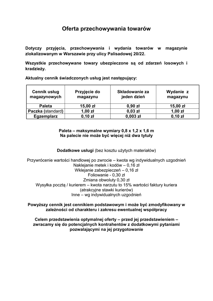 Oferta przechowywania towarów Dotyczy przyjęcia, przechowywania i wydania towarów zlokalizowanym w Warszawie przy ulicy Palisadowej 20/22. w magazynie Wszystkie przechowywane towary ubezpieczone są od zdarzeń losowych i kradzieży. Aktualny cennik świadczonych usług jest następujący: Cennik usług magazynowych Przyjęcie do magazynu Składowanie za jeden dzień Wydanie z magazynu Paleta Paczka (standard) Egzemplarz 15,00 zł 1,00 zł 0,10 zł 0,90 zł 0,03 zł 0,003 zł 15,00 zł 1,00 zł 0,10 zł Paleta – maksymalne wymiary 0,8 x 1,2 x 1,6 m Na palecie nie może być więcej niż dwa tytuły Dodatkowe usługi (bez kosztu użytych materiałów) Przywrócenie wartości handlowej po zwrocie – kwota wg indywidualnych uzgodnień Naklejanie metek i kodów – 0,16 zł Wklejanie zabezpieczeń – 0,16 zł Foliowanie - 0,30 zł Zmiana obwoluty 0,30 zł Wysyłka pocztą / kurierem – kwota narzutu to 15% wartości faktury kuriera (atrakcyjne stawki kurierów) Inne – wg indywidualnych uzgodnień Powyższy cennik jest cennikiem podstawowym i może być zmodyfikowany w zależności od charakteru i zakresu ewentualnej współpracy Celem przedstawienia optymalnej oferty – przed jej przedstawieniem – zwracamy się do potencjalnych kontrahentów z dodatkowymi pytaniami pozwalającymi na jej przygotowanie