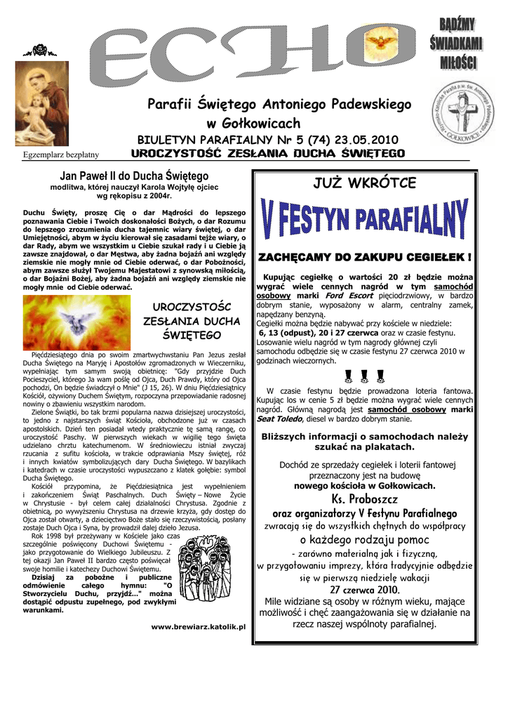 ykw Parafii Świętego Antoniego Padewskiego w Gołkowicach BIULETYN PARAFIALNY Nr 5 (74) 23.05.2010 Egzemplarz bezpłatny UROCZYSTOŚĆ ZESŁANIA DUCHA ŚWIĘTEGO Jan Paweł II do Ducha Świętego modlitwa, której nauczył Karola Wojtyłę ojciec wg rękopisu z 2004r. Duchu Święty, proszę Cię o dar Mądrości do lepszego poznawania Ciebie i Twoich doskonałości BoŜych, o dar Rozumu do lepszego zrozumienia ducha tajemnic wiary świętej, o dar Umiejętności, abym w Ŝyciu kierował się zasadami tejŜe wiary, o dar Rady, abym we wszystkim u Ciebie szukał rady i u Ciebie ją zawsze znajdował, o dar Męstwa, aby Ŝadna bojaźń ani względy ziemskie nie mogły mnie od Ciebie oderwać, o dar PoboŜności, abym zawsze słuŜył Twojemu Majestatowi z synowską miłością, o dar Bojaźni BoŜej, aby Ŝadna bojaźń ani względy ziemskie nie mogły mnie od Ciebie oderwać. UROCZYSTOŚC ZESŁANIA DUCHA ŚWIĘTEGO Pięćdziesiątego dnia po swoim zmartwychwstaniu Pan Jezus zesłał Ducha Świętego na Maryję i Apostołów zgromadzonych w Wieczerniku, wypełniając tym samym swoją obietnicę: "Gdy przyjdzie Duch Pocieszyciel, którego Ja wam poślę od Ojca, Duch Prawdy, który od Ojca pochodzi, On będzie świadczył o Mnie" (J 15, 26). W dniu Pięćdziesiątnicy Kościół, oŜywiony Duchem Świętym, rozpoczyna przepowiadanie radosnej nowiny o zbawieniu wszystkim narodom. Zielone Świątki, bo tak brzmi popularna nazwa dzisiejszej uroczystości, to jedno z najstarszych świąt Kościoła, obchodzone juŜ w czasach apostolskich. Dzień ten posiadał wtedy praktycznie tę samą rangę, co uroczystość Paschy. W pierwszych wiekach w wigilię tego święta udzielano chrztu katechumenom. W średniowieczu istniał zwyczaj rzucania z sufitu kościoła, w trakcie odprawiania Mszy świętej, róŜ i innych kwiatów symbolizujących dary Ducha Świętego. W bazylikach i katedrach w czasie uroczystości wypuszczano z klatek gołębie: symbol Ducha Świętego. Kościół przypomina, Ŝe Pięćdziesiątnica jest wypełnieniem i zakończeniem Świąt Paschalnych. Duch Święty – Nowe śycie w Chrystusie - był celem całej działalności Chrystusa. Zgodnie z obietnicą, po wywyŜszeniu Chrystusa na drzewie krzyŜa, gdy dostęp do Ojca został otwarty, a dziecięctwo BoŜe stało się rzeczywistością, posłany zostaje Duch Ojca i Syna, by prowadził dalej dzieło Jezusa. Rok 1998 był przeŜywany w Kościele jako czas szczególnie poświęcony Duchowi Świętemu jako przygotowanie do Wielkiego Jubileuszu. Z tej okazji Jan Paweł II bardzo często poświęcał swoje homilie i katechezy Duchowi Świętemu. Dzisiaj za poboŜne i publiczne odmówienie całego hymnu: "O Stworzycielu Duchu, przyjdź..." moŜna dostąpić odpustu zupełnego, pod zwykłymi warunkami. www.brewiarz.katolik.pl JUś WKRÓTCE ZACHĘCAMY DO ZAKUPU CEGIEŁEK ! Kupując cegiełkę o wartości 20 zł będzie moŜna wygrać wiele cennych nagród w tym samochód osobowy marki Ford Escort pięciodrzwiowy, w bardzo dobrym stanie, wyposaŜony w alarm, centralny zamek, napędzany benzyną. Cegiełki moŜna będzie nabywać przy kościele w niedziele: 6, 13 (odpust), 20 i 27 czerwca oraz w czasie festynu. Losowanie wielu nagród w tym nagrody głównej czyli samochodu odbędzie się w czasie festynu 27 czerwca 2010 w godzinach wieczornych. ! ! ! W czasie festynu będzie prowadzona loteria fantowa. Kupując los w cenie 5 zł będzie moŜna wygrać wiele cennych nagród. Główną nagrodą jest samochód osobowy marki Seat Toledo, diesel w bardzo dobrym stanie. BliŜszych informacji o samochodach naleŜy szukać na plakatach. Dochód ze sprzedaŜy cegiełek i loterii fantowej przeznaczony jest na budowę nowego kościoła w Gołkowicach. Ks. Proboszcz oraz organizatorzy V Festynu Parafialnego zwracają się do wszystkich chętnych do współpracy o kaŜdego rodzaju pomoc - zarówno materialną jak i fizyczną, w przygotowaniu imprezy, która tradycyjnie odbędzie się w pierwszą niedzielę wakacji 27 czerwca 2010. Mile widziane są osoby w róŜnym wieku, mające moŜliwość i chęć zaangaŜowania się w działanie na rzecz naszej wspólnoty parafialnej. -2- f6F Uroczystość Zesłania Ducha Św. - Zielone Święta f6F Uroczystość BoŜego Ciała Niedziela 23 maja 2010 Msze Św. o godz. 7.00, 8.00 (w kaplicy), 9.15, 10.30, 12.00, 16.00 (NaboŜeństwo Majowe i Msza Św.) 3 czerwca 2010 Msze Św. o godz. 7.00, 9.00 połączona z uroczystą procesją do czterech ołtarzy, o 15.00 w kaplicy w Skrudzinie i o 16.00 połączona z procesją wokół kościoła. Święto NMP Matki Kościoła Prosimy o wykonanie ołtarzy na BoŜe Ciało! Poniedziałek 24 maja 2010 - drugi dzień Zielonych Świąt Msze Św. o godz. 7.00, 8.00(kaplica), 9.15, 10.30, 18.00 (kaplica) i 19.00. Uroczystość Najświętszej Trójcy Niedziela 30 maja 2010 Msze Św. o godz. 7.00, 8.00(kaplica), 9.15, 10.30, 12.00 Po południu w Gołkowicach nie będzie NaboŜeństwa Majowego ani Mszy Św. Pielgrzymka majowa z Gołkowic do Skrudziny W niedzielę 30 maja 2010 r. wyruszymy z tradycyjną pielgrzymką do kaplicy w Skrudzinie, juŜ po raz kolejny organizowaną przez Parafialny Oddział Akcji Katolickiej. O godz.15.00 wyjście z kościoła w Gołkowicach; ok. godz. 16.00 w kaplicy w Skrudzinie NaboŜeństwo Majowe; o godz. 16.30 w szkole w Skrudzinie spektakl teatralny pt. „Pchła Szachrajka”; po przedstawieniu mini-festyn na boisku sportowym przy szkole. !!! Msze Św. wieczorne od poniedziałku 31 maja 2010 r. będą odprawiane w kościele w Gołkowicach o godz.19.00, a w kaplicy w Skrudzinie w środę i piątek o godz.18.00. I Radę Sołecką i Pana Sołtysa z Gabonia Praczki II Radę Sołecką i Pana Sołtysa ze Skrudziny III Radę Sołecką i Pana Sołtysa z Gołkowic Dolnych (ołtarz przy pomniku Ojca Św.) IV Radę Sołecką i Pana Sołtysa z Gołkowic Górnych (ołtarz w nowym kościele) ZAPROSZENIE Serdecznie zapraszam: kapłanów, siostry zakonne, wszystkie or