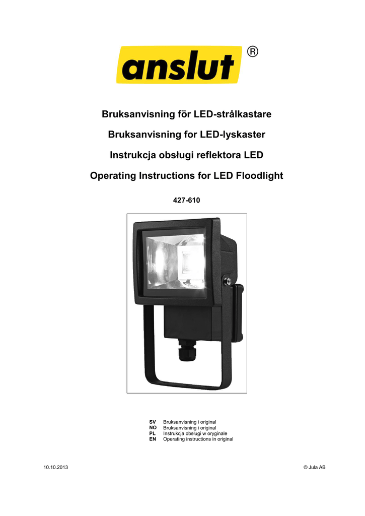 Bruksanvisning för LED-strålkastare Bruksanvisning for LED-lyskaster Instrukcja obsługi reflektora LED Operating Instructions for LED Floodlight 427-610 SV NO PL EN 10.10.2013 Bruksanvisning i original Bruksanvisning i original Instrukcja obsługi w oryginale Operating instructions in original © Jula AB SVENSKA SVENSK A SÄKERHETSANVISNINGAR Läs monteringsanvisningen noggrant innan användning! RESPEKT FÖR EL! Nyinstallationer och utökning av befintliga anläggningar ska alltid utföras av behörig installatör. Vid nödvändig kännedom (i annat fall kontakta elinstallatör) får du byta strömbrytare, vägguttag samt montera stickproppar, skarvsladdar och lamphållare. Felaktig montering kan leda till livsfara och brandrisk. Bryt spänningsförsörjningen före montering och/eller underhåll. Produkten måste vara jordad. Använd inte produkten om skyddsglaset är spräckt. Byt omedelbart ut skyddsglaset. Använd endast originalreservdelar. Anslut den gröngula jordledaren till jordplinten, som är märkt med jordsymbol. Anslut fasledaren till plinten märkt L och nolledaren till plinten märkt N. Bryt spänningsförsörjningen före underhåll. Underhåll ska utföras av behörig elektriker. Produkten är avsedd för fast montering. Om någon del av produkten är skadad ska den bytas ut av behörig servicerepresentant eller annan kvalificerad person, för att undvika fara. VIKTIGT! Ljuskällan kan inte bytas. Om ljuskällan går sönder måste hela produkten bytas. TEKNISKA DATA Märkspänning Effekt Färgtemperatur Ljusflöde Spridningsvinkel Omgivningstemperatur Kapslingsklass 230 V ~ 50 Hz 14 W 4000 k 1100 lm 60º -25 – +40 °C IP44 MONTERING 1. 2. 3. 4. 5. 6. 7. 8. Montera inte produkten på ytor som utsätts för vibration. Produkten bör monteras med väggfästet. Håll väggfästet mot väggen, märk ut och borra hålen och montera väggfästet med lämpliga skruvar (medföljer inte). Öppna kopplingsboxen. Dra in nätkabeln (medföljer inte, använd kabel av typ H05RN-F 3G 1,0 mm2) i kopplingsboxen genom genomföringen med gummipackning. Kontrollera att genomföringen är tät. Anslut den gröngula jordledaren till jordplinten, som är märkt med jordsymbol. Anslut fasledaren till plinten märkt L och nolledaren till plinten märkt N. Sätt tillbaka kopplingsboxens lock. Var noga med att återmontera lockets gummipackning. Montera produkten på väggfästet med de två skruvarna. Justera produkten till önskat läge och dra åt skruvarna. 2 SVENSKA OBS! N L Blå (nolledare) Gul/grön (jordledare) Brun (fasledare) Monteringsavstånd Rätten till ändringar förbehålles. Vid eventuella problem, kontakta vår serviceavdelning på telefon 0200-88 55 88. Jula AB, Box 363, 532 24 SKARA www.jula.se 3 NORSK NORSK SIKKERHETSANVISNINGER Les monteringsanvisningen nøye før bruk! RESPEKT FOR EL! Kan kun installeres av en registrert installasjonsvirksomhet. Det kan oppstå livsfare og øke brannfaren dersom arbeidet ikke er riktig utført. Bryt spenningsforsyningen før montering og/eller vedlikehold. Produktet må være jordet. Ikke bruk produktet hvis beskyttelsesglasset er sprukket. Bytt umiddelbart ut beskyttelsesglasset. Bruk kun originale reservedeler. Koble den grønn-gule jordlederen til jordklemmen, som er merket med jordsymbol. Koble faselederen til klemmen merket L, og nullederen til klemmen merket N. Bryt spenningsforsyningen før vedlikehold. Vedlikehold skal utføres av en godkjent elektriker. Produktet er beregnet på fast installasjon. Hvis en av apparatets deler er skadet, må den byttes ut av godkjent servicerepresentant eller annen godkjent person for å unngå fare. VIKTIG! Lyskilden kan ikke byttes. Hvis lyskilden blir ødelagt, må hele produktet skiftes ut. TEKNISKE DATA Nominell spenning Effekt Fargetemperatur Lysstrøm Spredningsvinkel Omgivelsestemperatur Kapslingsklasse 230 V, 50 Hz 14 W 4000 K 1100 lm 60º -25 til +40 °C IP44 MONTERING 1. 2. 3. 4. 5. 6. 7. 8. Produktet må ikke monteres på flater som er utsatt for vibrasjon. Produktet bør monteres med veggfestet. Hold veggfestet mot veggen, marker og bor hullene og monter veggfestet med egnede skruer (ikke inkl.). Åpne koblingsboksen. Trekk nettkabelen (ikke inkl., bruk kabel av typen H05RN-F 3G 1,0 mm2) inn i koblingsboksen gjennom gjennomføringen med gummipakning. Kontroller at gjennomføringen er tett. Koble den grønn-gule jordlederen til jordklemmen, som er merket med jordsymbol. Koble faselederen til klemmen merket L, og nullederen til klemmen merket N. Sett lokket på koblingsboksen tilbake på plass. Pass på at gummipakningen på lokket settes skikkelig på plass. Monter produktet på veggfestet med de to skruene. Juster produktet til ønsket stilling og skru til skruene. OBS! N L Blå (nulleder) Gul/grønn (jordleder) Brun (faseleder) 4 NORSK Monteringsavstand Med forbehold om endringer. Ved eventuelle problemer kan du kontakte vår serviceavdeling på telefon 67 90 01 34. Jula Norge AS, Solheimsveien 6–8, 1471 LØRENSKOG www.jula.no 5 POLSKI POL SKI ZASADY BEZPIECZEŃSTWA Przed rozpoczęciem montażu przeczytaj uważnie instrukcję! ZACHOWAJ OSTROŻNOŚĆ PODCZAS PRACY Z PRĄDEM! Wykonanie nowej instalacji oraz rozbudowanie instalacji istniejących należy zawsze zlecać uprawnionemu instalatorowi. Jeśli posiadasz odpowiednią wiedzę (w przeciwnym razie należy skontaktować się z elektrykiem-instalatorem), możesz wymieniać przełączniki, gniazda ścienne oraz montować wtyczki, przedłużacze i oprawki żarówek. Nieprawidłowy montaż może stanowić zagrożenie dla życia i spowodować ryzyko pożaru. Przed przystąpieniem do montażu i/lub konserwacji odłącz zasilanie. Produkt musi być uziemiony. Nie używaj produktu, jeśli szybka ochronna jest pęknięta. Wymień ją natychmiast. Używaj wyłącznie oryginalnych części zamiennych. Podłącz zielono-żółty przewód uziemienia do zacisku oznaczonego symbolem uziemienia. Podłącz przewód fazowy do zacisku oznaczoneg