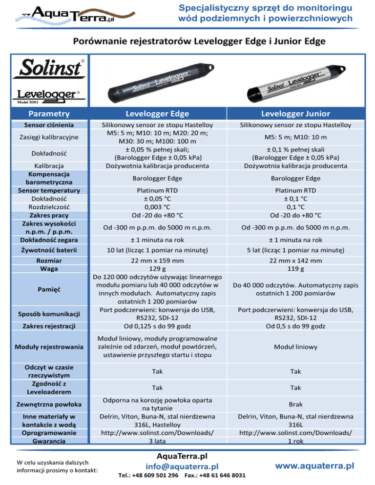 Porównanie rejestratorów Levelogger Edge i Junior Edge Parametry Levelogger Edge Levelogger Junior Sensor ciśnienia Silikonowy sensor ze stopu Hastelloy M5: 5 m; M10: 10 m; M20: 20 m; M30: 30 m; M100: 100 m ± 0,05 % pełnej skali; (Barologger Edge ± 0,05 kPa) Dożywotnia kalibracja producenta Silikonowy sensor ze stopu Hastelloy Barologger Edge Barologger Edge Platinum RTD ± 0,05 °C 0,003 °C Od -20 do +80 °C Platinum RTD ± 0,1 °C 0,1 °C Od -20 do +80 °C Od -300 m p.p.m. do 5000 m n.p.m. Od -300 m p.p.m. do 5000 m n.p.m. ± 1 minuta na rok ± 1 minuta na rok Żywotność baterii 10 lat (licząc 1 pomiar na minutę) 5 lat (licząc 1 pomiar na minutę) Rozmiar Waga 22 mm x 159 mm 129 g Do 120 000 odczytów używając linearnego modułu pomiaru lub 40 000 odczytów w innych modułach. Automatyczny zapis ostatnich 1 200 pomiarów Port podczerwieni: konwersja do USB, RS232, SDI-12 Od 0,125 s do 99 godz 22 mm x 142 mm 119 g Zasięgi kalibracyjne Dokładność Kalibracja Kompensacja barometryczna Sensor temperatury Dokładność Rozdzielczość Zakres pracy Zakres wysokości n.p.m. / p.p.m. Dokładność zegara Pamięć Sposób komunikacji Zakres rejestracji Moduły rejestrowania M5: 5 m; M10: 10 m ± 0,1 % pełnej skali (Barologger Edge ± 0,05 kPa) Dożywotnia kalibracja producenta Do 40 000 odczytów. Automatyczny zapis ostatnich 1 200 pomiarów Port podczerwieni: konwersja do USB, RS232, SDI-12 Od 0,5 s do 99 godz Moduł liniowy, moduły programowalne zależnie od zdarzeń, moduł powtórzeń, ustawienie przyszłego startu i stopu Moduł liniowy Tak Tak Tak Tak Odczyt w czasie rzeczywistym Zgodność z Leveloaderem Zewnętrzna powłoka Inne materiały w kontakcie z wodą Oprogramowanie Gwarancja W celu uzyskania dalszych informacji prosimy o kontakt: Odporna na korozję powłoka oparta na tytanie Delrin, Viton, Buna-N, stal nierdzewna 316L, Hastelloy http://www.solinst.com/Downloads/ 3 lata Brak Delrin, Viton, Buna-N, stal nierdzewna 316L http://www.solinst.com/Downloads/ 1 rok AquaTerra.pl [email protected] Tel.: +48 609 501 296 Fax.: +48 61 646 8031