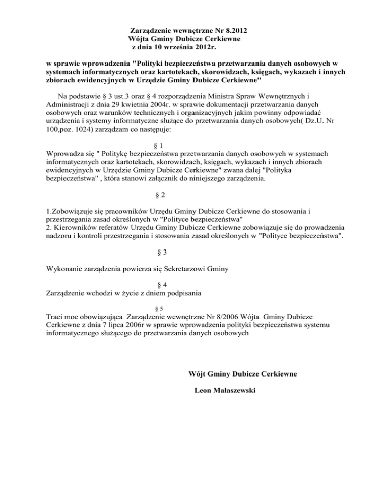 Zarządzenie wewnętrzne Nr 8.2012 Wójta Gminy Dubicze