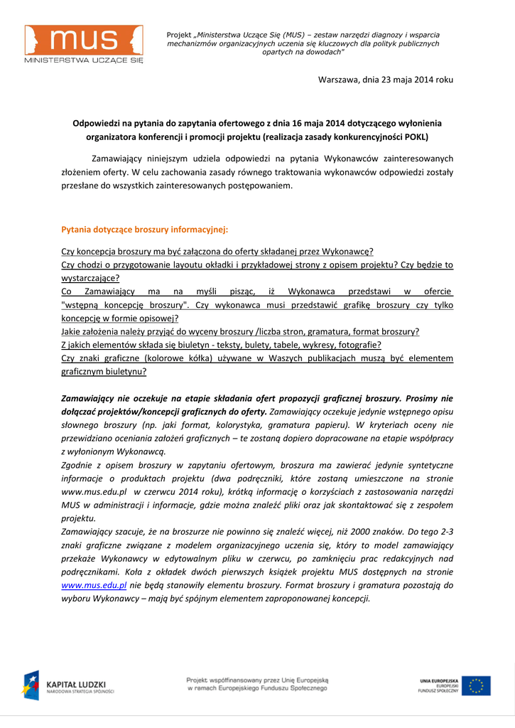 Projekt „Ministerstwa Uczące Się (MUS) – zestaw narzędzi diagnozy i wsparcia mechanizmów organizacyjnych uczenia się kluczowych dla polityk publicznych opartych na dowodach" Warszawa, dnia 23 maja 2014 roku Odpowiedzi na pytania do zapytania ofertowego z dnia 16 maja 2014 dotyczącego wyłonienia organizatora konferencji i promocji projektu (realizacja zasady konkurencyjności POKL) Zamawiający niniejszym udziela odpowiedzi na pytania Wykonawców zainteresowanych złożeniem oferty. W celu zachowania zasady równego traktowania wykonawców odpowiedzi zostały przesłane do wszystkich zainteresowanych postępowaniem. Pytania dotyczące broszury informacyjnej: Czy koncepcja broszury ma być załączona do oferty składanej przez Wykonawcę? Czy chodzi o przygotowanie layoutu okładki i przykładowej strony z opisem projektu? Czy będzie to wystarczające? Co Zamawiający ma na myśli pisząc, iż Wykonawca przedstawi w ofercie "wstępną koncepcję broszury". Czy wykonawca musi przedstawić grafikę broszury czy tylko koncepcję w formie opisowej? Jakie założenia należy przyjąć do wyceny broszury /liczba stron, gramatura, format broszury? Z jakich elementów składa się biuletyn - teksty, bulety, tabele, wykresy, fotografie? Czy znaki graficzne (kolorowe kółka) używane w Waszych publikacjach muszą być elementem graficznym biuletynu? Zamawiający nie oczekuje na etapie składania ofert propozycji graficznej broszury. Prosimy nie dołączać projektów/koncepcji graficznych do oferty. Zamawiający oczekuje jedynie wstępnego opisu słownego broszury (np. jaki format, kolorystyka, gramatura papieru). W kryteriach oceny nie przewidziano oceniania założeń graficznych – te zostaną dopiero dopracowane na etapie współpracy z wyłonionym Wykonawcą. Zgodnie z opisem broszury w zapytaniu ofertowym, broszura ma zawierać jedynie syntetyczne informacje o produktach projektu (dwa podręczniki, które zostaną umieszczone na stronie www.mus.edu.pl w czerwcu 2014 roku), krótką informację o korzyściach z zastosowania narzędzi MUS w administracji i informacje, gdzie można znaleźć pliki oraz jak skontaktować się z zespołem projektu. Zamawiający szacuje, że na broszurze nie powinno się znaleźć więcej, niż 2000 znaków. Do tego 2-3 znaki graficzne związane z modelem organizacyjnego uczenia się, który to model zamawiający przekaże Wykonawcy w edytowalnym pliku w czerwcu, po zamknięciu prac redakcyjnych nad podręcznikami. Koła z okładek dwóch pierwszych książek projektu MUS dostępnych na stronie www.mus.edu.pl nie będą stanowiły elementu broszury. Format broszury i gramatura pozostają do wyboru Wykonawcy – mają być spójnym elementem zaproponowanej koncepcji. Projekt „Ministerstwa Uczące Się (MUS) – zestaw narzędzi diagnozy i wsparcia mechanizmów organizacyjnych uczenia się kluczowych dla polityk publicznych opartych na dowodach" Pytanie dotyczące wartości zamówienia: Zgodnie z prawem zamówień publicznych i jawnością procedury przetargowej zwracam się z prośbą o przesłanie protokołu postepowania wraz z informacją o wartości zamówienia wpisanej do w/w protokołu. Zamawiający oszacował, iż wartość zamówienia nie powinna przekroczyć 30 000 euro neto, co stanowi próg stosowania Ustawy Prawo Zamówień Publicznych. Procedura wyłonienia wykonawcy prowadzona jest więc w oparciu o zasadę konkurencyjności opisaną w wytycznych POKL, w ramach której wzór protokołu nie pokrywa się z wzorem stosowanym w ramach prawa zamówień publicznych (nie zawiera m.in. szacowanej wartości zamówienia). Pytania dotyczące posiadanego doświadczenia: Czy wystarczy przedstawienie dokumentów (referencji) potwierdzających organizację 3 konferencji, w ramach których wykonawca, był odpowiedzialny za zapewnienie: cateringu, zakwaterowania, sal konferencyjnych wraz z wyposażeniem, rejestrację i rekrutację uczestników, obsługę fotograficzną , przygotowanie i druk materiałów, promocyjno-konferencyjnych itp. na kwotę co najmniej 40000,netto każde. Czy obligatoryjne jest, aby Wykonawca w ramach wymaganego doświadczenia, udokumentował realizację kampanii promocyjno-reklamowych? Ze względu na fakt, iż istotnym elementem zamówienia jest organizacja działań promocyjnych, związanych z angażowaniem mediów i publikacją materiałów w mediach (zarówno tradycyjnych, jak i portalach internetowych), Zamawiający oczekuje od Oferentów wskazania wcześniej realizowanych projektów w tym właśnie zakresie, zatem wśród wskazywanych w ofercie zrealizowanych wcześniej usług muszą być także usługi związane z prowadzeniem działań informacyjno-promocyjnych w mediach.