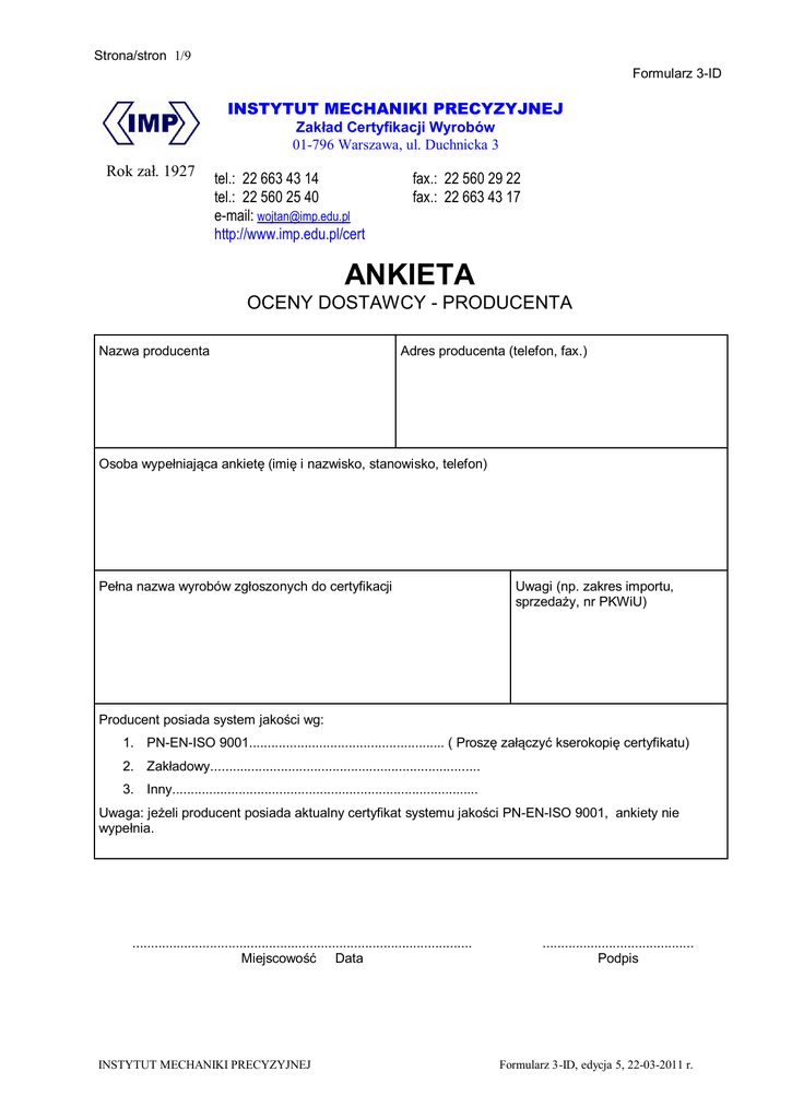 Strona/stron 1/9 Formularz 3-ID INSTYTUT MECHANIKI PRECYZYJNEJ Zakład Certyfikacji Wyrobów 01-796 Warszawa, ul. Duchnicka 3 Rok zał. 1927 tel.: 22 663 43 14 tel.: 22 560 25 40 e-mail: [email protected] http://www.imp.edu.pl/cert fax.: 22 560 29 22 fax.: 22 663 43 17 ANKIETA OCENY DOSTAWCY - PRODUCENTA Nazwa producenta Adres producenta (telefon, fax.) Osoba wypełniająca ankietę (imię i nazwisko, stanowisko, telefon) Pełna nazwa wyrobów zgłoszonych do certyfikacji Uwagi (np. zakres importu, sprzedaży, nr PKWiU) Producent posiada system jakości wg: 1. PN-EN-ISO 9001..................................................... ( Proszę załączyć kserokopię certyfikatu) 2. Zakładowy......................................................................... 3. Inny................................................................................... Uwaga: jeżeli producent posiada aktualny certyfikat systemu jakości PN-EN-ISO 9001, ankiety nie wypełnia. ............................................................................................ Miejscowość Data INSTYTUT MECHANIKI PRECYZYJNEJ ......................................... Podpis Formularz 3-ID, edycja 5, 22-03-2011 r. Strona/stron 2/9 Formularz 3-ID Lp. Wyszczególnienie 1 2 Odpowiedź Zakładu tak/nie 3 Uwagi 4 ORGANIZACJA ZAKŁADU PRODUKCYJNEGO 1. Czy posiadacie plan organizacyjny odpowiedni do przebiegu produkcji i zapewnienia funkcji kontroli jakości 2. Czy posiadacie procedury produkcyjne dla każdego produkowanego asortymentu 3. Według jakiej dokumentacji produkowane są wyroby: - własnej, - zamawiającego, - dokumentów znormalizowanych podać cechy dokumentu Czy dokumentacja określa zasady identyfikacji i cechowania wyrobów Podać zasady cechowania na przykładzie 4. PERSONEL ZWIĄZANY Z KONTROLĄ JAKOŚCI KONTROLA JAKOŚCI 5. Osoba odpowiedzialna za jakość w zakładzie (imię, nazwisko, stanowisko) ............................................................................ ............................................................................ .................................................... 6. Czy jest wydzielony dział kontroli jakości (podać imię, nazwisko, przygotowanie zawodowe kierownika działu) ............................................................................ ............................................................................ .................................................... 7. Czy pracownicy działu kontroli są szkoleni w zakresie działalności kontrolnej 8. Czy pracownicy produkcyjni zobowiązani są do prowadzenia działalności kontrolnej (samokontrola): - materiałów, - procesów produkcyjnych, - wyrobów gotowych. INSTYTUT MECHANIKI PRECYZYJNEJ Formularz 3-ID, edycja 5, 22-03-2011 r. Strona/stron 3/9 Formularz 3-ID Lp. Wyszczególnienie 1 9. 2 Czy działania kontrolne pracowników produkcyjnych są weryfikowane w dziale kontroli 10. Czy w zakładzie prowadzone są audity jakości 11. Czy są środki techniczne oraz wykwalifikowany personel do działalności weryfikacyjnej (oceny): - konstrukcji, - technologii, - przebiegu procesu wytwarzania wyrobu 12. Czy system kontroli jakości jest regularnie oceniany przez kierownictwo, a ocena ta jest dokumentowana Odpowiedź Zakładu tak/nie 3 Uwagi 4 MATERIAŁY, PÓŁWYROBY, USŁUGI 13. Zapewnienie jakości dostaw: - czy posiadacie wykaz zatwierdzonych poddostawców, - czy posiadacie procedurę oceny poddostawców, - czy pracownik kontroli sprawdza i akceptuje dokumenty zakupu i parametry wyrobu 14. Wymienić materiały, na które zakład otrzymuje atesty (wg tab.1) 15.. Wymienić materiały, których jakość wytwórca sprawdza we własnym zakresie lub zleca innej jednostce (wg tab.2) 16. Czy posiadacie procedurę postępowania w przypadku stwierdzenia złych materiałów 17. Czy zakład reklamuje materiały nie spełniające wymagań. Podać liczbę i rodzaj reklamacji w okresie ostatniego roku 18. Czy posiadacie procedurę sprawdzania , przechowywania i obsługiwania wyrobu dostarczonego przez nabywcę INSTYTUT MECHANIKI PRECYZYJNEJ Formularz 3-ID, edycja 5, 22-03-2011 r. Strona/stron 4/9 Formularz 3-ID Lp. 1 19. Wyszczególnienie 2 Czy istnieją zasady identyfikowalności materiałów i półwyrobów, podać jakie Odpowiedź Zakładu tak/nie 3 Uwagi 4 PROCES PRODUKCYJNY 20. Czy procesy technologiczne prowadzone są wg instrukcji roboczych, jeżeli tak prosimy podać poszczególne fazy procesu produkcyjnego 21. Czy procesy technologiczne prowadzone są wg instrukcji roboczych, uzgodnionych z działem jakości 22. Czy istnieje i funkcjonuje procedura sterowania jakością w procesie produkcyjnym 23. Jaki system pracy jest stosowany. Czy zakład posiada dokumentację technologiczną na wyrób STEROWANIE JAKOŚCIĄ, BADANIA 24. Czy istnieje i funkcjonuje procedura sterowania jakością w zakładzie 25. Podać w zał. Akty prawne związane z jakością w Zakładzie 26. Czy zakład posiada normy przedmiotowe związane z produkowanym wyrobem 27. Czy zakład posiada dokument regulujący sposób kontroli i jaki …......................................................................... ............................................................................ .................................................... 28. Czy zakład prowadzi kontrole międzyoperacyjne, podać sposób kontroli 29. Czy zakład prowadzi badania gotowych wyrobów: wymienić rodzaj prowadzonych badań INSTYTUT MECHANIKI PRECYZYJNEJ Formularz 3-ID, edycja 5, 22-03-2011 r. Strona/stron 5/9 Formularz 3-ID Lp. Wyszczególnienie 1 2 (bieżące, okresowe, pełne, niepełne itp.) - Określić sposób tworzenia partii do badań.................................................................. ............................................................................ ............................................., lub - Określić sposób pobierania próbek ............................................................................ ...................