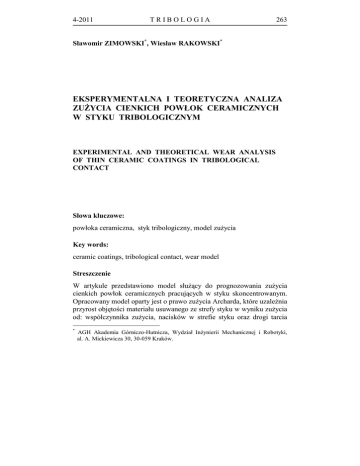 4-2011 TRIBOLOGIA 263 Sławomir ZIMOWSKI*, Wiesław RAKOWSKI* EKSPERYMENTALNA I TEORETYCZNA ANALIZA ZUŻYCIA CIENKICH POWŁOK CERAMICZNYCH W STYKU TRIBOLOGICZNYM EXPERIMENTAL AND THEORETICAL WEAR ANALYSIS OF THIN CERAMIC COATINGS IN TRIBOLOGICAL CONTACT Słowa kluczowe: powłoka ceramiczna, styk tribologiczny, model zużycia Key words: ceramic coatings, tribological contact, wear model Streszczenie W artykule przedstawiono model służący do prognozowania zużycia cienkich powłok ceramicznych pracujących w styku skoncentrowanym. Opracowany model oparty jest o prawo zużycia Archarda, które uzależnia przyrost objętości materiału usuwanego ze strefy styku w wyniku zużycia od: współczynnika zużycia, nacisków w strefie styku oraz drogi tarcia * AGH Akademia Górniczo-Hutnicza, Wydział Inżynierii Mechanicznej i Robotyki, al. A. Mickiewicza 30, 30-059 Kraków. 264 TRIBOLOGIA 4-2011 i przyrostu pola styku. Zarówno w modelu, jak i w testach parę tribologiczną stanowiły kula i płaska powierzchnia. Kula o średnicy 1 mm wykonana z Al2O3 współpracowała z powłoką TiN, dwoma powłokami kompozytowymi typu nc-TiN/a-C oraz powłoką nc-WC/a-C. Na podstawie obserwacji mikroskopowych i analizy profilu bruzdy stwierdzono głównie ścierny charakter zużycia, dominujący w zakresie małych obciążeń, kiedy układ powłoka/podłoże nie ulega znaczącej deformacji. Porównanie wyników badań symulacyjnych z eksperymentalnymi wskazuje, że przyjęty model umożliwia szacowanie zużycia powłok ceramicznych w oparciu o parametry materiałowe oraz warunki tarcia. WPROWADZENIE Badania tribologiczne nawet w zakresie wyznaczania podstawowych charakterystyk tribologicznych materiałów są czasochłonne. Testy mają charakter niszczący, a ponowne wykorzystanie badanego elementu jest często niemożliwe ze względu na zmianę właściwości fizykochemicznych na jego powierzchni lub całkowite zniszczenie próbki, tak jak ma to miejsce w przypadku tarcia cienkich powłok. Symulacja zużycia pary ciernej może stanowić cenne narzędzie w projektowaniu, a zwłaszcza w doborze materiałów na elementy węzłów tarcia. Może znacznie skrócić czas oraz zmniejszyć ilość koniecznych do wykonania prób w badaniach tribologicznych nowych materiałów. W literaturze najczęściej spotykane są modele matematyczne zużycia, opracowane na podstawie teorii Hertza i rozwiązań na gruncie mechaniki kontaktu oraz modele wykorzystujące metody numeryczne, zwłaszcza metodę elementów skończonych [L. 1–3]. OPIS PRZYJĘTEGO MODELU ZUŻYCIA Prezentowany w niniejszej pracy model zużycia został opracowany na podstawie analizy literatury, głównie pozycji [L. 1–4] oraz własnych prac laboratoryjnych. Oparty jest on o prawo zużycia Archarda [L. 5], które można przedstawić w postaci: dV = K ⋅ p ⋅ dAa ⋅ ds (1) Przyrost objętości materiału usuwanego ze strefy styku w wyniku ścierania jest zależny od współczynnika intensywności zużycia badanego materiału (K), nacisków w strefie styku (p), przyrostu pola styku (dAa) 4-2011 TRIBOLOGIA 265 i drogi tarcia (ds). We wcześniejszych pracach badawczych [L. 6, 7] wykazano, że wielkość zużycia bruzdy jest nierównomierna i zależna od naprężeń kontaktowych w styku tribologicznym. W związku z tym można wyróżnić dwa poziomy współczynnika intensywności zużywania: niższy K1 poniżej nacisku krytycznego pc, oraz wyższy K2 po przekroczeniu nacisku krytycznego pc. Przekształcając równanie (1) dochodzimy do zależności przedstawiającej przyrost głębokości bruzdy: dh( x) = dV = K ( p ) ⋅ p ( x, y ) ⋅ ds dAa (2) gdzie: K(p)= K1 dla p < pc oraz K(p)= K2 dla p > pc. (a) (b) Rys. 1. Schemat bruzdy powstałej w płaskim elemencie podczas tarcia z kulą (a) [L. 3] oraz rzut pola styku o kształcie elipsy (b) a, b – półosie elipsy Fig. 1. Scheme of groove formed in the flat element after friction with a ball (a) [L. 3] and plane view of elliptical contact area (b) a, b – semi-axis of an ellipse Podczas jednokrotnego przejścia kuli po powierzchni styk istnieje tylko raz pomiędzy każdym punktem na powierzchni bruzdy żłobionej w elemencie w pozycji x i odpowiadającemu mu punktowi na powierzchni kuli również w pozycji x (Rys. 1). Naciski wywierane na te punkty w strefie styku opisane są przez naprężenia kontaktowe p(x = const; y), gdzie y jest współrzędną zorientowaną wzdłuż osi Y, która przebiega zgodnie z kierunkiem chwilowego ruchu kulki (Rys. 1). Znając rozkład nacisków p(x, y) w strefie styku przyrost głębokości bruzdy w i-tym cyklu można obliczyć z zależności: 266 TRIBOLOGIA ∆hi ( x) = 2 ⋅ y = yc ∫K 2 ⋅ p ( x, y ) ⋅ dy + 2 ⋅ y =0 y = yb ∫K 1 4-2011 ⋅ p ( x, y ) ⋅ dy (3) y = yc gdzie: yc = 0 gdy nacisk w styku p(x,y) nie przekracza pc w całej strefie kontaktu. Zatem po n cyklach przekrój poprzeczny bruzdy, hn(x), powstaje przez zsumowanie wszystkich przyrostów ∆hi (x) w każdym cyklu: n hn ( x) = ∑ ∆hi ( x) (4) i =1 Natomiast zużycie materiału wyznaczamy z zależności: w/2 vn = 2 ⋅ π ⋅ D ⋅ ∫ hn ( x) ⋅ dx (5) x =0 gdzie: w/2 – połowa szerokości bruzdy [m], D – średnica toru tarcia pary kula/wirująca tarcza [m]. Stykowy nacisk krytyczny pc jest zależny od właściwości mikromechanicznych współpracujących elementów, a głównie ich twardości pc = f(H). Znajomość tego nacisku jest szczególnie ważna w przypadku tarcia cienkich powłok, nakładanych na podłożu o innych właściwościach. Wskutek zużycia powłoki następuje ciągła zmiana nośności układu powłoka/podłoże, którą w styku skoncentrowanym opisuje twardość. Grubość powłoki ma duży wpływ na lokalizację koncentracji naprężeń w układzie powłoka/podłoże [L. 8]. Tak więc bardzo istotnym okazało się rozszerzenie modelu o formułę uzależniającą nacisk krytyczny od zmiany twardości (Hc), co poprawiło dokładność modelu. Wprowadzono dodatkowo zale