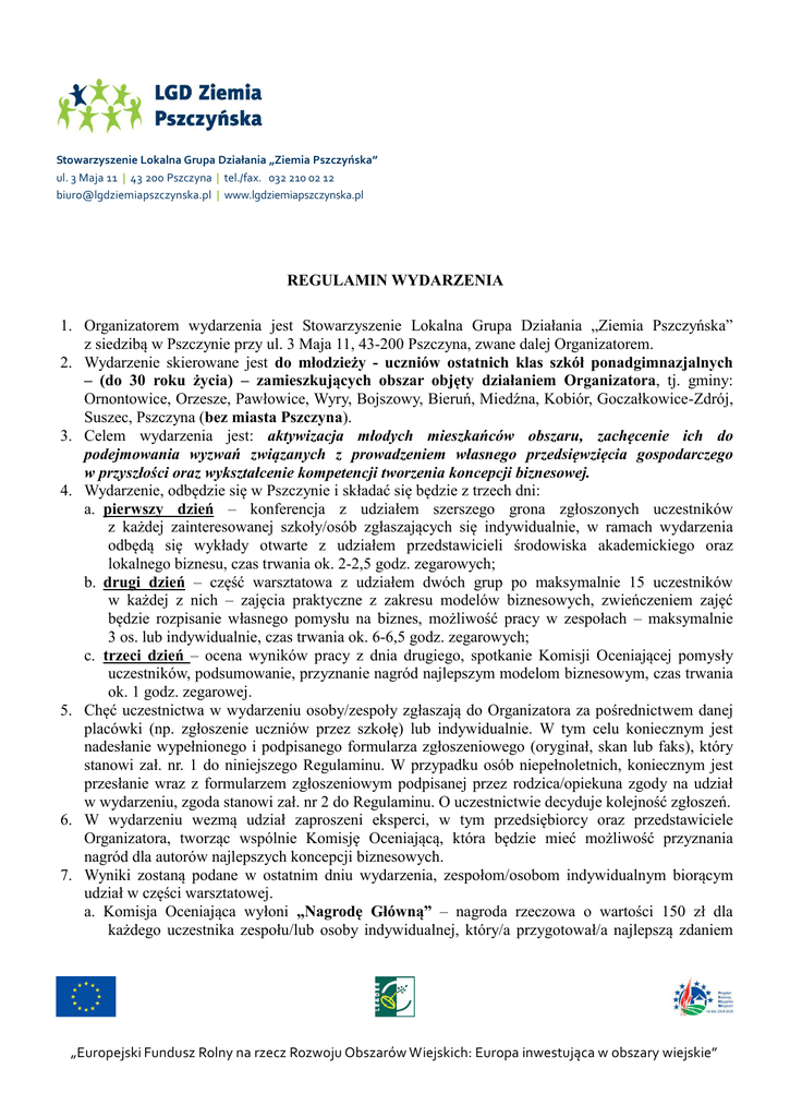 Stowarzyszenie Lokalna Grupa Działania „Ziemia Pszczyńska” ul. 3 Maja 11 | 43 200 Pszczyna | tel./fax. 032 210 02 12 [email protected] | www.lgdziemiapszczynska.pl REGULAMIN WYDARZENIA 1. Organizatorem wydarzenia jest Stowarzyszenie Lokalna Grupa Działania „Ziemia Pszczyńska” z siedzibą w Pszczynie przy ul. 3 Maja 11, 43-200 Pszczyna, zwane dalej Organizatorem. 2. Wydarzenie skierowane jest do młodzieży - uczniów ostatnich klas szkół ponadgimnazjalnych – (do 30 roku życia) – zamieszkujących obszar objęty działaniem Organizatora, tj. gminy: Ornontowice, Orzesze, Pawłowice, Wyry, Bojszowy, Bieruń, Miedźna, Kobiór, Goczałkowice-Zdrój, Suszec, Pszczyna (bez miasta Pszczyna). 3. Celem wydarzenia jest: aktywizacja młodych mieszkańców obszaru, zachęcenie ich do podejmowania wyzwań związanych z prowadzeniem własnego przedsięwzięcia gospodarczego w przyszłości oraz wykształcenie kompetencji tworzenia koncepcji biznesowej. 4. Wydarzenie, odbędzie się w Pszczynie i składać się będzie z trzech dni: a. pierwszy dzień – konferencja z udziałem szerszego grona zgłoszonych uczestników z każdej zainteresowanej szkoły/osób zgłaszających się indywidualnie, w ramach wydarzenia odbędą się wykłady otwarte z udziałem przedstawicieli środowiska akademickiego oraz lokalnego biznesu, czas trwania ok. 2-2,5 godz. zegarowych; b. drugi dzień – część warsztatowa z udziałem dwóch grup po maksymalnie 15 uczestników w każdej z nich – zajęcia praktyczne z zakresu modelów biznesowych, zwieńczeniem zajęć będzie rozpisanie własnego pomysłu na biznes, możliwość pracy w zespołach – maksymalnie 3 os. lub indywidualnie, czas trwania ok. 6-6,5 godz. zegarowych; c. trzeci dzień – ocena wyników pracy z dnia drugiego, spotkanie Komisji Oceniającej pomysły uczestników, podsumowanie, przyznanie nagród najlepszym modelom biznesowym, czas trwania ok. 1 godz. zegarowej. 5. Chęć uczestnictwa w wydarzeniu osoby/zespoły zgłaszają do Organizatora za pośrednictwem danej placówki (np. zgłoszenie uczniów przez szkołę) lub indywidualnie. W tym celu koniecznym jest nadesłanie wypełnionego i podpisanego formularza zgłoszeniowego (oryginał, skan lub faks), który stanowi zał. nr. 1 do niniejszego Regulaminu. W przypadku osób niepełnoletnich, koniecznym jest przesłanie wraz z formularzem zgłoszeniowym podpisanej przez rodzica/opiekuna zgody na udział w wydarzeniu, zgoda stanowi zał. nr 2 do Regulaminu. O uczestnictwie decyduje kolejność zgłoszeń. 6. W wydarzeniu wezmą udział zaproszeni eksperci, w tym przedsiębiorcy oraz przedstawiciele Organizatora, tworząc wspólnie Komisję Oceniającą, która będzie mieć możliwość przyznania nagród dla autorów najlepszych koncepcji biznesowych. 7. Wyniki zostaną podane w ostatnim dniu wydarzenia, zespołom/osobom indywidualnym biorącym udział w części warsztatowej. a. Komisja Oceniająca wyłoni „Nagrodę Główną” – nagroda rzeczowa o wartości 150 zł dla każdego uczestnika zespołu/lub osoby indywidualnej, który/a przygotował/a najlepszą zdaniem „Europejski Fundusz Rolny na rzecz Rozwoju Obszarów Wiejskich: Europa inwestująca w obszary wiejskie” Komisji Oceniającej koncepcję biznesową. Nagroda nie może zostać zamieniona na równowartość pieniężną. b. Dodatkowo Organizator ma możliwość przyznania „Nagrody LGD”, tj. objęcie wsparciem doradczym autorów wybranej koncepcji biznesowej w zakresie pozyskania środków unijnych w ramach Programu Rozwoju Obszarów Wiejskich na lata 2014-2020 w wymiarze 4 godz. zegarowych, w sytuacji gdy koncepcja zespołu wpisywać będzie się w założenia przedmiotowego programu. c. Komisja Oceniająca może również przyznać dodatkowe wyróżnienia. Organizator zastrzega sobie prawo do zmiany formy i wysokości nagród, w momencie gdy przyczyny zmian, będą niezależne od niego. 8. Organizator podczas trwania wydarzenia zapewnia poczęstunek dla wszystkich uczestników. 9. Każdy uczestnik, przystępujący do wydarzenia wyraża zgodę na rozpowszechnienie swojego wizerunku, podczas wydarzenia zostaną bowiem wykonane zdjęcia oraz materiał audiowizualny, celem udokumentowania realizacji zadania oraz promocji działań podejmowanych przez Organizatora. Materiały mogą zostać wykorzystane przez Organizatora w działaniach sprawozdawczych przed instytucjami wdrażającymi i rozliczającymi realizację Programu Rozwoju Obszarów Wiejskich na lata 2014-2020, a także w drukowanych przez Organizatora materiałach informacyjno-promocyjnych, na stronie internetowej oraz profilu facebook Organizatora oraz stronie pless.pl. 10. Niniejszy regulamin zostaje przyjęty uchwałą Zarządu Stowarzyszenia Lokalna Grupa Działania „Ziemia Pszczyńska”. Organizator zastrzega sobie prawo do zmiany niniejszego regulaminu. „Europejski Fundusz Rolny na rzecz Rozwoju Obszarów Wiejskich: Europa inwestująca w obszary wiejskie” Załącznik nr 1 FORMULARZ ZGŁOSZENIOWY do udziału w wydarzeniu organizowanym przez Stowarzyszenie Lokalna Grupa Działania „Ziemia Pszczyńska” w dniach ……………… 2016 r. Imię i nazwisko Miejsce zamieszkania Tel. kontaktowy E. mail. Rok urodzenia* Nazwa szkoły/ profil klasy W zajęciach warsztatowych (II dzień) będę pracować zespołowo** TAK NIE Proszę podać imię/imiona i nazwisko/nazwiska osoby/osób, z którymi będzie tworzony zespół * W przypadku osób niepełnoletnich prosi się o dołączenie wypełnionej zgody rodziców na udział dziecka/podopiecznego w wyjeździe, zgodnie z udostępnionym formularzem. ** Właściwe podkreślić Oświadczam, iż zapoznałem się z regulaminem wydarzenia i akceptuję jego treść w całości. ……………..……………… Podpis uczestnika wydarzenia Administratorem danych osobowych jest Stowarzyszenie Lokalna Grupa Działania „Ziemia Pszczyńska” z siedzibą przy ul. 3 Maja 11, 43-200 Pszczyna (zwane dalej LGD). Z