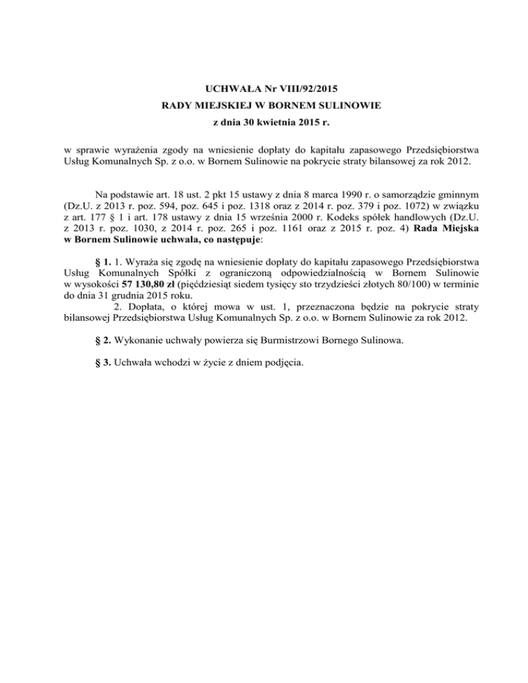 Uchwała Nr VIII/92/2015 - BIP Urząd Miejski w Bornem Sulinowie