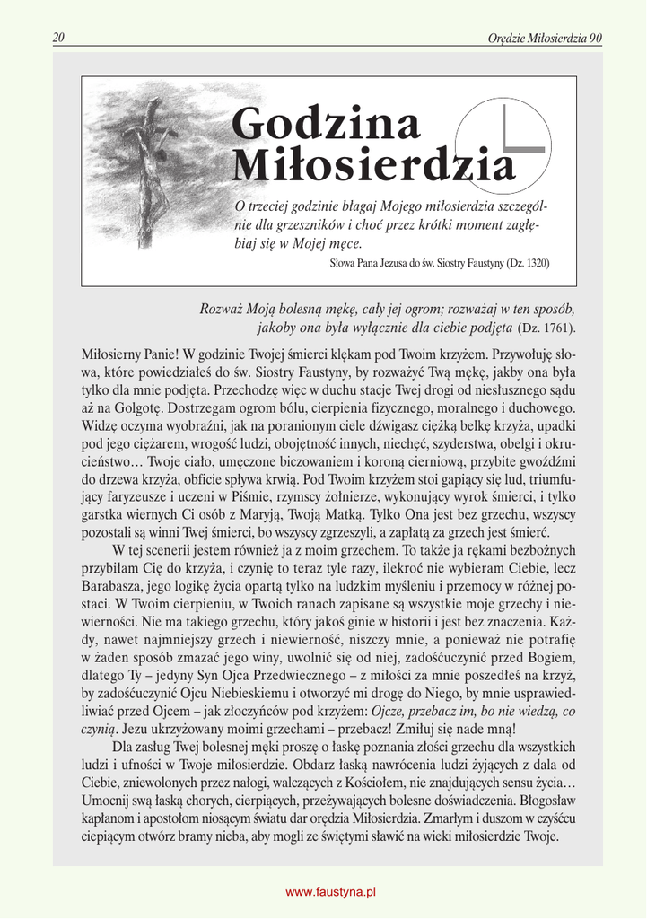 20 Orędzie Miłosierdzia 90 Godzina Miłosierdzia O trzeciej godzinie błagaj Mojego miłosierdzia szczególnie dla grzeszników i choć przez krótki moment zagłębiaj się w Mojej męce. Słowa Pana Jezusa do św. Siostry Faustyny (Dz. 1320) Rozważ Moją bolesną mękę, cały jej ogrom; rozważaj w ten sposób, jakoby ona była wyłącznie dla ciebie podjęta (Dz. 1761). Miłosierny Panie! W godzinie Twojej śmierci klękam pod Twoim krzyżem. Przywołuję słowa, które powiedziałeś do św. Siostry Faustyny, by rozważyć Twą mękę, jakby ona była tylko dla mnie podjęta. Przechodzę więc w duchu stacje Twej drogi od niesłusznego sądu aż na Golgotę. Dostrzegam ogrom bólu, cierpienia fizycznego, moralnego i duchowego. Widzę oczyma wyobraźni, jak na poranionym ciele dźwigasz ciężką belkę krzyża, upadki pod jego ciężarem, wrogość ludzi, obojętność innych, niechęć, szyderstwa, obelgi i okrucieństwo… Twoje ciało, umęczone biczowaniem i koroną cierniową, przybite gwoźdźmi do drzewa krzyża, obficie spływa krwią. Pod Twoim krzyżem stoi gapiący się lud, triumfujący faryzeusze i uczeni w Piśmie, rzymscy żołnierze, wykonujący wyrok śmierci, i tylko garstka wiernych Ci osób z Maryją, Twoją Matką. Tylko Ona jest bez grzechu, wszyscy pozostali są winni Twej śmierci, bo wszyscy zgrzeszyli, a zapłatą za grzech jest śmierć. W tej scenerii jestem również ja z moim grzechem. To także ja rękami bezbożnych przybiłam Cię do krzyża, i czynię to teraz tyle razy, ilekroć nie wybieram Ciebie, lecz Barabasza, jego logikę życia opartą tylko na ludzkim myśleniu i przemocy w różnej postaci. W Twoim cierpieniu, w Twoich ranach zapisane są wszystkie moje grzechy i niewierności. Nie ma takiego grzechu, który jakoś ginie w historii i jest bez znaczenia. Każdy, nawet najmniejszy grzech i niewierność, niszczy mnie, a ponieważ nie potrafię w żaden sposób zmazać jego winy, uwolnić się od niej, zadośćuczynić przed Bogiem, dlatego Ty – jedyny Syn Ojca Przedwiecznego – z miłości za mnie poszedłeś na krzyż, by zadośćuczynić Ojcu Niebieskiemu i otworzyć mi drogę do Niego, by mnie usprawiedliwiać przed Ojcem – jak złoczyńców pod krzyżem: Ojcze, przebacz im, bo nie wiedzą, co czynią. Jezu ukrzyżowany moimi grzechami – przebacz! Zmiłuj się nade mną! Dla zasług Twej bolesnej męki proszę o łaskę poznania złości grzechu dla wszystkich ludzi i ufności w Twoje miłosierdzie. Obdarz łaską nawrócenia ludzi żyjących z dala od Ciebie, zniewolonych przez nałogi, walczących z Kościołem, nie znajdujących sensu życia… Umocnij swą łaską chorych, cierpiących, przeżywających bolesne doświadczenia. Błogosław kapłanom i apostołom niosącym światu dar orędzia Miłosierdzia. Zmarłym i duszom w czyśćcu ciepiącym otwórz bramy nieba, aby mogli ze świętymi sławić na wieki miłosierdzie Twoje. www.faustyna.pl
