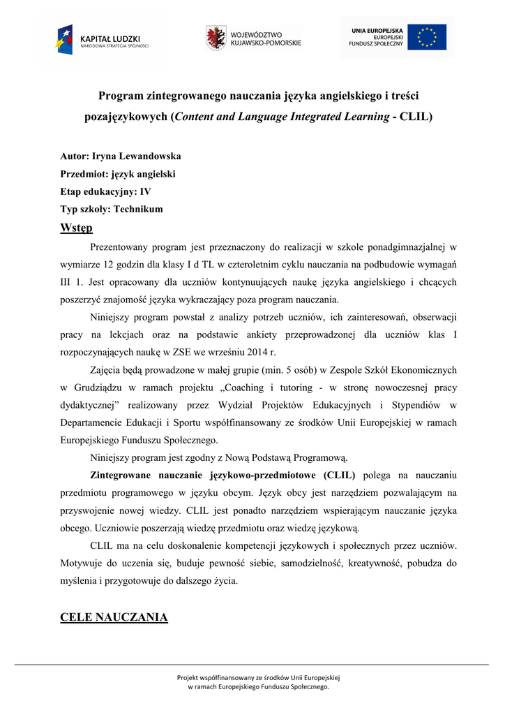 Program zintegrowanego nauczania języka angielskiego i treści pozajęzykowych (Content and Language Integrated Learning - CLIL) Autor: Iryna Lewandowska Przedmiot: język angielski Etap edukacyjny: IV Typ szkoły: Technikum Wstęp Prezentowany program jest przeznaczony do realizacji w szkole ponadgimnazjalnej w wymiarze 12 godzin dla klasy I d TL w czteroletnim cyklu nauczania na podbudowie wymagań III 1. Jest opracowany dla uczniów kontynuujących naukę języka angielskiego i chcących poszerzyć znajomość języka wykraczający poza program nauczania. Niniejszy program powstał z analizy potrzeb uczniów, ich zainteresowań, obserwacji pracy na lekcjach oraz na podstawie ankiety przeprowadzonej dla uczniów klas I rozpoczynających naukę w ZSE we wrześniu 2014 r. Zajęcia będą prowadzone w małej grupie (min. 5 osób) w Zespole Szkół Ekonomicznych w Grudziądzu w ramach projektu „Coaching i tutoring - w stronę nowoczesnej pracy dydaktycznej” realizowany przez Wydział Projektów Edukacyjnych i Stypendiów w Departamencie Edukacji i Sportu współfinansowany ze środków Unii Europejskiej w ramach Europejskiego Funduszu Społecznego. Niniejszy program jest zgodny z Nową Podstawą Programową. Zintegrowane nauczanie językowo-przedmiotowe (CLIL) polega na nauczaniu przedmiotu programowego w języku obcym. Język obcy jest narzędziem pozwalającym na przyswojenie nowej wiedzy. CLIL jest ponadto narzędziem wspierającym nauczanie języka obcego. Uczniowie poszerzają wiedzę przedmiotu oraz wiedzę językową. CLIL ma na celu doskonalenie kompetencji językowych i społecznych przez uczniów. Motywuje do uczenia się, buduje pewność siebie, samodzielność, kreatywność, pobudza do myślenia i przygotowuje do dalszego życia. CELE NAUCZANIA Projekt współfinansowany ze środków Unii Europejskiej w ramach Europejskiego Funduszu Społecznego. CEL GŁÓWNY Celem programu jest uczenie się języka angielskiego oraz poszerzenie wiedzy o przedmiotach innych niż języki obce, przygotowanie się do nauki języka na dalszych etapach kształcenia; wzmocnienie motywacji i zainteresowań ucznia, rozwijanie i doskonalenie kompetencji kluczowych oraz wzbogacenie oferty szkoły. CELE OGÓLNE KSZTAŁCENIA I WYCHOWANIA – UMIEJĘTNOŚCI PONADPRZEDMIOTOWE • rozwijanie kompetencji kluczowych • rozwijanie umiejętności myślenia i uczenia się • zwiększenie motywacji do uczenia się • budowanie pewności, samodzielności i kreatywności • rozwijanie umiejętności wyszukiwania, selekcjonowania i krytycznej analizy informacji z różnych źródeł • rozwijanie umiejętności sprawnego posługiwania się technologiami informacyjnokomunikacyjnymi do poszerzenia wiedzy i umiejętności z różnych dziedzin • umiejętność rozpoznawania własnych potrzeb edukacyjnych oraz uczenia się • umiejętność pracy w zespole CELE PROGRAMU WYNIKAJĄCE Z ZADAŃ SZKOŁY • przygotowanie uczniów do życia w społeczeństwie informacyjnym • przygotowanie uczniów do pracy w zespole • przygotowanie uczniów do wyjścia na rynek pracy • rozwijanie umiejętności interpersonalnych i interkulturalnych • indywidualizacja nauczania • umiejętność zbierania i wykorzystywania informacji CELE SZCZEGÓŁOWE • rozwijanie sprawności językowych • wzbogacenie środków językowych • wprowadzenie słownictwa specjalistycznego • konstruowanie wypowiedzi ustnych i pisemnych Projekt współfinansowany ze środków Unii Europejskiej w ramach Europejskiego Funduszu Społecznego. FORMY PRACY • praca w grupach • praca w parach w czasie trwania lekcji • praca samodzielna na lekcji • samodzielna praca ucznia w domu METODY PRACY • podejście leksykalne • metoda komunikacyjna • metoda naturalna • metoda projektu TECHNIKI NAUCZANIA • pytania i odpowiedzi • dyskusja • dialog • notatka • projekt MATERIAŁY NAUCZANIA • podręczniki • materiały własne • słowniki • Internet • komputer • magnetofon TREŚCI NAUCZANIA 1. IT CLIL: Technologie informacyjno-komunikacyjne - praca z tekstem. 2. IT CLIL: Sieci społecznościowe – za i przeciw - prowadzenie dyskusji 3. IT CLIL : Blogging – jak założyc własny blog? 4. GEOGRAPHY CLIL: Woda. Znaczenie wody w życiu człowieka – układanie wypowiedzi, uzupełnienie krzyżówki. Projekt współfinansowany ze środków Unii Europejskiej w ramach Europejskiego Funduszu Społecznego. 5. GEOGRAPHY CLIL: Świat wody – praca z tekstem. 6. GEOGRAPHY CLIL: Obieg wody i powódź. 7. GEOGRAPHY CLIL: Ekoturystyka- praca z tekstem. 8. GEOGRAPHY CLIL : Ekoturystyka. Planowanie wakacji. 9. SCIENCE CLIL: Organizm człowieka. 10. SCIENCE CLIL : Jedzenie i żywienie – praca z tekstem. 11. SCIENCE CLIL: Zdrowy tryb życia – układanie wypowiedzi. 12. Własny projekt. EWALUACJA PROGRAMU Ewaluacja programu zostanie przeprowadzona na ostatnich zajęciach w formie ankiety. BIBLIOGRAFIA 1. Bandis A., Nicholas R. (2010) CODE RED, Workbook, Macmillan 2. Birdsall M., Timesaver Cross-curricular English Activities, Mary Glasgow Magazines, Scholastic 3. CLIL worksheets, New Inspiration, Macmillan 4. Grieveson M., Superfine W., The CLIL RESOURCE PACK, Delta Publishing 5. Stiles E. (2010) CODE GREEN, Workbook, Macmillan Projekt współfinansowany ze środków Unii Europejskiej w ramach Europejskiego Funduszu Społecznego.