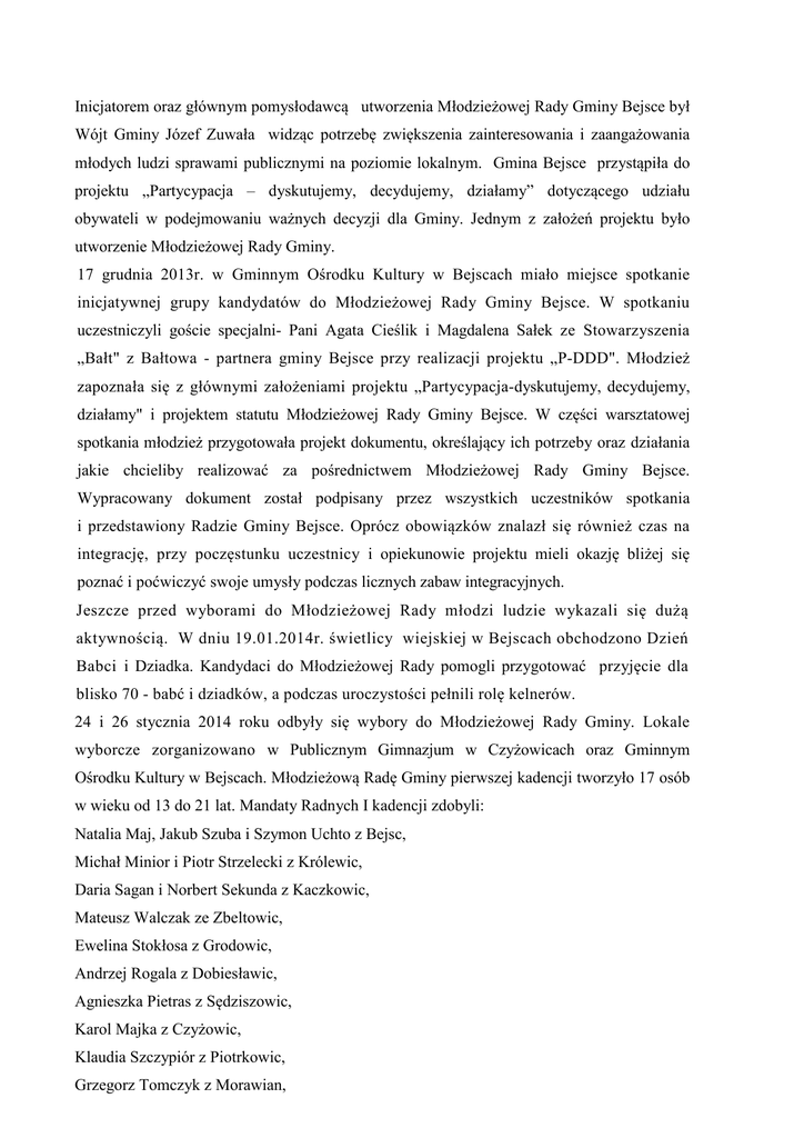 Inicjatorem oraz głównym pomysłodawcą utworzenia Młodzieżowej Rady Gminy Bejsce był Wójt Gminy Józef Zuwała widząc potrzebę zwiększenia zainteresowania i zaangażowania młodych ludzi sprawami publicznymi na poziomie lokalnym. Gmina Bejsce przystąpiła do projektu „Partycypacja – dyskutujemy, decydujemy, działamy” dotyczącego udziału obywateli w podejmowaniu ważnych decyzji dla Gminy. Jednym z założeń projektu było utworzenie Młodzieżowej Rady Gminy. 17 grudnia 2013r. w Gminnym Ośrodku Kultury w Bejscach miało miejsce spotkanie inicjatywnej grupy kandydatów do Młodzieżowej Rady Gminy Bejsce. W spotkaniu uczestniczyli goście specjalni- Pani Agata Cieślik i Magdalena Sałek ze Stowarzyszenia „Bałt" z Bałtowa - partnera gminy Bejsce przy realizacji projektu „P-DDD". Młodzież zapoznała się z głównymi założeniami projektu „Partycypacja-dyskutujemy, decydujemy, działamy" i projektem statutu Młodzieżowej Rady Gminy Bejsce. W części warsztatowej spotkania młodzież przygotowała projekt dokumentu, określający ich potrzeby oraz działania jakie chcieliby realizować za pośrednictwem Młodzieżowej Rady Gminy Bejsce. Wypracowany dokument został podpisany przez wszystkich uczestników spotkania i przedstawiony Radzie Gminy Bejsce. Oprócz obowiązków znalazł się również czas na integrację, przy poczęstunku uczestnicy i opiekunowie projektu mieli okazję bliżej się poznać i poćwiczyć swoje umysły podczas licznych zabaw integracyjnych. Jeszcze przed wyborami do Młodzieżowej Rady młodzi ludzie wykazali się dużą aktywnością. W dniu 19.01.2014r. świetlicy wiejskiej w Bejscach obchodzono Dzień Babci i Dziadka. Kandydaci do Młodzieżowej Rady pomogli przygotować przyjęcie dla blisko 70 - babć i dziadków, a podczas uroczystości pełnili rolę kelnerów. 24 i 26 stycznia 2014 roku odbyły się wybory do Młodzieżowej Rady Gminy. Lokale wyborcze zorganizowano w Publicznym Gimnazjum w Czyżowicach oraz Gminnym Ośrodku Kultury w Bejscach. Młodzieżową Radę Gminy pierwszej kadencji tworzyło 17 osób w wieku od 13 do 21 lat. Mandaty Radnych I kadencji zdobyli: Natalia Maj, Jakub Szuba i Szymon Uchto z Bejsc, Michał Minior i Piotr Strzelecki z Królewic, Daria Sagan i Norbert Sekunda z Kaczkowic, Mateusz Walczak ze Zbeltowic, Ewelina Stokłosa z Grodowic, Andrzej Rogala z Dobiesławic, Agnieszka Pietras z Sędziszowic, Karol Majka z Czyżowic, Klaudia Szczypiór z Piotrkowic, Grzegorz Tomczyk z Morawian, Żaneta Skowron z Kijan, Patryk Pietraszak z Uściszowic, Adrian Niedźwiedź z Morawianek. 13 lutego 2014r. odbyła się pierwsza sesja Młodzieżowej Rady Gminy Bejsce Była to pierwsza w historii sesja, w której brały udział aż dwie Rady: Rada Gminy Bejsce i Młodzieżowa Rada Gminy Bejsce. „Dorosła Rada” po podjęciu zaplanowanych w porządku obrad uchwał ustąpiła miejsca młodzieży. Młodzieżowi Radni otrzymali z rąk Przewodniczącej Komisji Wyborczej zaświadczenia potwierdzające wybór na radnego. Początkowo obrady prowadził najstarszy wiekiem Młodzieżowy Radny. Po uroczystym ślubowaniu w obecności Wójta Gminy Bejsce, Sekretarza Gminy Bejsce, Rady Gminy Bejsce , Sołtysów oraz gości z partnerskiego Stowarzyszenia na Rzecz Rozwoju Gminy Bałtów „ Bałt", utworzona została komisja skrutacyjna, której zadaniem było wyłonienie władz Młodzieżowej Rady. Młodzieżowa Rada dokonała wyboru swojego przewodniczącego, zastępcy, sekretarza, a także przedstawicieli Komisji Rewizyjnej. W dniu 2.03.2014r. w Publicznym Gimnazjum w Czyżowicach najmłodsi mieszkańcy gminy Bejsce żegnali Karnawał. Bal karnawałowy dla dzieci zorganizowało Stowarzyszenie na Rzecz Rozwoju Gminy Bejsce, przy wsparciu Młodzieżowej Rady Gminy . Młodzi radni wcielali się w rolę animatorów. Było wiele atrakcji: teatrzyk dla najmłodszych, konkursy dla dzieci i opiekunów, malowanie buziek, kolorowe zwierzątka z baloników, a zabawy taneczne dla dzieci prowadził Wodzirej. W marcu 2014r. Młodzieżowa Rada Gminy Bejsce zajęła 2 miejsce w konkursie na młodzieżową inicjatywę obywatelską w ramach projektu „Partycypacja - dyskutujemy, decydujemy, działamy. Młodzieżowa Rada zgłosiła swój projekt pod nazwą: „Dziś taka era, że bez komputera ani rusz - zrobimy wszystko, by Dziadzio z Babcią nie bali się Windowsa już". Projekt zakładał przeprowadzenie bezpłatnych kursów komputerowych dla seniorów. Nagrodą za zajęcie 2 miejsca był wyjazd do Francji dla trzech przedstawicieli Rady oraz 3 tys. zł na realizację kursu dla seniorów. W dniach 5 - 13 kwietnia 2014r. 34-osobowa grupa przedstawicieli samorządów w tym 3 osobowa delegacja Młodzieżowych Radnych z Bejsc, wzięła udział w wizycie studyjnej do Francji. Celem wizyty było poznanie dobrych praktyk z rozwijania demokracji partycypacyjnej w tym kraju, sposobów współpracy samorządu z lokalną społecznością, zasad funkcjonowania rad młodzieżowych. W kwietniu 2014r. odbyła się druga sesja Młodzieżowej Rady Gminy Bejsce. Głównymi tematami posiedzenia były: dyskusja na temat Strategii Rozwoju Gminy Bejsce na lata 2014- 2020 oraz realizacja nagrodzonej wyjazdem do Francji - młodzieżowej inicjatywy. Podczas obrad Radnym rozdane zostały ankiety, w których mogli wyrazić swoje zdanie na temat zagrożeń i atutów Gminy, obszarów, które wymagają szczególnej interwencji władz gmin oraz ocenić funkcjonowanie np. obiektów rekreacyjno- sportowych oraz Urzędu Gminy. Młodzieżowi Radni wzięli udział również w organizacji uroczystości „Dni Bejsc 2014", które odbyły się 01.06.14r. czyli w Dzień Dziecka. Na swoim stoisku promocyjnym tworzyli bajkowe makijaże dla dzieci. Oprócz aktywnych działań na terenie gminy, młodzież brała również udział w wyjazdach szkoleniowych. Przedstawiciele Młodzieżowej Rady Gminy brali udział w 3-dniowym szkoleniu w Toporzyskach. Warsztaty były dla członków M