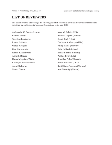 Annals of Parasitology 2013, 59(4) 211 Copyright© 2013 Polish Parasitological Society LIST OF REVIEWERS The Editors wish to acknowledge the following scientists who have served as Reviewers for manuscripts submitted for publication in Annals of Parasitology in the year 2013: Aleksander W. Demiaszkiewicz Jerzy M. Behnke (UK) Elżbieta Gołąb Bertrand Dupont (France) Stanisław Ignatowicz Gerald Esch (USA) Joanna Izdebska Thaddeus K. Graczyk (USA) Wanda Kocięcka Phillip Harris (Norway) Piotr Kurnatowski Celia Holland (Ireland) Jolanta Kwaśniewska Jaakko Lumme (Finland) Anna B. Macura Wallace Peters (UK) Hanna Mizgajska-Wiktor Branislav Petko (Slovakia) Katarzyna Niewiadomska Robert Schwartz (USA) Anna Okulewicz Babill Stray-Pedersen (Norway) Marek Ziętara Anti Vasemägi (Finland)