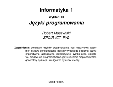 Zagadnienia: generacje języków progamowania, kod maszynowy, asembler, drzewo genealogiczne języków wysokiego poziomu, języki: