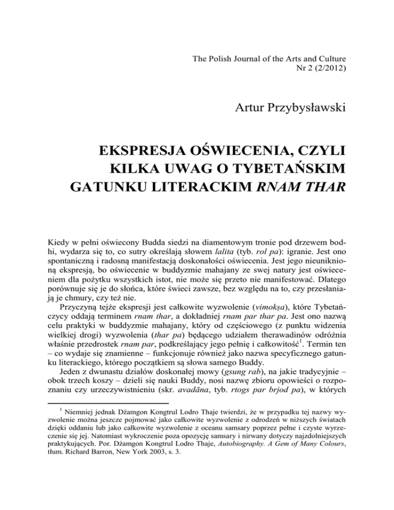 The Polish Journal of the Arts and Culture Nr 2 (2/2012) Artur Przybysławski EKSPRESJA OŚWIECENIA, CZYLI KILKA UWAG O TYBETAŃSKIM GATUNKU LITERACKIM RNAM THAR Kiedy w pełni oświecony Budda siedzi na diamentowym tronie pod drzewem bodhi, wydarza się to, co sutry określają słowem lalita (tyb. rol pa): igranie. Jest ono spontaniczną i radosną manifestacją doskonałości oświecenia. Jest jego nieuniknioną ekspresją, bo oświecenie w buddyzmie mahajany ze swej natury jest oświeceniem dla pożytku wszystkich istot, nie może się przeto nie manifestować. Dlatego porównuje się je do słońca, które świeci zawsze, bez względu na to, czy przesłaniają je chmury, czy też nie. Przyczyną tejże ekspresji jest całkowite wyzwolenie (vimokṣa), które Tybetańczycy oddają terminem rnam thar, a dokładniej rnam par thar pa. Jest ono nazwą celu praktyki w buddyzmie mahajany, który od częściowego (z punktu widzenia wielkiej drogi) wyzwolenia (thar pa) będącego udziałem therawadinów odróżnia właśnie przedrostek rnam par, podkreślający jego pełnię i całkowitość1. Termin ten – co wydaje się znamienne – funkcjonuje również jako nazwa specyficznego gatunku literackiego, którego początkiem są słowa samego Buddy. Jeden z dwunastu działów doskonałej mowy (gsung rab), na jakie tradycyjnie – obok trzech koszy – dzieli się nauki Buddy, nosi nazwę zbioru opowieści o rozpoznaniu czy urzeczywistnieniu (skr. avadāna, tyb. rtogs par brjod pa), w których 1 Niemniej jednak Dźamgon Kongtrul Lodro Thaje twierdzi, że w przypadku tej nazwy wyzwolenie można jeszcze pojmować jako całkowite wyzwolenie z odrodzeń w niższych światach dzięki oddaniu lub jako całkowite wyzwolenie z oceanu samsary poprzez pełne i czyste wyrzeczenie się jej. Natomiast wykroczenie poza opozycję samsary i nirwany dotyczy najzdolniejszych praktykujących. Por. Dźamgon Kongtrul Lodro Thaje, Autobiography. A Gem of Many Colours, tłum. Richard Barron, New York 2003, s. 3. 126 Artur Przybysławski ____________________________________________________________________________________________________________________________________________________________________________________________________________________________________________ Budda opowiada o swojej drodze do oświecenia, do całkowitego rozpoznania natury umysłu. Literatura tybetańska jednak znacznie chętniej posługuje się w tym wypadku właśnie terminem rnam thar, daleko bardziej rozpowszechnionym i używanym jako odpowiednik sanskryckiego avadāna na określenie duchowej biografii buddyjskich mistrzów. Fakt, iż nazwę „opowieść o urzeczywistnieniu” zastąpiono słowem „całkowite urzeczywistnienie”, jest znamienny: przesuwa akcent z samej opowieści o czymś na to, o czym się opowiada. Zamiast opowieści (brjod pa) o urzeczywistnieniu (rtogs pa) mamy zatem samo urzeczywistnienie, które można traktować jako synonim wyzwolenia (thar pa). Nie w tym rzecz, że się opowiada, lecz w tym, o czym się opowiada. Ten fakt sprawia, iż rnam thar jako gatunek literacki nie może być ograniczony do czystej literatury jako opowieści. Musi być rozpatrywany w szerszym kontekście swej funkcji, jaką pełni w praktyce buddyjskiej zakładającej konkretny światopogląd. Oto bowiem sama relacja (brjod pa) staje się sprawą drugorzędną wobec tego, co relacjonuje (rtogs pa lub rnam thar). Nie w tym rzecz zatem, żeby opowiadać o oświeceniu i o nim słuchać lub czytać, lecz by je osiągnąć, by zdobyć całkowite wyzwolenie. rnam thar nie jest więc zwykłą biografią lub dziejopisarstwem w rodzaju greckich opowieści. Greckie relacje o czynach Aleksandra Wielkiego są po prostu historią, utrwaleniem faktów, które mają być ocalone od zapomnienia. Zasadniczo jednak nie mają one stanowić zachęty dla każdego czytelnika do podboju Indii lub do walki z Persami. Opowieść o dwunastu czynach Buddy i o życiu wielkich mistrzów ma zaś pokazywać drogę, która stoi otworem przed każdym, kto będzie chciał się nią udać. Nieprzypadkowo zatem biografia Milarepy ma podtytuł „Ukazanie ścieżki wyzwolenia i wszechwiedzy” (thar pa dang thams cad mkhyen pa’i lam ston). Rozważanie rnam thar jedynie w kategoriach prawdy historycznej jest więc przedsięwzięciem chybionym już w punkcie wyjścia, albowiem pierwszą i najważniejszą intencją tego rodzaju dzieł nie jest reporterska wierność faktom. Hagiografia nie wyczerpuje się w historiografii. Motywacją, jaka stoi za tymi opowieściami, jest motywacja bodhisattwy chcącego wszystkie istoty doprowadzić do całkowitego wyzwolenia. Taki właśnie jest kontekst, w jakim Budda rozpoczyna opowieść o swym życiu w Lalitavistara Sūtra, albowiem jest ona odpowiedzią na następującą prośbę: Niechże Bhagawan łaskawie udzieli należycie wielu nauk [zwanych] lalitavistara, które są lekiem dla wielu istot, radością dla wielu istot, spełnieniem miłości do świata; które są pożytkiem, lekiem i radością dla zastępów istot, bogów i ludzi, bodhisattwów-mahasattwów czasów obecnych i przyszłych. bcom ldan ‘das rgya cher rol pa’i chos kyi grangs legs par bstan du gsol/ de ni skye bi mang po la sman pa dang/ skye bo mang po la bde ba dang/ ‘jig rten la thugs brtse ba mdzad pa dang/ skye bo phal po che dang/ lha dang mi rnams dang/ da ltar dang/ ma ‘ongs pa’i byang chub sems dpa’ sems dapa chen po rnams kyi don dang/ sman pa dang/ bde bar ‘gyur ro zhes gsol ba dang/ ‘phags pa rgya cher rol pa zhes bya ba theg pa chen po’i mdo 14 Ekspresja oświecenia, czyli kilka uwag o tybetańskim gatunku literackim... 127 ____________________________________________________________________________________________________________________________________________________________________________________________________________________________________________ Ten charakterystyczny fragment mówi również o randze tych nauk, które nie