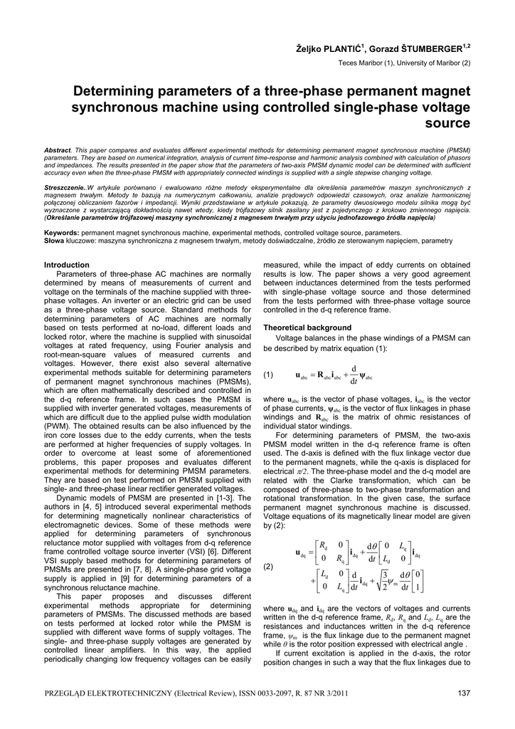 Željko PLANTIĆ1, Gorazd ŠTUMBERGER1,2 Teces Maribor (1), University of Maribor (2) Determining parameters of a three-phase permanent magnet synchronous machine using controlled single-phase voltage source Abstract. This paper compares and evaluates different experimental methods for determining permanent magnet synchronous machine (PMSM) parameters. They are based on numerical integration, analysis of current time-response and harmonic analysis combined with calculation of phasors and impedances. The results presented in the paper show that the parameters of two-axis PMSM dynamic model can be determined with sufficient accuracy even when the three-phase PMSM with appropriately connected windings is supplied with a single stepwise changing voltage. Streszczenie..W artykule porównano i ewaluowano różne metody eksperymentalne dla określenia parametrów maszyn synchronicznych z magnesem trwałym. Metody te bazują na numerycznym całkowaniu, analizie prądowych odpowiedzi czasowych, oraz analizie harmonicznej połączonej obliczaniem fazorów i impedancji. Wyniki przedstawiane w artykule pokazują, że parametry dwuosiowego modelu silnika mogą być wyznaczone z wystarczającą dokładnością nawet wtedy, kiedy trójfazowy silnik zasilany jest z pojedynczego z krokowo zmiennego napięcia. (Określanie parametrów trójfazowej maszyny synchronicznej z magnesem trwałym przy użyciu jednofazowego źródła napięcia) Keywords: permanent magnet synchronous machine, experimental methods, controlled voltage source, parameters. Słowa kluczowe: maszyna synchroniczna z magnesem trwałym, metody doświadczalne, źródło ze sterowanym napięciem, parametry Introduction Parameters of three-phase AC machines are normally determined by means of measurements of current and voltage on the terminals of the machine supplied with threephase voltages. An inverter or an electric grid can be used as a three-phase voltage source. Standard methods for determining parameters of AC machines are normally based on tests performed at no-load, different loads and locked rotor, where the machine is supplied with sinusoidal voltages at rated frequency, using Fourier analysis and root-mean-square values of measured currents and voltages. However, there exist also several alternative experimental methods suitable for determining parameters of permanent magnet synchronous machines (PMSMs), which are often mathematically described and controlled in the d-q reference frame. In such cases the PMSM is supplied with inverter generated voltages, measurements of which are difficult due to the applied pulse width modulation (PWM). The obtained results can be also influenced by the iron core losses due to the eddy currents, when the tests are performed at higher frequencies of supply voltages. In order to overcome at least some of aforementioned problems, this paper proposes and evaluates different experimental methods for determining PMSM parameters. They are based on test performed on PMSM supplied with single- and three-phase linear rectifier generated voltages. Dynamic models of PMSM are presented in [1-3]. The authors in [4, 5] introduced several experimental methods for determining magnetically nonlinear characteristics of electromagnetic devices. Some of these methods were applied for determining parameters of synchronous reluctance motor supplied with voltages from d-q reference frame controlled voltage source inverter (VSI) [6]. Different VSI supply based methods for determining parameters of PMSMs are presented in [7, 8]. A single-phase grid voltage supply is applied in [9] for determining parameters of a synchronous reluctance machine. This paper proposes and discusses different experimental methods appropriate for determining parameters of PMSMs. The discussed methods are based on tests performed at locked rotor while the PMSM is supplied with different wave forms of supply voltages. The single- and three-phase supply voltages are generated by controlled linear amplifiers. In this way, the applied periodically changing low frequency voltages can be easily measured, while the impact of eddy currents on obtained results is low. The paper shows a very good agreement between inductances determined from the tests performed with single-phase voltage source and those determined from the tests performed with three-phase voltage source controlled in the d-q reference frame. Theoretical background Voltage balances in the phase windings of a PMSM can be described by matrix equation (1): (1) u abc R abc i abc d ψabc dt where uabc is the vector of phase voltages, iabc is the vector of phase currents, ψabc is the vector of flux linkages in phase windings and Rabc is the matrix of ohmic resistances of individual stator windings. For determining parameters of PMSM, the two-axis PMSM model written in the d-q reference frame is often used. The d-axis is defined with the flux linkage vector due to the permanent magnets, while the q-axis is displaced for electrical /2. The three-phase model and the d-q model are related with the Clarke transformation, which can be composed of three-phase to two-phase transformation and rotational transformation. In the given case, the surface permanent magnet synchronous machine is discussed. Voltage equations of its magnetically linear model are given by (2): (2) Rd 0 d u dq i dq dt 0 Rq Ld 0 d i dq 0 Lq dt 0 L d Lq i 0 dq 3 d 0 m 2 dt 1 where udq and idq are the vectors of voltages and currents written in the d-q reference frame, Rd, Rq and Ld, Lq are the resistances and inductances written in the d-q reference frame, ψm is the flux linkage due to the permanent magnet while θ is the rotor position expressed with electrical angle . If current excitation is applied in the d-axis, the rotor position changes in such a way that the flux linkages due to PRZEGLĄD ELEKTROTECHNICZNY (Electrical Review), ISSN 0033-2097, R. 87 NR 3/2011 137 supply. The d- and q-axis inductances are determined in the sa
