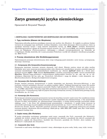 Księgarnia PWN: Józef Wiktorowicz, Agnieszka Frączek (red.) - Wielki słownik niemiecko-polski ˛zyka niemieckiego Zarys gramatyki je Opracował dr Krzysztof Tkaczyk I. MORFOLOGIA I SŁOWOTWÓRSTWO (DIE MORPHOLOGIE UND DIE WORTBILDUNG) 1. Typy morfemów (Klassen der Morpheme) Najmniejsza˛ jednostka˛ je˛zykowa˛ posiadaja˛ca˛ znaczenie jest morfem (das Morphem). Ze wzgle˛du na pełnione funkcje wyróżnia sie˛ naste˛puja˛ce typy morfemów: morfemy leksykalne, zwane także rdzennymi (Stammmorpheme), które sa˛ nośnikami znaczenia wyrazu i moga˛ stanowić samodzielne wyrazy, np. Kind, Kinder, morfemy słowotwórcze (Wortbildungsmorpheme) służa˛ce do tworzenia nowych wyrazów, np. -lich w menschlich, oraz morfemy gramatyczne, zwane też fleksyjnymi (Flexionsmorpheme), informuja˛ce o relacjach wewna˛trzje˛zykowych, np.: końcówka -es w dopełniaczu: Kindes, końcówka -te w czasie przeszłym Präteritum: machte lub rodzajnik w określonym przypadku, np.: dem Freund. 2. Procesy słowotwórcze (Die Wortbildungsprozesse) Najważniejszymi procesami słowotwórczymi, które wcia˛ż wzbogacaja˛ je˛zyk niemiecki o nowe wyrazy, sa˛ kompozycja, derywacja i konwersja. 2.1. Kompozycja (Die Komposition/Zusammensetzung) Kompozycja˛ nazywamy tworzenie wyrazów złożonych, czyli złożeń. Złożenie zawiera wie˛cej niż jeden morfem leksykalny, przy czym zazwyczaj przynajmniej jeden człon złożenia jest samodzielnym wyrazem, pozostałe moga˛ być wyrazami samodzielnymi ba˛dź niesamodzielnymi morfemami, np.: złożenie Apfelsaft składa sie˛ z dwóch samodzielnych wyrazów Apfel + Saft, złożenie Suchmaschine z morfemu czasownikowego such- i wyrazu samodzielnego Maschine. Złożenia moga˛ powstawać z wykorzystaniem mie˛dzyrostków (Interfixe) -e-, -er-, -en-, -es-, -n-, -s-, np.: Arbeitsamt, Eierschale lub bez nich, np.: Fensterbrett, Schreibtisch i moga˛ sie˛ składać z wielu elementów, np.: Maschinenbauindustrie, Hochgeschwindigkeitsinternetzugang. 2.2. Derywacja (Die Derivation/Ableitung) Drugim ważnym procesem słowotwórczym w je˛zyku niemieckim jest derywacja (Derivation/Ableitung), a wie˛c tworzenie wyrazów pochodnych (Derivate) za pomoca˛ zrostków (Affixe). Podstawa˛ derywacji jest wyraz lub morfem leksykalny, z którego, najcze˛ściej poprzez przyrostki (Suffixe) ba˛dź przedrostki (Präfixe), formułuje sie˛ nowe wyrazy, np.: fruchtbar, unmittelbar. Derywaty moga˛ także powstawać przez ła˛czenie ze soba˛ grup wyrazowych, tzw. fraz, np.: . in Stand setzen Þ Instandsetzung, ba˛dź tez poprzez derywacje˛ wewne˛trzna˛ (zerowa˛), na skutek której powstaja˛ wyrazy bezsufiksalne, np.: der Lauf. 2.3. Konwersja (Die Konversion) Konwersja jest natomiast procesem przenoszenia wyrazu do innej klasy wyrazów (cze˛ści mowy) bez zasadniczej zmiany jego formy. Najcze˛ściej spotykana˛ forma˛ konwersji w je˛zyku niemieckim jest substantywizacja, a wie˛c przenoszenie wyrazów do klasy rzeczowników, np. substantywizacja czasowników, w wyniku której powstaja˛ rzeczowniki rodzaju nijakiego: essen Þ das Essen lub substantywizacja przymiotników i imiesłowów, w wyniku której tworzone sa˛ rzeczowniki zachowuja˛ce sie˛ pod wzgle˛dem formalnym jak przymiotniki, np.: krank Þ der/die Kranke, die Kranken, ein . Kranker/eine Kranke, Kranke. Niezwykle zywotnym procesem słowotwórczym współczesnej niemczyzny jest ponadto tworzenie skrótów i skrótowców (Kurzwortbildung), takich jak np.: ARD, BRD, ZDF, GmbH, Auto, Bus i wiele innych, . powstaja˛cych kazdego dnia. 3. Cze ˛ ści mowy (Die Wortarten) W je˛zyku niemieckim wyróżniamy naste˛puja˛ce cze˛ści mowy: czasownik (das Verb), rzeczownik (das Substantiv), rodzajnik (der Artikel), zaimek (das Pronomen), przymiotnik (das Adjektiv), przysłówek (das Adverb), przyimek (die Präposition), spójnik (die Konjunktion), liczebnik (das Numerale), partykułe˛ (die Partikel), słowo modalne (das Modalwort) i wykrzyknik (die Interjektion). 3.1. Czasownik (Das Verb) Czasownik to cze˛ść mowy określaja˛ca czynności i stany, odmieniaja˛ca sie˛ przez osoby, liczby, czasy, tryby i strony.
