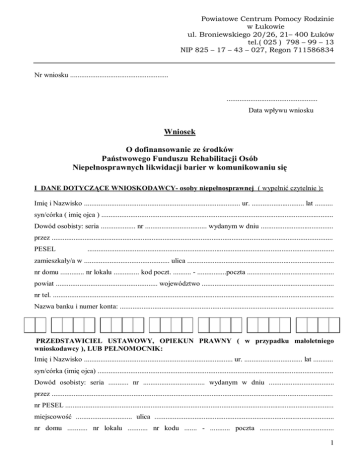 Powiatowe Centrum Pomocy Rodzinie w Łukowie ul. Broniewskiego 20/26, 21– 400 Łuków tel.( 025 ) 798 – 99 – 13 NIP 825 – 17 – 43 – 027, Regon 711586834 Nr wniosku ...................................................... .................................................. Data wpływu wniosku Wniosek O dofinansowanie ze środków Państwowego Funduszu Rehabilitacji Osób Niepełnosprawnych likwidacji barier w komunikowaniu się I DANE DOTYCZĄCE WNIOSKODAWCY- osoby niepełnosprawnej ( wypełnić czytelnie ): Imię i Nazwisko ...................................................................................... ur. ............................. lat .......... syn/córka ( imię ojca ) ................................................................................................................................ Dowód osobisty: seria ................... nr .................................. wydanym w dniu ........................................ przez ........................................................................................................................................................... PESEL ........................................................................................................................................ zamieszkały/a w ............................................... ulica ................................................................................. nr domu ............. nr lokalu .............. kod poczt. .......... - ................poczta ................................................ powiat ........................................................ województwo ......................................................................... nr tel. ........................................................................................................................................................... Nazwa banku i numer konta: ...................................................................................................................... PRZEDSTAWICIEL USTAWOWY, OPIEKUN PRAWNY ( w przypadku małoletniego wnioskodawcy ), LUB PEŁNOMOCNIK: Imię i Nazwisko .................................................................................. ur. ................................ lat ........... syn/córka (imię ojca) .................................................................................................................................. Dowód osobisty: seria ........... nr .................................. wydanym w dniu .................................... przez ........................................................................................................................................................... nr PESEL .................................................................................................................................................... miejscowość ............................... ulica ................................................................................................... nr domu ........... nr lokalu ........... nr kodu ....... - ........... poczta ......................................... 1 powiat ............................................................ województwo ................................................................. nr tel. ........................................................................................................................................................... ustanowiony opiekunem/pełnomocnikiem**.............................................................................................. ( postanowieniem Sądu Rejonowego w .......................................... z dn. ................................................. sygn. akt .................................................* /na mocy pełnomocnictwa potwierdzonego przez Notariusza ........................................................ z dn. ................................ repet. nr ..............................................* ). II. STOPIEŃ NIEPEŁNOSPRAWNOŚCI:* 1. znaczny: - inwalidzi I grupy, - osoby całkowicie niezdolne do pracy i niezdolne do samodzielnej egzystencji, - osoby stale albo długotrwale niezdolne do pracy w gospodarstwie rolnym, którym przysługuje zasiłek pielęgnacyjny; 2. umiarkowany: - inwalidzi II grupy, - osoby całkowicie niezdolne do pracy; 3. lekki: - pozostali inwalidzi III grupy, - osoby częściowo niezdolne do pracy, - osoby stale albo długotrwale niezdolne do pracy w gospodarstwie rolnym; 4. osoby w wieku do lat 16 z aktualnym orzeczeniem o niepełnosprawności. Orzeczenie o niepełnosprawności ważne do ………………………………………….. III. RODZAJ NIEPEŁNOSPRAWNOŚCI:** 1. dysfunkcja narządu ruchu z koniecznością poruszania się na wózku inwalidzkim, 2. inna dysfunkcja narządu ruchu,, 3. dysfunkcja narządu wzroku, 4. dysfunkcja narządów słuchu i mowy, 5. deficyt rozwojowy ( upośledzenie umysłowe ), 6. niepełnosprawność z ogólnego stanu zdrowia. IV. SYTUACJA ZAWODOWA:* 1. zatrudniony / prowadzący działalność gospodarczą 2. rencista /emeryt nie zainteresowany podjęciem pracy 3. bezrobotny poszukujący pracy / rencista poszukujący pracy 4. dzieci i młodzież do lat 18 * * niewłaściwe skreślić proszę wstawić znak X w odpowiedniej kratce / niewłaściwe skreślić, 2 V. OSOBY POZOSTAJĄCE WE WSPÓLNYM GOSPODARSTWIE DOMOWYM Z WNIOSKODAWCĄ: Oświadczam, że: 1. prowadzę samodzielnie gospodarstwo domowe i osiągam dochody wymienione w tabeli pod poz. nr.1, 2. razem za mną we wspólnym gospodarstwie domowym pozostają następujące osoby: Stopień Lp. Imię i nazwisko pokrewieństwa z urodzenia wnioskodawcą 3. 4. w ciągu ostatniego miesiąca przed dniem złożenia wniosku wnioskodawca 1. 2. Dochód1 netto uzyskany Data zł UWAGA! Nie należy wpisywać imion i nazwisk osób, z którymi prowadzi się wspólne gospodarstwo. zł zł zł 5. zł 6. zł Razem miesięczny dochód rodziny: zł Średni m