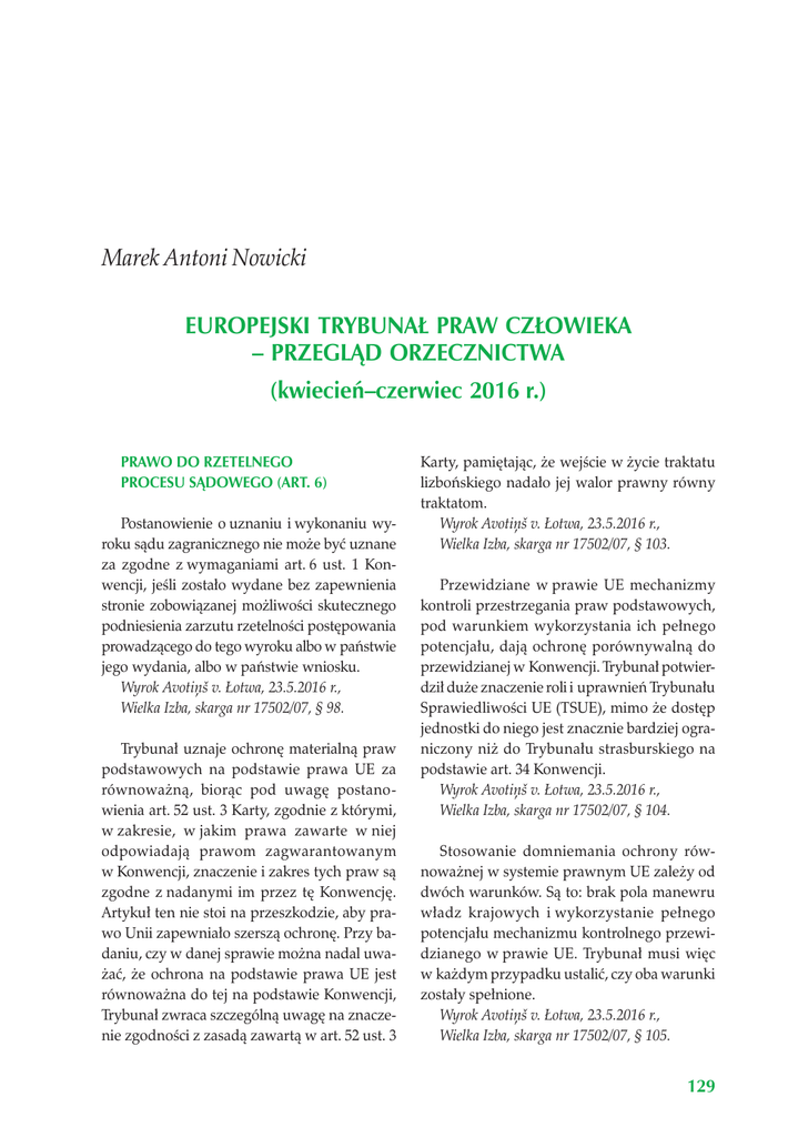 Marek Antoni Nowicki Europejski Trybunał Praw Człowieka – przegląd orzecznictwa (kwiecień–czerwiec 2016 r.) Prawo do rzetelnego procesu sądowego (art. 6) Postanowienie o uznaniu i wykonaniu wyroku sądu zagranicznego nie może być uznane za zgodne z wymaganiami art. 6 ust. 1 Konwencji, jeśli zostało wydane bez zapewnienia stronie zobowiązanej możliwości skutecznego podniesienia zarzutu rzetelności postępowania prowadzącego do tego wyroku albo w państwie jego wydania, albo w państwie wniosku. Wyrok Avotiņš v. Łotwa, 23.5.2016 r., Wielka Izba, skarga nr 17502/07, § 98. Trybunał uznaje ochronę materialną praw podstawowych na podstawie prawa UE za równoważną, biorąc pod uwagę postanowienia art. 52 ust. 3 Karty, zgodnie z którymi, w zakresie, w jakim prawa zawarte w niej odpowiadają prawom zagwarantowanym w Konwencji, znaczenie i zakres tych praw są zgodne z nadanymi im przez tę Konwencję. Artykuł ten nie stoi na przeszkodzie, aby prawo Unii zapewniało szerszą ochronę. Przy badaniu, czy w danej sprawie można nadal uważać, że ochrona na podstawie prawa UE jest równoważna do tej na podstawie Konwencji, Trybunał zwraca szczególną uwagę na znaczenie zgodności z zasadą zawartą w art. 52 ust. 3 Karty, pamiętając, że wejście w życie traktatu lizbońskiego nadało jej walor prawny równy traktatom. Wyrok Avotiņš v. Łotwa, 23.5.2016 r., Wielka Izba, skarga nr 17502/07, § 103. Przewidziane w prawie UE mechanizmy kontroli przestrzegania praw podstawowych, pod warunkiem wykorzystania ich pełnego potencjału, dają ochronę porównywalną do przewidzianej w Konwencji. Trybunał potwierdził duże znaczenie roli i uprawnień Trybunału Sprawiedliwości UE (TSUE), mimo że dostęp jednostki do niego jest znacznie bardziej ograniczony niż do Trybunału strasburskiego na podstawie art. 34 Konwencji. Wyrok Avotiņš v. Łotwa, 23.5.2016 r., Wielka Izba, skarga nr 17502/07, § 104. Stosowanie domniemania ochrony równoważnej w systemie prawnym UE zależy od dwóch warunków. Są to: brak pola manewru władz krajowych i wykorzystanie pełnego potencjału mechanizmu kontrolnego przewidzianego w prawie UE. Trybunał musi więc w każdym przypadku ustalić, czy oba warunki zostały spełnione. Wyrok Avotiņš v. Łotwa, 23.5.2016 r., Wielka Izba, skarga nr 17502/07, § 105. 129 Marek Antoni Nowicki Kwestia, czy pełny potencjał mechanizmu kontrolnego przewidzianego przez prawo UE został wykorzystany – a bardziej konkretnie, czy fakt, że sąd rozpatrujący sprawę nie zwrócił się do TSUE o wydanie orzeczenia wstępnego, uniemożliwiał stosowanie domniemania ochrony równoważnej – wymaga oceny w świetle okoliczności każdej sprawy. Wyrok Avotiņš v. Łotwa, 23.5.2016 r., Wielka Izba, skarga nr 17502/07, § 111. Ograniczenie uprawnienia państwa, w którym został złożony wniosek o uznanie wyroku, do kontroli tylko w drodze wyjątku przestrzegania praw podstawowych przez państwo, w którym wyrok został wydany, może w praktyce prowadzić do działania wbrew wymaganiu Konwencji, aby sąd w państwie wniosku był przynajmniej uprawniony do kontroli w zakresie odpowiadającym znaczeniu poważnego zarzutu naruszenia praw fundamentalnych w państwie wydania wyroku. W ten sposób można zapewnić, aby ochrona tych praw nie była oczywiście wadliwa. Wyrok Avotiņš v. Łotwa, 23.5.2016 r., Wielka Izba, skarga nr 17502/07, § 114. Władze krajowe wprowadzające w życie prawo UE nie mają w tym zakresie żadnej swobody. Poza tym obowiązuje domniemanie ochrony równoważnej. Mechanizmy wzajemnego uznawania wyroków wymagają od sądu stosowania domniemania, że przestrzeganie praw podstawowych przez inne państwo członkowskie było wystarczające. Sąd krajowy nie ma więc pod tym względem swobody, domniemanie równoważności stosuje się więc automatycznie. Prowadzi to paradoksalnie do podwójnego ograniczenia kontroli przez sądy krajowe przestrzegania praw podstawowych. Powodem jest połączony skutek domniemania, na którym oparte jest wzajemne uznawanie wyroków, oraz domniemania istnienia w UE ochrony równoważnej. Wyrok Avotiņš v. Łotwa, 23.5.2016 r., Wielka Izba, skarga nr 17502/07, § 115. Konwencja jest „instrumentem konstytucyjnym europejskiego porządku publicznego”. 130 PALESTRA W rezultacie Trybunał musi upewnić się, czy zostały spełnione warunki stosowania domniemania ochrony równoważnej, a mechanizmy wzajemnego uznawania wyroków nie pozostawiają żadnej luki albo istnieje sytuacja szczególna powodująca, że ochrona praw człowieka zagwarantowanych w Konwencji staje się oczywiście wadliwa. Bierze przy tym pod uwagę, w duchu komplementarności, sposób działania tych mechanizmów, a w szczególności dążenie, aby były skuteczne. Musi jednak ocenić, czy zasada wzajemnego uznawania wyroków nie jest stosowana automatycznie i mechanicznie ze szkodą dla praw podstawowych, które muszą być w tym kontekście przestrzegane. W tym duchu – jeśli ochrona praw Konwencji ma nie być uznana za oczywiście wadliwą – ocena przez sądy państwa będącego równocześnie państwem Konwencji i członkiem UE mającym obowiązek stosować mechanizm wzajemnego uznawania istniejący w prawie EU musi być pełna. W razie poważnego i uzasadnionego zarzutu, że ochrona była wadliwa i nie można było tego naprawić w ramach prawa UE, sądy nie mogą odmówić zbadania takiego zarzutu, powołując się wyłącznie na fakt, iż stosują prawo UE. Wyrok Avotiņš v. Łotwa, 23.5.2016 r., Wielka Izba, skarga nr 17502/07, § 116. Wymaganie od sądów wskazania w tekście orzeczeń szczegółowych informacji o sposobach i terminach odwołania się od nich jest godne pochwały, ponieważ stanowi dodatkowe zabezpieczenie ułatwiające korzystanie przez strony ze swoich praw, jego istnienie nie należy jednak do gwarancji art. 6 ust. 1 Konwencji. Wyrok Avotiņš v. Łotwa, 23.5.2016 r., Wielka Izba, skarga nr 17502/07, 