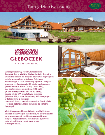 Czterogwiazdkowy Hotel GłęboczekVine Resort & Spa w Wielkim Głęboczku koło Brodnicy to idealne miejsce na ukojenie zmysłów i odpoczynek pośród wspaniałego krajobrazu Pojezierza Brodnickiego, a także doskonały wybór na miejsce szkolenia czy konferencji. 80 miejsc noclegowych (Hotel Winnica, Hotel Osada, Chata SPA), sale konferencyjne w sumie na 180 osób (w tym klimatyzowana sala na 80 osób), bogata oferta SPA z unikalnymi terapiami (Winnica SPA, Łaźnie Brodnickie, Alfasfera jedyna w Polsce) wraz z basenami oraz strefą łaźni, a także Restauracją z Piwnicą Win – to nasz potencjał, który stawiamy do Państwa dyspozycji. W ekskluzywnym Hotelu Winnicy znajdą Państwo wnętrza o najwyższym standardzie, w których został zachowany specyficzny klimat tego urokliwego miejsca. Razem stanowią metafizyczną symbiozę natury i architektury mają swój wyraz w każdym detalu. Urządzone z klasą i smakiem klimatyzowane apartamenty i pokoje spełnią oczekiwania nawet najbardziej wymagających gości. Hotel Osada wraz z Chatą SPA stanowią komplementarne dopełnienie potencjału noclegowego 'Głęboczka' w naturalistycznym standardzie ekskluzywnych chat wiejskich. Sale konferencyjne Hotelu mogą pomieścić od 20 do 80 osób. Są doskonałe do organizacji wszelkiego typu wydarzeń: konferencji, szkoleń, sympozjów, narad, zjazdów czy bankietów. Restauracja Hotelu Winnica wraz z oryginalnie zaaranżowaną Karczmą są z kolei znakomitym miejscem na wystawne kolacje oraz bankiety. Serwowane przez Mistrza Kuchni wykwintne dania kuchni regionalnej i śródziemnomorskiej zachwycają każde podniebienie. Pobyt w Głęboczku można wykorzystać pełniej i zadbać o poprawę dobrego samopoczucia, korzystając ze specjalnie opracowanych rytuałów wellness na twarz i na ciało. Oferujemy szeroki wachlarz zabiegów relaksacyjnych, a także spędzenie niezapomnianych chwil w kompleksie wodnym. Głęboczek Vine Resort & SPA jest jedynym polskim resortem całkowicie poświęconym rozkoszom wina, w którym pielęgnacja cała oparta jest w pełnym zakresie a winoterapii (m.in. kąpiele winne, peelingi z zastosowanie pestek z winogron, okłady z winogronowego miąższu). W hotelu jest kilka stref zabiegowych i relaksacyjnych: winnica SPA, czyli gabinety, gdzie wykorzystywane są kosmetyki stworzone na bazie składników aktywnych pochodzących z winogron i ich krzewów, łaźnie Brodnickie inspirowane okolicami Pojezierza Brodnickiego,które cechuje klimat wyjątkowo sprzyjający odpoczynkowi; głównym elementem zabiegów są różnego rodzaju inhalacje ziołowe mające działanie terapeutyczne, wzbogacone aplikacją okładów z torfu bogatego w mikroelementy oraz masażem detoksykująco - relaksującym. Alfasfera przeznaczona do zabiegów relaksacyjnych, z kołyską Alpha Lounger, która wprowadza w stan głębokiego relaksu Alfa, jaki zwykle można doświadczyć jedynie na drodze medytacji transcendentalnej; głęboki relaks wspomaga procesy kreatywności i twórczego myślenia. Uzupełnieniem naszej Hotelowej oferty jest możliwość organizacji różnego typu zajęć integracyjnych, takich jak: spływy kajakowe i tratwą wodną, przejażdżki rowerowe, łowienie ryb. Do dyspozycji gości pozostaje basen letni i zimowy, aromasauna, łaźnia kwiatowa.. Komplementarność i jakość naszej oferty doceniły już tak wymagające firmy korporacyjne jak Nestle, Zenth Optimedia, Henri Lloyd, Noble Bank oraz wiele innych. Elastyczność w zakresie dopasowania naszych możliwości do potrzeb naszych gości gwarantuje optymalność efektu mierzonego ich satysfakcją. Hotel Głęboczek Vine Resort & SPA posiada rekomendację Noble Concierge w dowód uznania najwyższej jakości wyjątkowego profesjonalizmu i zaangażowania w spełnienia oczekiwań swoich klientów. Zadowolenie i satysfakcja naszych dotychczasowych gości upewnia nas w przekonaniu o właściwej konstrukcji naszej oferty i dopinguje do jeszcze lepszej pracy.