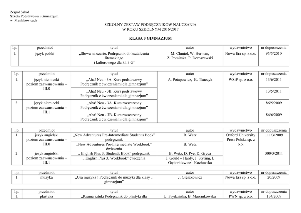 Zespół Szkół Szkoła Podstawowa i Gimnazjum w Mysłakowicach SZKOLNY ZESTAW PODRĘCZNIKÓW NAUCZANIA W ROKU SZKOLNYM 2016/2017 KLASA 3 GIMNAZJUM l.p. przedmiot tytuł autor wydawnictwo nr dopuszczenia 1. język polski „Słowa na czasie. Podręcznik do kształcenia literackiego i kulturowego dla kl. 3 G” M. Chmiel, W. Herman, Z. Pomirska, P. Doroszewski Nowa Era sp. z o.o. 95/5/2010 l.p. przedmiot tytuł autor wydawnictwo nr dopuszczenia 1. język niemiecki poziom zaawansowania – III.0 „Aha! Neu - 3A. Kurs podstawowy Podręcznik z ćwiczeniami dla gimnazjum” A. Potapowicz, K. Tkaczyk WSiP sp. z o.o. 13/6/2011 „Aha! Neu - 3B. Kurs podstawowy Podręcznik z ćwiczeniami dla gimnazjum” 13/5/2011 język niemiecki poziom zaawansowania – III.1 „Aha! Neu - 3A. Kurs rozszerzony Podręcznik z ćwiczeniami dla gimnazjum” 86/5/2009 „Aha! Neu - 3B. Kurs rozszerzony Podręcznik z ćwiczeniami dla gimnazjum” 86/6/2009 przedmiot język angielski poziom zaawansowania – III.0 tytuł „New Adventures Pre-Intermediate Student's Book” podręcznik „New Adventures Pre-Intermediate Workbook” ćwiczenia „ English Plus 3. Student's Book” podręcznik „ English Plus 3. Workbook” ćwiczenia 2. l.p. 1. autor B. Wetz B. Wetz wydawnictwo Oxford University Press Polska sp. z o.o. nr dopuszczenia 111/3/2009 2. język angielski poziom zaawansowania – III.1 l.p. 1. przedmiot muzyka tytuł „Gra muzyka ! Podręcznik do muzyki dla klasy 1 gimnazjum” autor J. Oleszkowicz wydawnictwo Nowa Era sp. z o.o. nr dopuszczenia 20/2009 l.p. 1. przedmiot plastyka tytuł „Kraina sztuki Podręcznik do plastyki dla autor L. Frydzińska, B. Marcinkowska wydawnictwo PWN sp. z o.o. nr dopuszczenia 154/2009 B. Wetz, D. Pye, D. Gryca J. Gould – Hardy, J. Styring, I. Gąsiorkiewicz - Kozłowska 300/3/2011 gimnazjum” l.p. 1. przedmiot historia tytuł „Śladami przeszłości 3. Podręcznik do historii dla klasy 3 gimnazjum autor S. Roszak, A. Łaszkiewicz wydawnictwo Nowa Era sp. z o.o. nr dopuszczenia 60/3/2011 l.p. 1. przedmiot wiedza o społeczeństwie tytuł „Dziś i jutro” Wiedza o społeczeństwie podręcznik z ćwiczeniami dla klas 1-3 Gimnazjum, część 2 autor I. Janicka, A. Janicki, A. Kucia, T. Maćkowski wydawnictwo Nowa Era sp. z o.o. nr dopuszczenia 77/2/2010 l.p. przedmiot tytuł autor wydawnictwo nr dopuszczenia 1. geografia „Puls Ziemi”- Podręcznik do geografii dla klasy 3 gimnazjum R. Malarz Nowa Era sp. z o.o. 5/3/2010 „Puls Ziemi 3” – zeszyt ćwiczeń do geografii dla gimnazjum J. i S. Osikowie l.p. przedmiot tytuł autor wydawnictwo nr dopuszczenia 1. biologia „Puls życia 3” Podręcznik do biologii dla gimnazjum B. Sągin, A. Boczarowski, M. Sęktas Nowa Era sp. z o.o. 58/3/2010 „Puls życia” Zeszyt ćwiczeń, część 3 M. Jaworska, J. Pawłowska, J. Pawłowski, M. Zaleska l.p. przedmiot tytuł autor wydawnictwo nr dopuszczenia 1. chemia „Chemia Nowej Ery” Podręcznik dla gimnazjum, część 3. J. Kulawik, T. Kulawik, M. Litwin Nowa Era sp. z o.o. 49/3/2010 „Chemia Nowej Ery” Zeszyt ćwiczeń, część 3. D. Babczonek-Wróbel, T. Kulawik, M. Litwin Chemia w zadaniach i przykładach. Zbiór zadań z repetytorium dla gimnazjum (obowiązuje przez okres 3 lat nauki w Gimn.) T. Kulawik, M. Litwin, S. StykaWlazło tytuł autor wydawnictwo nr dopuszczenia l.p. przedmiot 1. fizyka „Fizyka dla gimnazjum. Podręcznik cz. 3” A. Kaczorowska „Fizyka dla gimnazjum. Podręcznik cz. 4” A. Kaczorowska Fizyka. Zbiór zadań dla gimnazjum L. Bober Żak sp. z o.o. sp. k. 131/3/2010 131/4/2011 l.p. przedmiot tytuł autor wydawnictwo nr dopuszczenia 1. matematyka „Matematyka wokół nas. Gimnazjum. Podręcznik dla klasy 3” A. Drążek, E. Duvnjak, E. KokiernakJurkiewicz WSiP sp. z o.o. 62/3/2010 „Matematyka wokół nas. Gimnazjum Zbiór zadań i testów dla klasy 3” E. Duvnjak, E. Kokiernak-Jurkiewicz l.p. przedmiot tytuł autor wydawnictwo nr dopuszczenia 1. informatyka „Informatyka. Część 1” Podręcznik dla gimnazjum M. Kołodziej Operon sp. z o.o. 91/1/2009 „Informatyka. Część 2” Podręcznik dla gimnazjum 91/2/2010 l.p. 1. przedmiot edukacja dla bezpieczeństwa tytuł „Edukacja dla bezpieczeństwa.” Podręcznik dla gimnazjum. autor H. Śnieżek wydawnictwo Żak sp. z o.o. sp. k. nr dopuszczenia 184/2009 l.p. 1. przedmiot zajęcia techniczne tytuł „Zajęcia techniczne” podręcznik dla gimnazjum autor U. Białka wydawnictwo Operon sp. z o.o. nr dopuszczenia 199/2009 l.p. 1. przedmiot religia tytuł „Chodźmy razem” Podręcznik do religii dla 3 klasy gimnazjum autor W. Kubik wydawnictwo WAM nr dopuszczenia AZ-33-01/10-KR4/13