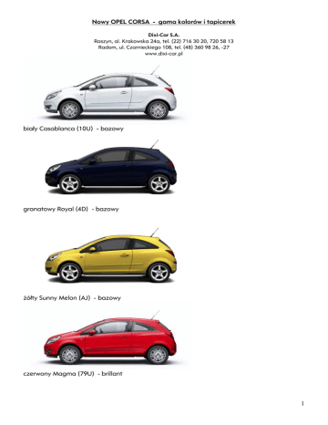 Nowy OPEL CORSA - gama kolorów i tapicerek Dixi-Car S.A. Raszyn, al. Krakowska 24a, tel. (22) 716 30 20, 720 58 13 Radom, ul. Czarnieckiego 108, tel. (48) 360 98 26, -27 www.dixi-car.pl biały Casablanca (10U) - bazowy granatowy Royal (4D) - bazowy żółty Sunny Melon (AJ) - bazowy czerwony Magma (79U) - brillant 1 srebrny Silver Star (2AU) - metallic jasnoszary Silver Ligthning (4AU) - metallic szary Metro (4XU) - metallic liliowy Lilac (4oU) - metallic czarny Sapphire (2HU) - mica 2 jasnozielony Green Tea (4RU) - mica jasnoszary Lancelot (AA) - metallic niebieski Ultra Blue (4CU) - mica jasnoniebieski AirBlue (4MU) - mica 3 tapicerka Stoff antracytowa (XXWX) tapicerka Stoff niebieska (XXWY) tapicerka Stoff czerwona (XXWZ) tapicerka Stoff Fuse / Morrocana antracytowa ze skórzanymi wstawkami (XXXF) 4 tapicerka Stoff Fuse czerwona (XXWF) tapicerka Stoff Punch antracytowa (XXWE) tapicerka Stoff Oxygen antracytowo-czerwona (XXZO) tapicerka Stoff ze skórzanymi naszywkami, niebieski, Marocana (XXYN) 5 tapicerka Stoff ze skórzanymi naszywkami, srebrny, Marocana (XXYM) tapicerka skórzana czarno-srebrna (XXYO) 6