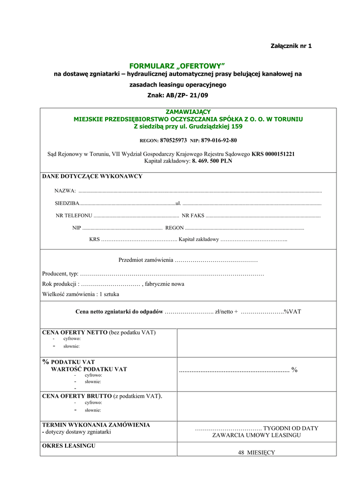 Załącznik nr 1 FORMULARZ „OFERTOWY” na dostawę zgniatarki – hydraulicznej automatycznej prasy belującej kanałowej na zasadach leasingu operacyjnego Znak: AB/ZP- 21/09 ZAMAWIAJĄCY MIEJSKIE PRZEDSIĘBIORSTWO OCZYSZCZANIA SPÓŁKA Z O. O. W TORUNIU Z siedzibą przy ul. Grudziądzkiej 159 REGON: 870525973 NIP: 879-016-92-80 Sąd Rejonowy w Toruniu, VII Wydział Gospodarczy Krajowego Rejestru Sądowego KRS 0000151221 Kapitał zakładowy: 8. 469. 500 PLN DANE DOTYCZĄCE WYKONAWCY NAZWA: ...................................................................................................................................................................................... SIEDZIBA........................................................................ul. ........................................................................................................ NR TELEFONU ................................................................ NR FAKS ...................................................................................... NIP ............................................................ REGON ......................................................................................... KRS ……………………………………. Kapitał zakładowy ……………………………….. Przedmiot zamówienia …………………………………… Producent, typ: ………………………………………………………………………………… Rok produkcji : ………………………… , fabrycznie nowa Wielkość zamówienia : 1 sztuka Cena netto zgniatarki do odpadów ……………………. zł/netto + ………………….%VAT CENA OFERTY NETTO (bez podatku VAT) - cyfrowo: - słownie: % PODATKU VAT WARTOŚĆ PODATKU VAT - cyfrowo: słownie: .............................................................. % CENA OFERTY BRUTTO (z podatkiem VAT). - cyfrowo: - słownie: TERMIN WYKONANIA ZAMÓWIENIA - dotyczy dostawy zgniatarki ……………………………. TYGODNI OD DATY ZAWARCIA UMOWY LEASINGU OKRES LEASINGU 48 MIESIĘCY WYKUP PRZEDMIOTU ZAMÓWIENIA 6 % wartości początkowej przedmiotu zamówienia ………………………Zł/NETTO + ……… %VAT Warunki wykupu CZYNSZ INICJACYJNY TERMIN WNIESIENIA CZYNSZU INICJALNEGO Forma rozliczenia Termin płatności faktury za czynsz ………………………………………………………………. 5% WARTOŚCI PRZEDMIOTU UMOWY .............................................. ZŁ/NETTO + …….. %VAT Po zawarciu umowy o zamówienie publiczne z wybranym w drodze postępowania Wykonawcą w formie przelewu bankowego na konto Wykonawcy. Faktura VAT …………………. DNI OD DATY DOSTARCZENIA FAKTURY ZAMAWIJĄCEMU KONTO ……………………………………………………. WARUNKI PŁATNOŚCI RAT LEASINGOWYCH WSKAŹNIKI ZMIANY CENY (wysokości rat leasingowych) Raty leasingu płatne będą zgodnie z przedłożonym harmonogramem. Pierwsza rata leasingowa zostanie opłacona w terminie ………. dni po przyjęciu przez Zamawiającego przedmiotu zamówienia i podpisaniu protokołu odbioru . Zmiana w stosunku do WIBOR 1M z dnia wszczęcia postępowania. WIBOR 1M z dnia 2009/11/02 …………………………. % WARUNKI GWARANCJI ......................................................................... Długość okresu gwarancji SERWIS Wykaz autoryzowanych punktów serwisowych (min.1) na terenie Polski z min 3 letnim doświadczeniem. ....................................., dnia ................................. PODPIS WYKONAWCY 1. Walutą transakcji jest złoty polski. Ofertę cenową należy złożyć na druku formularza OFERTOWEGO. Cena oferty powinna być wyrażona cyfrowo i słownie z wyszczególnieniem ceny: - netto - cena zawarta w formularzu ofertowym powinna być wyrażona jako łączna wartość całego przedmiotu zamówienia tj. wartość zgniatarki wraz z udziałem własnym Zamawiającego zwanym czynszem inicjacyjnym i opcją wykupu przedmiotu zamówienia oraz marżą Wykonawcy. Koszty ubezpieczenia, nie stanowią przedmiotu leasingu i będą odrębnie regulowane przez Zamawiającego. - brutto rozumianą jako sumę ceny netto i kwotę należnego podatku VAT. - cenę oferty należy podać w złotych polskich z wyszczególnieniem podatku VAT. W przypadku podania ceny w walucie obcej dla porównania ofert i zawarcia umowy zostanie zastosowany przelicznik wg średniego kursu NBP na dzień otwarcia ofert. [kurs ustalony w dniu otwarcia ofert zostanie przeniesiony do umowy]. - wszystkie wskaźniki cenowe winny być podane w złotych polskich z zaokrągleniem do dwóch miejsc po przecinku. W przypadku podania ceny oferty w walucie obcej dla porównania ofert i zawarcia umowy zostanie zastosowany przelicznik wg średniego kursu NBP na dzień otwarcia ofert. Kurs walut ustalony w dniu otwarcia ofert zostanie przeniesiony do umowy. 2. oświadczam, że: - zapoznałem się ze specyfikacją istotnych warunków zamówienia i nie wnoszę do niej zastrzeżeń, uważam się za związanego ofertą przez okres 60 dni wskazany w siwz , zapoznałem się z treścią umowy i nie wnoszę do niej zastrzeżeń oraz zobowiązuję się do jej zawarcia w przypadku gdyby uznano moją ofertę za najkorzystniejszą, ........................... dnia ...................................... ................................................................... pieczęć i podpis wykonawcy ……… wpisać oferowane parametry