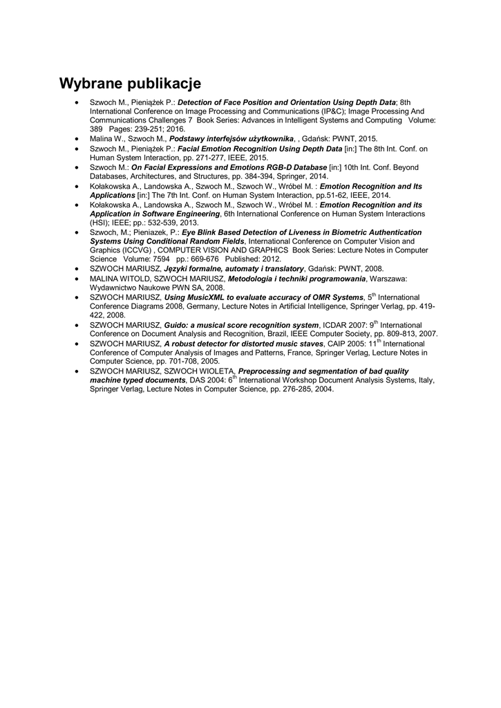 Wybrane publikacje Szwoch M., Pieniążek P.: Detection of Face Position and Orientation Using Depth Data; 8th International Conference on Image Processing and Communications (IP&C); Image Processing And Communications Challenges 7 Book Series: Advances in Intelligent Systems and Computing Volume: 389 Pages: 239-251; 2016. Malina W., Szwoch M., Podstawy interfejsów użytkownika, , Gdańsk: PWNT, 2015. Szwoch M., Pieniążek P.: Facial Emotion Recognition Using Depth Data [in:] The 8th Int. Conf. on Human System Interaction, pp. 271-277, IEEE, 2015. Szwoch M.: On Facial Expressions and Emotions RGB-D Database [in:] 10th Int. Conf. Beyond Databases, Architectures, and Structures, pp. 384-394, Springer, 2014. Kołakowska A., Landowska A., Szwoch M., Szwoch W., Wróbel M. : Emotion Recognition and Its Applications [in:] The 7th Int. Conf. on Human System Interaction, pp.51-62, IEEE, 2014. Kołakowska A., Landowska A., Szwoch M., Szwoch W., Wróbel M. : Emotion Recognition and its Application in Software Engineering, 6th International Conference on Human System Interactions (HSI); IEEE; pp.: 532-539, 2013. Szwoch, M.; Pieniazek, P.: Eye Blink Based Detection of Liveness in Biometric Authentication Systems Using Conditional Random Fields, International Conference on Computer Vision and Graphics (ICCVG) , COMPUTER VISION AND GRAPHICS Book Series: Lecture Notes in Computer Science Volume: 7594 pp.: 669-676 Published: 2012. SZWOCH MARIUSZ, Języki formalne, automaty i translatory, Gdańsk: PWNT, 2008. MALINA WITOLD, SZWOCH MARIUSZ, Metodologia i techniki programowania, Warszawa: Wydawnictwo Naukowe PWN SA, 2008. SZWOCH MARIUSZ, Using MusicXML to evaluate accuracy of OMR Systems, 5th International Conference Diagrams 2008, Germany, Lecture Notes in Artificial Intelligence, Springer Verlag, pp. 419422, 2008. SZWOCH MARIUSZ, Guido: a musical score recognition system, ICDAR 2007: 9th International Conference on Document Analysis and Recognition, Brazil, IEEE Computer Society, pp. 809-813, 2007. SZWOCH MARIUSZ, A robust detector for distorted music staves, CAIP 2005: 11th International Conference of Computer Analysis of Images and Patterns, France, Springer Verlag, Lecture Notes in Computer Science, pp. 701-708, 2005. SZWOCH MARIUSZ, SZWOCH WIOLETA, Preprocessing and segmentation of bad quality machine typed documents, DAS 2004: 6th International Workshop Document Analysis Systems, Italy, Springer Verlag, Lecture Notes in Computer Science, pp. 276-285, 2004.