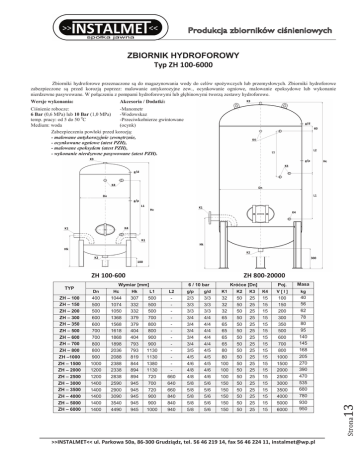 ZBIORNIK HYDROFOROWY 72 ;;)4;;; Zbiorniki hydroforowe przeznaczone s do magazynowania wody do celów spo ywczych lub przemysłowych. Zbiorniki hydroforowe zabezpieczone s przed korozj poprzez: malowanie antykorozyjne zew., ocynkowanie ogniowe, malowanie epoksydowe lub wykonanie nierdzewne pasywowane. W poł czeniu z pompami hydroforowymi lub gł binowymi tworz zestawy hydroforowe. Wersje wykonania: Akcesoria / Dodatki: Ci nienie robocze: -Manometr 6 Bar (0,6 MPa) lub 10 Bar (1,0 MPa) -Wodowskaz temp. pracy: od 5 do 50 0C -Przeciwkołnierze gwintowane Medium: woda (ocynk) Zabezpieczenia powłoki przed korozj : - malowane antykorozyjnie zewn trznie, - ocynkowane ogniowe (atest PZH), - malowane epoksydem (atest PZH), - wykonanie nierdzewne pasywowane (atest PZH). 72 ;;)4;; Poj. Masa Dn Hc Hk L1 L2 g/p g/d K1 K2 K3 K4 V[l] kg 400 500 500 600 600 700 700 800 800 900 1000 1200 1200 1400 1400 1400 1400 1400 1044 1074 1050 1368 1568 1618 1868 1898 2036 2088 2388 2338 2838 2590 2900 3090 3540 4490 307 332 332 379 379 404 404 793 793 819 844 894 894 945 945 945 945 945 500 500 500 700 800 800 900 900 1130 1130 1380 1130 720 700 720 900 900 1000 660 640 660 840 840 940 2/3 3/3 3/3 3/4 3/4 3/4 3/4 3/4 3/5 4/5 4/6 4/8 4/8 5/8 5/8 5/8 5/8 5/8 3/3 3/3 3/3 4/4 4/4 4/4 4/4 4/4 4/5 4/5 4/5 4/6 4/6 5/6 5/6 5/6 5/6 5/6 32 32 32 65 65 65 65 65 80 80 100 100 100 150 150 150 150 150 50 50 50 50 50 50 50 50 50 50 50 50 50 50 50 50 50 50 25 25 25 25 25 25 25 25 25 25 25 25 25 25 25 25 25 25 15 15 15 15 15 15 15 15 15 15 15 15 15 15 15 15 15 15 100 150 200 300 350 500 600 700 800 1000 1500 2000 2500 3000 3500 4000 5000 6000 40 56 62 78 80 95 140 145 168 205 270 390 470 535 680 780 930 950 Wymiar [mm] TYP ZH – 100 ZH – 150 ZH – 200 ZH – 300 ZH – 350 ZH – 500 ZH – 600 ZH – 700 ZH – 800 ZH –1000 ZH – 1500 ZH – 2000 ZH – 2500 ZH – 3000 ZH – 3500 ZH – 4000 ZH – 5000 ZH – 6000 >>-?0 72 9;;) ;;;; @ AA 5 6 / 10 bar & 3; , 94)*;; $ B $C # 34 /4 Kró ce [Dn] : /, ( D 34 /4 / , # E&