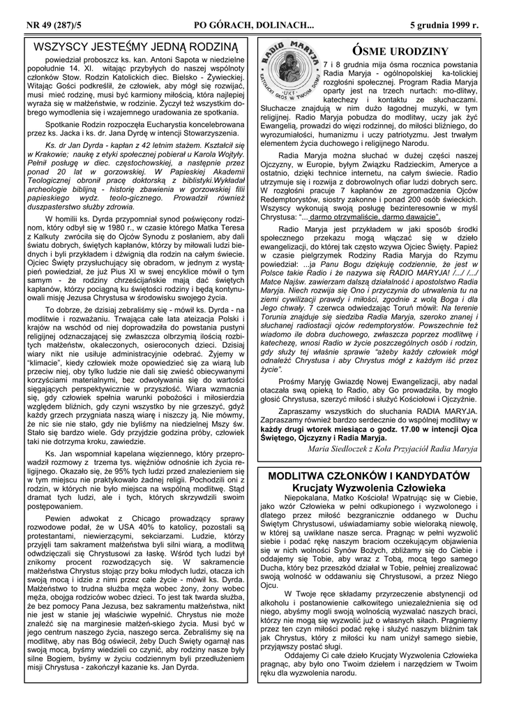 NR 49 (287)/5 PO GÓRACH, DOLINACH... WSZYSCY JESTEŚMY JEDNĄ RODZINĄ powiedział proboszcz ks. kan. Antoni Sapota w niedzielne popołudnie 14. XI. witając przybyłych do naszej wspólnoty członków Stow. Rodzin Katolickich diec. Bielsko - śywieckiej. Witając Gości podkreślił, Ŝe człowiek, aby mógł się rozwijać, musi mieć rodzinę, musi być karmiony miłością, która najlepiej wyraŜa się w małŜeństwie, w rodzinie. śyczył teŜ wszystkim dobrego wymodlenia się i wzajemnego uradowania ze spotkania. Spotkanie Rodzin rozpoczęła Eucharystia koncelebrowana przez ks. Jacka i ks. dr. Jana Dyrdę w intencji Stowarzyszenia. Ks. dr Jan Dyrda - kapłan z 42 letnim staŜem. Kształcił się w Krakowie; naukę z etyki społecznej pobierał u Karola Wojtyły. Pełnił posługę w diec. częstochowskiej, a następnie przez ponad 20 lat w gorzowskiej. W Papieskiej Akademii Teologicznej obronił pracę doktorską z biblistyki.Wykładał archeologie biblijną - historię zbawienia w gorzowskiej filii papieskiego wydz. teolo-gicznego. Prowadził równieŜ duszpasterstwo słuŜby zdrowia. W homilii ks. Dyrda przypomniał synod poświęcony rodzinom, który odbył się w 1980 r., w czasie którego Matka Teresa z Kalkuty zwróciła się do Ojców Synodu z posłaniem, aby dali światu dobrych, świętych kapłanów, którzy by miłowali ludzi biednych i byli przykładem i dźwignią dla rodzin na całym świecie. Ojciec Święty przysłuchujący się obradom, w jednym z wystąpień powiedział, Ŝe juŜ Pius XI w swej encyklice mówił o tym samym - Ŝe rodziny chrześcijańskie mają dać świętych kapłanów, którzy pociągną ku świętości rodziny i będą kontynuowali misję Jezusa Chrystusa w środowisku swojego Ŝycia. To dobrze, Ŝe dzisiaj zebraliśmy się - mówił ks. Dyrda - na modlitwie i rozwaŜaniu. Trwająca całe lata ateizacja Polski i krajów na wschód od niej doprowadziła do powstania pustyni religijnej odznaczającej się zwłaszcza olbrzymią ilością rozbitych małŜeństw, okaleczonych, osieroconych dzieci. Dzisiaj wiary nikt nie usiłuje administracyjnie odebrać. śyjemy w “klimacie”, kiedy człowiek moŜe opowiedzieć się za wiarą lub przeciw niej, oby tylko ludzie nie dali się zwieść obiecywanymi korzyściami materialnymi, bez odwoływania się do wartości sięgających perspektywicznie w przyszłość. Wiara wzmacnia się, gdy człowiek spełnia warunki poboŜości i miłosierdzia względem bliźnich, gdy czyni wszystko by nie grzeszyć, gdyŜ kaŜdy grzech przygniata naszą wiarę i niszczy ją. Nie mówmy, Ŝe nic sie nie stało, gdy nie byliśmy na niedzielnej Mszy św. Stało się bardzo wiele. Gdy przyjdzie godzina próby, człowiek taki nie dotrzyma kroku, zawiedzie. Ks. Jan wspomniał kapelana więziennego, który przeprowadził rozmowy z trzema tys. więźniów odnośnie ich Ŝycia religijnego. Okazało się, Ŝe 95% tych ludzi przed znalezieniem się w tym miejscu nie praktykowało Ŝadnej religii. Pochodzili oni z rodzin, w których nie było miejsca na wspólną modlitwę. Stąd dramat tych ludzi, ale i tych, których skrzywdzili swoim postępowaniem. Pewien adwokat z Chicago prowadzący sprawy rozwodowe podał, Ŝe w USA 40% to katolicy, pozostali są protestantami, niewierzącymi, sekciarzami. Ludzie, którzy przyjęli tam sakrament małŜeństwa byli silni wiarą, a modlitwą odwdzięczali się Chrystusowi za łaskę. Wśród tych ludzi był znikomy procent rozwodzących się. W sakramencie małŜeństwa Chrystus stojąc przy boku młodych ludzi, otacza ich swoją mocą i idzie z nimi przez całe Ŝycie - mówił ks. Dyrda. MałŜeństwo to trudna słuŜba męŜa wobec Ŝony, Ŝony wobec męŜa, obojga rodziców wobec dzieci. To jest tak twarda słuŜba, Ŝe bez pomocy Pana Jezusa, bez sakramentu małŜeństwa, nikt nie jest w stanie jej właściwie wypełnić. Chrystus nie moŜe znaleźć się na marginesie małŜeń-skiego Ŝycia. Musi być w jego centrum naszego Ŝycia, naszego serca. Zebraliśmy się na modlitwę, aby nas Bóg oświecił, Ŝeby Duch Święty ogarnął nas swoją mocą, byśmy wiedzieli co czynić, aby rodziny nasze były silne Bogiem, byśmy w Ŝyciu codziennym byli przedłuŜeniem misji Chrystusa - zakończył kazanie ks. Jan Dyrda. 5 grudnia 1999 r. ÓSME URODZINY 7 i 8 grudnia mija ósma rocznica powstania Radia Maryja - ogólnopolskiej ka-tolickiej rozgłośni społecznej. Program Radia Maryja oparty jest na trzech nurtach: mo-dlitwy, katechezy i kontaktu ze słuchaczami. Słuchacze znajdują w nim duŜo łagodnej muzyki, w tym religijnej. Radio Maryja pobudza do modlitwy, uczy jak Ŝyć Ewangelią, prowadzi do więzi rodzinnej, do miłości bliźniego, do wyrozumiałości, humanizmu i uczy patriotyzmu. Jest trwałym elementem Ŝycia duchowego i religijnego Narodu. Radia Maryja moŜna słuchać w duŜej części naszej Ojczyzny, w Europie, byłym Związku Radzieckim, Ameryce a ostatnio, dzięki technice internetu, na całym świecie. Radio utrzymuje się i rozwija z dobrowolnych ofiar ludzi dobrych serc. W rozgłośni pracuje 7 kapłanów ze zgromadzenia Ojców Redemptorystów, siostry zakonne i ponad 200 osób świeckich. Wszyscy wykonują swoją posługę bezinteresownie w myśl Chrystusa: “... darmo otrzymaliście, darmo dawajcie”. Radio Maryja jest przykładem w jaki sposób środki społecznego przekazu mogą włączać się w dzieło ewangelizacji, do której tak często wzywa Ojciec Święty. PapieŜ w czasie pielgrzymek Rodziny Radia Maryja do Rzymu powiedział: ...ja Panu Bogu dziękuję codziennie, Ŝe jest w Polsce takie Radio i Ŝe nazywa się RADIO MARYJA! /.../ /.../ Matce Najśw. zawierzam dalszą działalność i apostolstwo Radia Maryja. Niech rozwija się Ono i przyczynia do utrwalenia tu na ziemi cywilizacji prawdy i miłości, zgodnie z wolą Boga i dla Jego chwały. 7 czerwca odwiedzając Toruń mówił: Na terenie Torunia znajduje się siedziba Radia Maryja, szeroko znanej i 