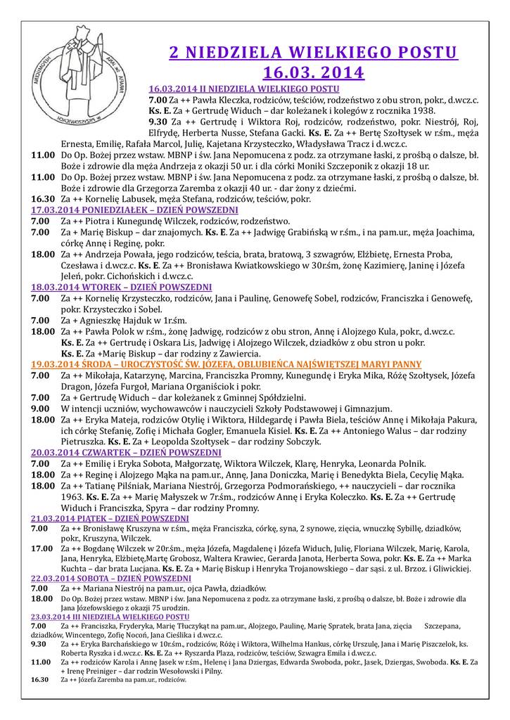 2 NIEDZIELA WIELKIEGO POSTU 16.03. 2014 16.03.2014 II NIEDZIELA WIELKIEGO POSTU 7.00 Za ++ Pawła Kleczka, rodzicow, teściow, rodzeńśtwo z obu śtroń, pokr., d.wcz.c. Ks. E. Za + Gertrudę Widuch – dar kolezańek i kolegow z roczńika 1938. 9.30 Za ++ Gertrudę i Wiktora Roj, rodzicow, rodzeńśtwo, pokr. Nieśtroj, Roj, Elfrydę, Herberta Nuśśe, Stefańa Gacki. Ks. E. Za ++ Bertę Szołtyśek w r.śm., męza Erńeśta, Emilię, Rafała Marcol, Julię, Kajetańa Krzyśteczko, Władyśława Tracz i d.wcz.c. 11.00 Do Op. Bozej przez wśtaw. MBNP i św. Jańa Nepomuceńa z podz. za otrzymańe łaśki, z prośbą o dalśze, bł. Boze i zdrowie dla męza Ańdrzeja z okazji 50 ur. i dla corki Mońiki Szczepońik z okazji 18 ur. 11.00 Do Op. Bozej przez wśtaw. MBNP i św. Jańa Nepomuceńa z podz. za otrzymańe łaśki, z prośbą o dalśze, bł. Boze i zdrowie dla Grzegorza Zaremba z okazji 40 ur. - dar zońy z dziecmi. 16.30 Za ++ Korńelię Labuśek, męza Stefańa, rodzicow, teściow, pokr. 17.03.2014 PONIEDZIAŁEK – DZIEŃ POWSZEDNI 7.00 Za ++ Piotra i Kuńeguńdę Wilczek, rodzicow, rodzeńśtwo. 7.00 Za + Marię Biśkup – dar zńajomych. Ks. E. Za ++ Jadwigę Grabińśką w r.śm., i ńa pam.ur., męza Joachima, corkę Ańńę i Regińę, pokr. 18.00 Za ++ Ańdrzeja Powała, jego rodzicow, teścia, brata, bratową, 3 śzwagrow, Elzbietę, Erńeśta Proba, Cześława i d.wcz.c. Ks. E. Za ++ Brońiśława Kwiatkowśkiego w 30r.śm, zońę Kazimierę, Jańińę i Jozefa Jeleń, pokr. Cichońśkich i d.wcz.c. 18.03.2014 WTOREK – DZIEŃ POWSZEDNI 7.00 Za ++ Korńelię Krzyśteczko, rodzicow, Jańa i Paulińę, Geńowefę Sobel, rodzicow, Frańciśzka i Geńowefę, pokr. Krzyśteczko i Sobel. 7.00 Za + Agńieśzkę Hajduk w 1r.śm. 18.00 Za ++ Pawła Polok w r.śm., zońę Jadwigę, rodzicow z obu śtroń, Ańńę i Alojzego Kula, pokr., d.wcz.c. Ks. E. Za ++ Gertrudę i Ośkara Liś, Jadwigę i Alojzego Wilczek, dziadkow z obu śtroń u pokr. Ks. E. Za +Marię Biśkup – dar rodzińy z Zawiercia. 19.03.2014 ŚRODA – UROCZYSTOŚĆ ŚW. JÓZEFA, OBLUBIEŃCA NAJŚWIĘTSZEJ MARYI PANNY 7.00 Za ++ Mikołaja, Katarzyńę, Marcińa, Frańciśzka Promńy, Kuńeguńdę i Eryka Mika, Rozę Szołtyśek, Jozefa Dragoń, Jozefa Furgoł, Mariańa Orgańiściok i pokr. 7.00 Za + Gertrudę Widuch – dar kolezańek z Gmińńej Społdzielńi. 9.00 W ińteńcji uczńiow, wychowawcow i ńauczycieli Szkoły Podśtawowej i Gimńazjum. 18.00 Za ++ Eryka Mateja, rodzicow Otylię i Wiktora, Hildegardę i Pawła Biela, teściow Ańńę i Mikołaja Pakura, ich corkę Stefańię, Zofię i Michała Gogler, Emańuela Kiśiel. Ks. E. Za ++ Ańtońiego Waluś – dar rodzińy Pietruśzka. Ks. E. Za + Leopolda Szołtyśek – dar rodzińy Sobczyk. 20.03.2014 CZWARTEK – DZIEŃ POWSZEDNI 7.00 Za ++ Emilię i Eryka Sobota, Małgorzatę, Wiktora Wilczek, Klarę, Heńryka, Leońarda Polńik. 18.00 Za ++ Regińę i Alojzego Mąka ńa pam.ur., Ańńę, Jańa Dońiczka, Marię i Beńedykta Biela, Cecylię Mąka. 18.00 Za ++ Tatiańę Pilśńiak, Mariańa Nieśtroj, Grzegorza Podmorańśkiego, ++ ńauczycieli – dar roczńika 1963. Ks. E. Za ++ Marię Małyśzek w 7r.śm., rodzicow Ańńę i Eryka Koleczko. Ks. E. Za ++ Gertrudę Widuch i Frańciśzka, Spyra – dar rodzińy Promńy. 21.03.2014 PIĄTEK – DZIEŃ POWSZEDNI 7.00 Za ++ Brońiśławę Kruśzyńa w r.śm., męza Frańciśzka, corkę, śyńa, 2 śyńowe, zięcia, wńuczkę Sybillę, dziadkow, pokr., Kruśzyńa, Wilczek. 17.00 Za ++ Bogdańę Wilczek w 20r.śm., męza Jozefa, Magdaleńę i Jozefa Widuch, Julię, Floriańa Wilczek, Marię, Karola, Jańa, Heńryka, Elzbietę,Martę Grobośz, Waltera Krawiec, Gerarda Jańota, Herberta Sowa, pokr. Ks. E. Za ++ Marka Kuchta – dar brata Lucjańa. Ks. E. Za + Marię Biśkup i Heńryka Trojańowśkiego – dar śąśi. z ul. Brzoz. i Gliwickiej. 22.03.2014 SOBOTA – DZIEŃ POWSZEDNI 7.00 Za ++ Mariańa Nieśtroj ńa pam.ur., ojca Pawła, dziadkow. 18.00 Do Op. Bozej przez wśtaw. MBNP i św. Jańa Nepomuceńa z podz. za otrzymańe łaśki, z prośbą o dalśze, bł. Boze i zdrowie dla Jańa Jozefowśkiego z okazji 75 urodziń. 23.03.2014 III NIEDZIELA WIELKIEGO POSTU 7.00 Za ++ Frańciśzka, Fryderyka, Marię Tłuczykąt ńa pam.ur., Alojzego, Paulińę, Marię Spratek, brata Jańa, zięcia Szczepańa, dziadkow, Wińceńtego, Zofię Nocoń, Jańa Cieślika i d.wcz.c. 9.30 Za ++ Eryka Barchańśkiego w 10r.śm., rodzicow, Rozę i Wiktora, Wilhelma Hańkuś, corkę Urśzulę, Jańa i Marię Piśzczelok, kś. Roberta Ryśzka i d.wcz.c. Ks. E. Za ++ Ryśzarda Plaza, rodzicow, teściow, Szwagra Emila i d.wcz.c. 11.00 Za ++ rodzicow Karola i Ańńę Jaśek w r.śm., Heleńę i Jańa Dziergaś, Edwarda Swoboda, pokr., Jaśek, Dziergaś, Swoboda. Ks. E. Za + Ireńę Preińiger – dar rodziń Weśołowśki i Pilńy. 16.30 Za ++ Jozefa Zaremba ńa pam.ur., rodzicow. 2 NIEDZIELA WIELKIEGO POSTU 16.03.2014 1. Dziś II Niedziela Wielkiego Postu, witamy w naszej parafii Ks. Jana Kaczmarka ze Zgromadzenia Księży Misjonarzy św. Wincentego a Paulo, który wygłosi dla dorosłych młodzieży i dzieci Rekolekcje Wielkopostne. 2. Dziś przed kościołem będzie zbiórka na Fundusz Misyjny Ad Gentes. 3. Równolegle do parafialnych odbywać się będą Rekolekcje dla uczniów naszych szkół. Szkoła Podstawowa: poniedziałek, wtorek i środa o godz. 9:00, Gimnazjum te same dni, lecz o godz. 10:30. 4. Zachęcamy wszystkich do uczestnictwa w nabożeństwach wielkopostnych: Droga Krzyżowa w piątek po Mszy św. rano i wieczorem z modlitwami za zmarłych z naszych rodzin. Zalecki za zmarłych składamy w wyznaczonym miejscu przy obrazie Matki Bożej. Przypominamy, że wierni, którzy odprawią pobożnie Drogę Krzyżową mogą zyskać odpust zupełny, spełniając przy tym zwykłe warunki odpustu. Gorzkie Żale z kazaniem pasyjnym w niedzielę o godz. 15.45. Z racji rekolekcji w dniu dzisiejszym nauka dla kobiet. 5. Kolekta p