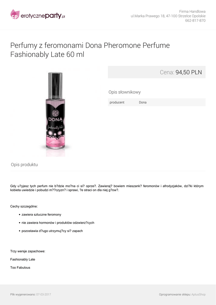 Firma Handlowa ul.Marka Prawego 18, 47-100 Strzelce Opolskie 662-817-870 Perfumy z feromonami Dona Pheromone Perfume Fashionably Late 60 ml Cena: 94,50 PLN Opis słownikowy producent Dona Opis produktu Gdy u?yjesz tych perfum nie b?dzie mo?na ci si? oprze?. Zawieraj? bowiem mieszank? feromonów i afrodyzjaków, dzi?ki którym kobieta uwiedzie i pobudzi m??czyzn? i sprawi, ?e straci on dla niej g?ow?. Cechy szczególne: zawiera sztuczne feromony nie zawiera hormonów i produktów odzwierz?cych pozostawia d?ugo utrzymuj?cy si? zapach Trzy wersje zapachowe: Fashionably Late Too Fabulous Plik wygenerowano: 07-03-2017 Oprogramowanie sklepu: AptusShop Firma Handlowa ul.Marka Prawego 18, 47-100 Strzelce Opolskie 662-817-870 After Midnight Plik wygenerowano: 07-03-2017 Powered by TCPDF (www.tcpdf.org) Oprogramowanie sklepu: AptusShop