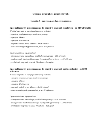 Cennik produkcji muzycznych: Cennik A - ceny za pojedyncze nagrania Spot reklamowy przeznaczony do emisji w stacjach lokalnych - od 350 zł/brutto W skład nagrania w wersji podstawowej wchodzi: - wynajem profesjonalnego studia muzycznego - wynajem lektora - wynajem dźwiękowca - nagranie wokali przez lektora – do 30 sekund - mix i mastering całego materiału przez dźwiękowca Opcje dodatkowe (opcjonalnie): - skomponowanie autorskiego podkładu muzycznego – 150 zł/brutto - zredagowanie tekstu reklamowego (wynajem Copywritera) – 150 zł/brutto - przdłużenie nagrania o każde 10 sekund – bez opłat Spot reklamowy przeznaczony do emisji w stacjach ogólnopolskich - od 500 zł/brutto W skład nagrania w wersji podstawowej wchodzi: - wynajem profesjonalnego studia muzycznego - wynajem lektora - wynajem dźwiękowca - nagranie wokali przez lektora – do 30 sekund - mix i mastering całego materiału przez dźwiękowca Opcje dodatkowe (opcjonalnie): - skomponowanie autorskiego podkładu muzycznego – 150 zł/brutto - zredagowanie tekstu reklamowego (wynajem Copywritera) – 150 zł/brutto - przdłużenie nagrania o każde 10 sekund – bez opłat Spot reklamowy przeznaczony do emisji w centrach handlowych lub na stronie www - od 350 zł/brutto W skład nagrania w wersji podstawowej wchodzi: - wynajem profesjonalnego studia muzycznego - wynajem lektora - wynajem dźwiękowca - nagranie wokali przez lektora – do 30 sekund - mix i mastering całego materiału przez dźwiękowca Opcje dodatkowe (opcjonalnie): - skomponowanie autorskiego podkładu muzycznego – 150 zł/brutto - zredagowanie tekstu reklamowego (wynajem Copywritera) – 150 zł/brutto - przdłużenie nagrania o każde 10 sekund – bez opłat Piosenka reklamowa - od 1200 zł/brutto (autorki podkład muzyczny, napisanie tekstu piosenki, nagranie słów przez muzyka, mix i mastering całego materiału) Piosenka reklamowa + dowolny spot reklamowy (wersja podstawowa) - od 1700 zł/brutto (PROMOCJA)* (autorki podkład muzyczny, napisanie tekstu piosenki + zredagowanie tekstu reklamowego (wynajem Copywritera), nagranie słów przez muzyka i lektora, mix i mastering całego materiału) Nagrania dla centrali telefonicznych (IVR): nagranie - od 3 do 5 poziomów: 350zł/brutto W skład nagrania w wersji podstawowej wchodzi: - wynajem profesjonalnego studia muzycznego - wynajem lektora - wynajem dźwiękowca - nagranie wokali przez lektora - mix i mastering całego materiału przez dźwiękowca Opcje dodatkowe (opcjonalnie): - skomponowanie autorskiego podkładu muzycznego – 150 zł/brutto - redagowanie tekstu reklamowego (wynajem Copywritera) – 150 zł/brutto nagranie - od 5 do 7 poziomów: 450zł/brutto W skład nagrania w wersji podstawowej wchodzi: - wynajem profesjonalnego studia muzycznego - wynajem lektora - wynajem dźwiękowca - nagranie wokali przez lektora - mix i mastering całego materiału przez dźwiękowca Opcje dodatkowe (opcjonalnie): - skomponowanie autorskiego podkładu muzycznego – 150 zł/brutto - zredagowanie tekstu reklamowego (wynajem Copywritera) – 150 zł/brutto nagranie - od 7 do 9 poziomów: 550zł/brutto W skład nagrania w wersji podstawowej wchodzi: - wynajem profesjonalnego studia muzycznego - wynajem lektora - wynajem dźwiękowca - nagranie wokali przez lektora - mix i mastering całego materiału przez dźwiękowca Opcje dodatkowe (opcjonalnie): - skomponowanie autorskiego podkładu muzycznego – 150 zł/brutto - zredagowanie tekstu reklamowego (wynajem Copywritera) – 150 zł/brutto nagranie - od 9 w górę - 600zł/brutto W skład nagrania w wersji podstawowej wchodzi: - wynajem profesjonalnego studia muzycznego - wynajem lektora - wynajem dźwiękowca - nagranie wokali przez lektora - mix i mastering całego materiału przez dźwiękowca Opcje dodatkowe (opcjonalnie): - komponowanie autorskiego podkładu muzycznego – 150 zł/brutto - zredagowanie tekstu reklamowego (wynajem Copywritera) – 150 zł/brutto Inne usługi lektorskie - ustalenia indywidualne Cennik B - ceny za nagrania w pakietach - w pakietach taniej! Pakiet mini: Spot reklamowy przeznaczony do emisji w stacjach lokalnych + IVR od 3 do 5 poziomów: 800zł/brutto Pakiet standard: Spot reklamowy przeznaczony do emisji w stacjach lokalnych + IVR od 5 do 7 poziomów: 1000zł/brutto Pakiet max: Dowolny spot reklamowy + IVR dowolna ilość poziomów: 1200zł/brutto Pakiet vip: Dowolny spot reklamowy + IVR dowolna ilość poziomów + piosenka reklamowa: 1700zł/brutto + niespodzianka od firmy gratis (logo dźwiękowe)! (PROMOCJA)* Wszystkie nagrania wchodzące w skład pakietów realizowane są w wersji rozbudowanej (opcje dodatkowe). W skład nagrania w wersji rozbudowanej wchodzi: - wynajem profesjonalnego studia muzycznego - wynajem lektora - wynajem dźwiękowca - nagranie wokali przez lektora – do 30 sekund - mix i mastering całego materiału przez dźwiękowca - skomponowanie autorskiego podkładu muzycznego - zredagowanie tekstu reklamowego (wynajem Copywritera) - przdłużenie nagrania o każde 10 sekund *Promocje nie łączą się.