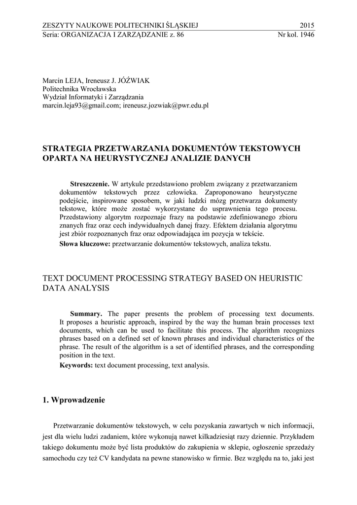 ZESZYTY NAUKOWE POLITECHNIKI ŚLĄSKIEJ Seria: ORGANIZACJA I ZARZĄDZANIE z. 86 2015 Nr kol. 1946 Marcin LEJA, Ireneusz J. JÓŹWIAK Politechnika Wrocławska Wydział Informatyki i Zarządzania [email protected]; [email protected] STRATEGIA PRZETWARZANIA DOKUMENTÓW TEKSTOWYCH OPARTA NA HEURYSTYCZNEJ ANALIZIE DANYCH Streszczenie. W artykule przedstawiono problem związany z przetwarzaniem dokumentów tekstowych przez człowieka. Zaproponowano heurystyczne podejście, inspirowane sposobem, w jaki ludzki mózg przetwarza dokumenty tekstowe, które może zostać wykorzystane do usprawnienia tego procesu. Przedstawiony algorytm rozpoznaje frazy na podstawie zdefiniowanego zbioru znanych fraz oraz cech indywidualnych danej frazy. Efektem działania algorytmu jest zbiór rozpoznanych fraz oraz odpowiadająca im pozycja w tekście. Słowa kluczowe: przetwarzanie dokumentów tekstowych, analiza tekstu. TEXT DOCUMENT PROCESSING STRATEGY BASED ON HEURISTIC DATA ANALYSIS Summary. The paper presents the problem of processing text documents. It proposes a heuristic approach, inspired by the way the human brain processes text documents, which can be used to facilitate this process. The algorithm recognizes phrases based on a defined set of known phrases and individual characteristics of the phrase. The result of the algorithm is a set of identified phrases, and the corresponding position in the text. Keywords: text document processing, text analysis. 1. Wprowadzenie Przetwarzanie dokumentów tekstowych, w celu pozyskania zawartych w nich informacji, jest dla wielu ludzi zadaniem, które wykonują nawet kilkadziesiąt razy dziennie. Przykładem takiego dokumentu może być lista produktów do zakupienia w sklepie, ogłoszenie sprzedaży samochodu czy też CV kandydata na pewne stanowisko w firmie. Bez względu na to, jaki jest 500 M. Leja, I. Jóźwiak to rodzaj dokumentu, istotna jest efektywność przetwarzania i jakość pozyskanych, w jego wyniku informacji. Dla człowieka, efektywność i jakość przetwarzania są ściśle związane z liczbą słów na sekundę, którą człowiek potrafi przeczytać oraz mocą zbioru rozumianych słów. W wielu przypadkach jednak przetwarzania wymaga tak duża liczba dokumentów, że przetworzenie ich, nawet bardzo szybko czytającej osobie, z dużą mocą zbioru rozumianych słów, zajęłoby zbyt wiele czasu. Oczywiście jednym z rozwiązań tego problemu jest zatrudnienie wielu osób. Praktyka pokazuje jednak, że zasoby ludzkie są ograniczone m.in. ze względu na ich wysoki koszt. Dodatkowo, wydajność oraz jakość przetwarzania tekstu, wykonywane przez człowieka, może ulegać pogorszeniu. Potwierdzenie tej tezy można znaleźć analizując wyniki eksperymentu przeprowadzonego przez Centralny Instytut Ochrony Pracy Państwowy Instytut Badawczy, które zostały przedstawione na poniższym rysunku. W ramach eksperymentu przeprowadzono test dodawania, gdzie na kryterium oceny składały się czas oraz poprawność rozwiązania zadania. Najkrótszy czas oznacza najlepszy wynik testu. Rys. 1. Zdolność do pracy umysłowej w ciągu doby Fig. 1. The capacity for mental work during the day Źródło: Centralny Instytut Ochrony Pracy Państwowy Instytut Badawczy. Zdolność do pracy umysłowej w ciągu doby. http://archiwum.ciop.pl/15705.html (10.09.2015). Niestety stwierdza się brak bezpośredniego rozwiązania przedstawionego problemu w postaci oprogramowania lub algorytmu. Z wyżej wymienionych powodów wynika cel niniejszego artykułu: usprawnienie procesu przetwarzania dokumentów tekstowych. W ramach poszukiwania rozwiązania podjęto próbę wykorzystania algorytmów wyszukiwania wzorca w tekście. Pomimo zadowalającej wydajności, podejście oparte na tych algorytmach jest obciążone ograniczeniem, co zostanie dokładnie przedstawione w kolejnym Strategia przetwarzania dokumentów tekstowych… 501 rozdziale. W odpowiedzi na to ograniczenie zaproponowano heurystyczny algorytm, który pozwala na rozpoznawanie fraz, wykorzystując dodatkowe informacje, zawarte w tekście. 2. Algorytmy wyszukiwania wzorca w tekście Jednym z możliwych rozwiązań problemu przetwarzania dokumentów tekstowych, przedstawionego w poprzednim rozdziale, jest wykorzystanie algorytmów wyszukiwania wzorca w tekście. Każda fraza z bazy wiedzy zawierającej tylko frazy dotyczące danego wycinka rzeczywistości zostaje potraktowana, jako wzorzec do wyszukania w danym dokumencie tekstowym. W przypadku odnalezienia frazy, która odpowiada zadanemu wzorcowi, zapisana zostaje informacja o rozpoznaniu danej frazy oraz jej pozycji w tekście. Wynikiem jest zbiór znanych fraz, które występują w dokumencie tekstowym oraz pozycja ich występowania, co umożliwi zaprezentowanie wyników użytkownikowi w graficzny sposób. Jest to istotne, ponieważ przetwarzanie dokumentów oparte na tym rozwiązaniu wymaga nadzoru człowieka, który pozostaje odpowiedzialny za ostateczny wynik, tzn. zapisanie informacji zawartych w dokumencie tekstowym w wymaganej formie reprezentacji danych. Nadzór użytkownika jest wymagany, ponieważ nie ma gwarancji, że znaleziona fraza występująca w pewnym kontekście, w dokumencie tekstowym ma dokładnie takie znaczenie, jakie jest nadawane w wyniku rozpoznania frazy. W przypadku błędnego rozpoznania frazy, użytkownik może poprawić błąd. Pomimo że proponowane podejście nadal wymaga pewnego nakładu pracy ze strony użytkownika, wydajność pracy przy użyciu tego rozwiązania ulega znacznej poprawie, co zostanie dokładniej przedstawione w dalszej części artykułu. Przeprowadzono przegląd kilku algorytmów, które zostały następnie zaimplementowane i wykorzystane do przetwarzania dokumentów tekstowych w sposób, który został przedstawiony powyżej. Ponieważ przegląd został wykonany jedynie w celu przetestowania podejścia opartego na algorytmie wyszukiwania wzorca w tekście, więc kryterium wyboru była wysoka dostępność ich specyfi