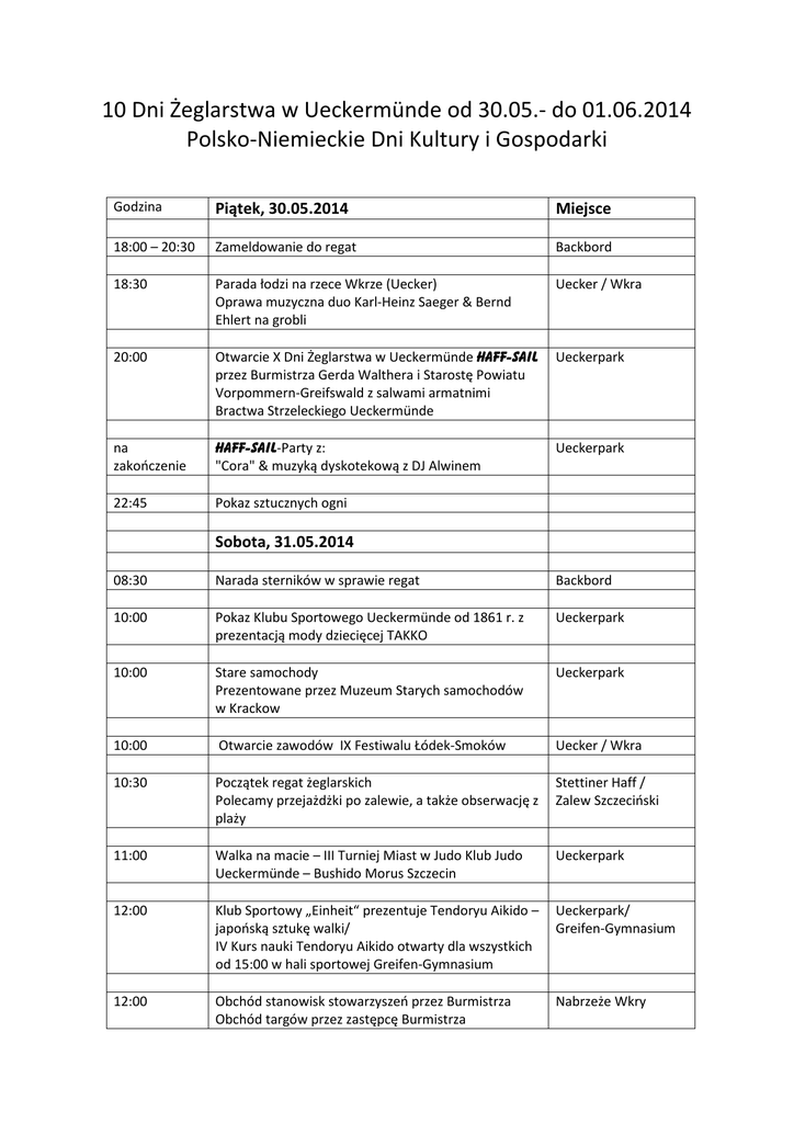 10 Dni Żeglarstwa w Ueckermünde od 30.05.- do 01.06.2014 Polsko-Niemieckie Dni Kultury i Gospodarki Godzina Piątek, 30.05.2014 Miejsce 18:00 – 20:30 Zameldowanie do regat Backbord 18:30 Parada łodzi na rzece Wkrze (Uecker) Oprawa muzyczna duo Karl-Heinz Saeger & Bernd Ehlert na grobli Uecker / Wkra 20:00 Otwarcie X Dni Żeglarstwa w Ueckermünde Haff-Sail przez Burmistrza Gerda Walthera i Starostę Powiatu Vorpommern-Greifswald z salwami armatnimi Bractwa Strzeleckiego Ueckermünde Ueckerpark na zakończenie Haff-Sail-Party z: "Cora" & muzyką dyskotekową z DJ Alwinem Ueckerpark 22:45 Pokaz sztucznych ogni Sobota, 31.05.2014 08:30 Narada sterników w sprawie regat Backbord 10:00 Pokaz Klubu Sportowego Ueckermünde od 1861 r. z prezentacją mody dziecięcej TAKKO Ueckerpark 10:00 Stare samochody Prezentowane przez Muzeum Starych samochodów w Krackow Ueckerpark 10:00 Otwarcie zawodów IX Festiwalu Łódek-Smoków Uecker / Wkra 10:30 Początek regat żeglarskich Polecamy przejażdżki po zalewie, a także obserwację z plaży Stettiner Haff / Zalew Szczeciński 11:00 Walka na macie – III Turniej Miast w Judo Klub Judo Ueckermünde – Bushido Morus Szczecin Ueckerpark 12:00 Klub Sportowy „Einheit“ prezentuje Tendoryu Aikido – japońską sztukę walki/ IV Kurs nauki Tendoryu Aikido otwarty dla wszystkich od 15:00 w hali sportowej Greifen-Gymnasium Ueckerpark/ Greifen-Gymnasium 12:00 Obchód stanowisk stowarzyszeń przez Burmistrza Obchód targów przez zastępcę Burmistrza Nabrzeże Wkry 12:45 Dziecięce i młodzieżowe grupy artystyczne z Polic, m. in. Grupa „Policzanie“ Ueckerpark 13:30 Biegi finałowe konkurencji łódek-smoków Uecker / Wkra 13:50 Losowanie AOK Nordost Ueckerpark 14:00 Oprowadzanie po mieście Informacja Turystyczna 14:00 Chóru Szantowy z Ahlbecku Ueckerpark 15:20 Występ Grupy Tanecznej Seniorów z Volkssolidarität Ueckermünde-Wschód Ueckerpark ok. 15:30 Zjazd Royal Stars Germany Oglądanie ok. 130 motorów Aleja Zamkowa ok. 15:45 18 Doroczny Zjazd Royal Stars Germany Przekazanie datków finansowych dla DGzrS Ueckermünde Ueckerpark 16:00 Teatrzyk Bajkowy z Eggesin Ueckerpark 17:00 Pokaz mody Juel Design Ueckerpark 17:40 Losowanie AOK Nordost Ueckerpark 18:00 Uhonorowanie zwycięzców regat żeglarskich, Festiwalu Łódek-Smoków Ueckerpark 20:00 Porto - najlepszy party-band z Neubrandenburga & muzyka dyskotekowa Ueckerpark 21:00 Kino na wodzie z SilaVega (stara grobla - Altes Bollwerk, start: w pobliżu przystani Młodzieżowego Jachtu Żaglowego „Gryf Ueckermünde” całodniowo Pokaz techniki policyjnej, marynarskiej, Policji Wodnej, Głównego Urzędu Celnego ze Stralsundu i Ochotniczej Straży Pożarnej, jak również wystawa BstU Neubrandenburg „25 lat pokojowej rewolucji” malowanie twarzy, malowanie na ulicy, oddział zabaw dla dzieci, prezentacje stowarzyszeń w Alei Zamkowej, amatorskie radiostacje na żywo na miejscu, przewóz dzieci samochodem straży pożarnej, balansowanie na linie, ogromne dmuchane zamki do skakania, dmuchane piłki wodne, ogromna ślizgawka, wycieczki ekspedycyjne z SilaVega „Doświadczyć Nabrzeże rzeki Uecker / Altes Bollwerk (ulica) / Aleja Zamkowa czegoś-spojrzenie z wody do wody”, jak również wycieczki młodzieżowym jachtem „Gryf Ueckermünde” Niedziela, 01.06.2014 Międzynarodowy Dzień Dziecka 10:30 Powiatowa Szkoła Muzyczna Uecker-Randow prezentuje brzmienia z całego świata przy kawie i cieście Ueckerpark 10:30 Uhr Stare samochody Prezentowane przez Muzeum Starych samochodów w Krackow Ueckerpark 11:00 – 15:00 Zabawy pirackie i jazda na kucyku Staromiejski Oddział Kultury Ueckerdamm / Nabrzeże Wkry 13:00 Animacja sceniczna AOK Nordost (Północny Wschód) Ueckerpark 13:30 Grupy artystyczne „PP 66” oraz „Impuls z Polic” Ueckerpark 14:15 Ćwiczenia Ochotniczej Straży Pożarnej z Ueckermünde rzeka – najszersze miejsce 15:00 Ćwiczenia Ochotniczej Straży Pożarnej z Ueckermünde i Ratowników Wodnych Niemieckiego Czerwonego Krzyża Ueckerpark 15:30 „Ueckermünde tańczy HAPPY“ z masowym startem balonów z pozdrowieniami na Dzień Dziecka z Kurortu Ueckermünde. Akcja Izby Przemysłowo-Rzemieślniczej w Ueckermünde oraz Klubu Taneczno -Wysiłkowego be free w Ueckermünde całodniowo Pokaz techniki marynarskiej, Policji Wodnej, Głównego Urzędu Celnego ze Stralsundu i Ochotniczej Straży Pożarnej, jak również malowanie twarzy, malowanie na ulicy, oddział zabaw dla dzieci, amatorskie radiostacje na żywo na miejscu, przewóz dzieci samochodem straży pożarnej, balansowanie na linie, ogromne dmuchane zamki do skakania, dmuchane piłki wodne, ogromna ślizgawka, wycieczki młodzieżowym jachtem „Gryf Ueckermünde” Zastrzega się zmiany w programie Ueckerpark Ueckerpark Nabrzeże rzeki Uecker / Altes Bollwerk (ulica) / Aleja Zamkowa