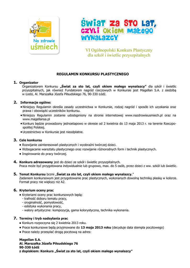 VI Ogólnopolski Konkurs Plastyczny dla szkół i świetlic przyszpitalnych REGULAMIN KONKURSU PLASTYCZNEGO 1. Organizator Organizatorem Konkursu „Świat za sto lat, czyli okiem małego wynalazcy” dla szkół i świetlic przyszpitalnych, jak również Fundatorem nagród rzeczowych w Konkursie jest Magellan S.A. z siedzibą w Łodzi, Al. Marszałka Józefa Piłsudskiego 76, 90-330 Łódź. 2. Informacje ogólne: Niniejszy Regulamin określa zasady uczestnictwa w Konkursie, rodzaj nagród i sposób ich uzyskania oraz prawa i obowiązki uczestników konkursu. Niniejszy Regulamin zostanie udostępniony na stronie internetowej www.nazdrowieusmiech.pl oraz na www.magellansa.pl Konkurs będzie prowadzony jednoetapowo w okresie od 2 kwietnia do 13 maja 2013 r. na terenie Rzeczpospolitej Polskiej. Uczestnictwo w Konkursie jest nieodpłatne. 3. Cele konkursu Rozwijanie zainteresowań plastycznych i wyobraźni twórczej dzieci. Wzbogacanie warsztatu plastycznego oraz rozwijanie różnorodnych form i technik plastycznych. Inspirowanie do pracy twórczej. 4. Konkurs adresowany jest do dzieci ze szkół i świetlic przyszpitalnych. Praca może być przygotowana indywidualnie lub grupowo, max. do 5 osób, przez dzieci z ww. szkół lub świetlic. 5. Temat Konkursu brzmi „Świat za sto lat, czyli okiem małego wynalazcy.” Zadaniem konkursowym jest przygotowanie prac plastycznych, wykonanych dowolną techniką płaską w kolorze. Format pracy nie większy niż A2. 6. Kryterium oceny prac Kryteriami oceny prac konkursowych będą: - trafność doboru tematu pracy, oryginalność, pomysłowość, estetyka wykonania pracy, walory artystyczne: kompozycja, gama kolorystyczna, technika wykonania. 7. Terminy i tryb nadsyłania prac Konkurs rozpoczyna się 2 kwietnia 2013 roku. Prace konkursowe będą przyjmowane do 13 maja 2013 roku (decyduje data stempla pocztowego) Prace należy przesyłać drogą pocztową na adres: Magellan S.A. Al. Marszałka Józefa Piłsudskiego 76 90-330 Łódź z dopiskiem: Konkurs „Świat za sto lat, czyli okiem małego wynalazcy” Każdy szpital może przesłać tylko jedną pracę, reprezentującą placówkę w Konkursie. Prace należy przesyłać wraz z „Kartą zgłoszenia do konkursu”, stanowiącą załącznik do Regulaminu. „Karta zgłoszenia do konkursu” www.magellansa.pl dostępna jest również na stronie www.nazdrowieusmiech.pl oraz na 8. Ogłoszenie wyników nastąpi 28 maja 2013 roku. Wyniki i data rozdania nagród zostaną opublikowane na stronie: www.nazdrowieusmiech.pl oraz na www.magellansa.pl 9. Nagrody W Konkursie zostanie przyznana nagroda główna oraz nagrody za 2 i 3 miejsce dla szkoły lub świetlicy przyszpitalnej. Nagrodami w Konkursie jest wyposażenie szkoły lub świetlicy przyszpitalnej o wartości odpowiednio: - nagroda główna za 1 miejsce o wartości 3.000 zł - nagroda za 2 miejsce o wartości 2.000 zł - nagroda za 3 miejsce o wartości 1.500 zł, tzw. „Nagroda Publiczności” - dwa wyróżnienia o wartości 700 zł Nagrody za 1 miejsce, 2 miejsce oraz dwa wyróżnienia zostaną przyznane decyzją Jury Konkursu plastycznego, w skład którego wchodzą przedstawiciele Magellan S.A. Nagroda za 3 miejsce – tzw. „Nagroda Publiczności” zostanie przyznana głosami użytkowników portalu społecznościowego Facebook, oddanymi na www.facebook.com/nazdrowieusmiech w terminie od 21 maja 2013 od godz. 00:01 do 27 maja 2013 do godz. 23.59. Nagroda zostanie przyznana placówce, której praca otrzyma najwięcej znaczników „Lubię to”. Decyzje Komisji Konkursowej są ostateczne. Zakres wyposażenia zostanie ustalony indywidualnie z przedstawicielami nagrodzonych placówek. Autorzy nagrodzonych prac otrzymają upominki, które zostaną przesłane na podany w zgłoszeniu adres. 10. Postanowienia końcowe Organizator zastrzega sobie prawo do publikacji prac biorących udział w Konkursie. Organizator przewiduje prezentację wybranych prac na wystawie oraz licytację wybranych prac, z której dochód zostanie przeznaczony na cele charytatywne. Organizator przewiduje również przygotowanie kalendarza na rok 2014 z wybranymi pracami konkursowymi. Organizatorzy nie zwracają nadesłanych na Konkurs prac oraz kosztów przesyłki. Prace niezgodne z Regulaminem lub oddane po terminie nie będą oceniane. Biorąc udział w Konkursie uczestnik akceptuje zasady niniejszego Regulaminu. Nadesłane na Konkurs prace przechodzą na własność Organizatora. Nadesłanie pracy konkursowej jest równoznaczne z wyrażeniem zgody na nieodpłatne wykorzystanie nadesłanej pracy w kalendarzu, o którym mowa powyżej. Uczestnicy Konkursu wyrażają zgodę na przetwarzanie swoich danych osobowych w zakresie niezbędnym dla potrzeb projektu. Dane osób uczestniczących w Konkursie będą wykorzystane zgodnie z ustawą z dnia 29 sierpnia 1997 r. o ochronie danych osobowych (Dz.U. 1997 nr 133 poz. 883), dla celów przeprowadzenia Konkursu. 11. W razie pytań i wątpliwości prosimy o kontakt: Agnieszka Brzezińska - tel. 42 272 32 32, kom. 605 053 409 e-mail: [email protected] Zapraszamy do udziału w Konkursie!