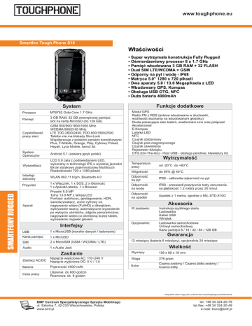 TOUGHPHONE www.toughphone.eu Smartfon Tough Phone S10 Właściwości • Super wytrzymała konstrukcja Fully Rugged • Ośmiordzeniowy procesor 8 x 1.7 GHz • Pamięć wbudowana 3 GB RAM + 32 FLASH • Dual SIM LTE/WCDMA + GSM • Odporny na pył i wodę - IP68 • Matryca 5.0" 1280 x 720 pikseli • Dwa aparaty 5.0 / 13.0 Megapiksela z LED • Wbudowany GPS, Kompas • Obsługa USB OTG, NFC • Duża bateria 4000mAh System Funkcje dodatkowe Procesor MT6752 Octa Core 1.7 GHz Pamięć 3 GB RAM, 32 GB wewnętrznej pamięci, slot na kartę MicroSD (do 128 GB) Moduł GPS Radio FM z RDS (antena wbudowana w słuchawki, możliwość słuchania na wbudowanym głośniku) Dioda pokazująca stan baterii, wiadomości sms oraz połączeń Akcelerometr E-Kompas Latarka LED NFC Czujnik zbliżeniowy Czujnik pola magnetycznego Czujnik oświetlenia Rejestrator dźwięku OTG (On-The-Go) - Host USB - obsługa pendrive, klawiatury itd. SMARTFONY RUGGED Częstotliwość pracy sieci GSM 850/900/1800/1900 MHz WCDMA 900/2100 MHz LTE TDD 2600/2400, FDD 800/1800/2500 Telefon nie ma blokady Sim-Lock Współpracuje z polskimi sieciami komórkowymi: Plus, T-Mobile, Orange, Play, Cyfrowy Polsat, Heyah, Lyca Mobile, Aero2 itd. System Operacyjny Android 5.1 (zawiera język polski) Wyświetlacz LCD 5.0 cala z podświetlaniem LED, wykonany w technologii IPS o wysokiej jasności Ekran dotykowy pojemnościowy Multitouch Rozdzielczość 720 x 1280 pikseli Temperatura pracy od -20°C do +60°C Wilgotność do 95% @ 40°C Interfejs sieciowy WLAN 802.11 b/g/n, Bluetooth 4.0 Odporność na pył IP68 - całkowita odporność na pył Przyciski 1 x Włącznik, 1 x SOS, 2 x Głośność 1 x Aparat/Latarka, 1 x Browser Odporność na wodę IP68 - przeszedł pozytywnie testy zanurzenia na głębokość 1,2 metra przez 30 minut Odporność na upadek Upadek z 1 metra, zgodnie z MIL-STD-810G Aparat Przedni 5.0 MP Tylny 13.0 MP z lampą LED Funkcje: autofocus, geotagowanie, HDR, samowyzwalacz, zoom cyfrowy x4, nagrywanie wideo (FullHD) z dźwiękiem, wykrywanie twarzy, automatyczne wyzwolenie po wykryciu uśmiechu, zdjęcia panoramiczne, nagrywanie wideo co określoną liczbę klatek, wyzwalanie migawki głosem Interfejsy USB 1 x MicroUSB (transfer danych / ładowanie) Karta pamięci 1 x MicroSD SIM 2 x MicroSIM (GSM / WCDMA / LTE) Audio 1 x Audio Jack Wytrzymałość Akcesoria W zestawie: Opcjonalnie: Instrukcja szybkiego startu Ładowarka Kabel USB Wkrętak Ładowarka samochodowa Uchwyt samochodowy Karta pamięci 8 / 16 / 32 / 64 / 128 GB Gwarancja 12 miesięcy (bateria 6 miesięcy), opcjonalnie 24 miesiące Wielkość Wymiary 159 x 86 x 19 mm Zasilacz AC/DC Napięcie wejściowe AC: 110~240 V Napięcie wyjściowe DC: 5 V / 1 A Waga 276 gram Bateria Pojemność 4000 mAh Kolor Czarno-srebrny / Czarno-żółto-srebrny / Czarno-żółty Czas pracy Uśpienie: do 600 godzin Rozmowa: ok. 8 godzin Zasilanie Wszystkie dane mogą ulec zmianie bez wcześniejszego powiadomienia BMF Centrum Specjalistycznego Sprzętu Mobilnego ul. Szkolna 7, 42-233 Wierzchowisko, Polska www.bmf.pl tel. +48 34 324-20-79 tel./fax: +48 34 324-20-49 e-mail: [email protected]