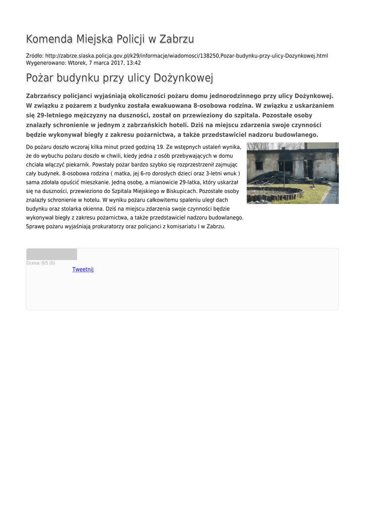 Komenda Miejska Policji w Zabrzu Źródło: http://zabrze.slaska.policja.gov.pl/k29/informacje/wiadomosci/138250,Pozar-budynku-przy-ulicy-Dozynkowej.html Wygenerowano: Wtorek, 7 marca 2017, 13:42 Pożar budynku przy ulicy Dożynkowej Zabrzańscy policjanci wyjaśniają okoliczności pożaru domu jednorodzinnego przy ulicy Dożynkowej. W związku z pożarem z budynku została ewakuowana 8-osobowa rodzina. W związku z uskarżaniem się 29-letniego mężczyzny na duszności, został on przewieziony do szpitala. Pozostałe osoby znalazły schronienie w jednym z zabrzańskich hoteli. Dziś na miejscu zdarzenia swoje czynności będzie wykonywał biegły z zakresu pożarnictwa, a także przedstawiciel nadzoru budowlanego. Do pożaru doszło wczoraj kilka minut przed godziną 19. Ze wstępnych ustaleń wynika, że do wybuchu pożaru doszło w chwili, kiedy jedna z osób przebywających w domu chciała włączyć piekarnik. Powstały pożar bardzo szybko się rozprzestrzenił zajmując cały budynek. 8-osobowa rodzina ( matka, jej 6-ro dorosłych dzieci oraz 3-letni wnuk ) sama zdołała opuścić mieszkanie. Jedną osobę, a mianowicie 29-latka, który uskarżał się na duszności, przewieziono do Szpitala Miejskiego w Biskupicach. Pozostałe osoby znalazły schronienie w hotelu. W wyniku pożaru całkowitemu spaleniu uległ dach budynku oraz stolarka okienna. Dziś na miejscu zdarzenia swoje czynności będzie wykonywał biegły z zakresu pożarnictwa, a także przedstawiciel nadzoru budowlanego. Sprawę pożaru wyjaśniają prokuratorzy oraz policjanci z komisariatu I w Zabrzu. Ocena: 0/5 (0) Tweetnij